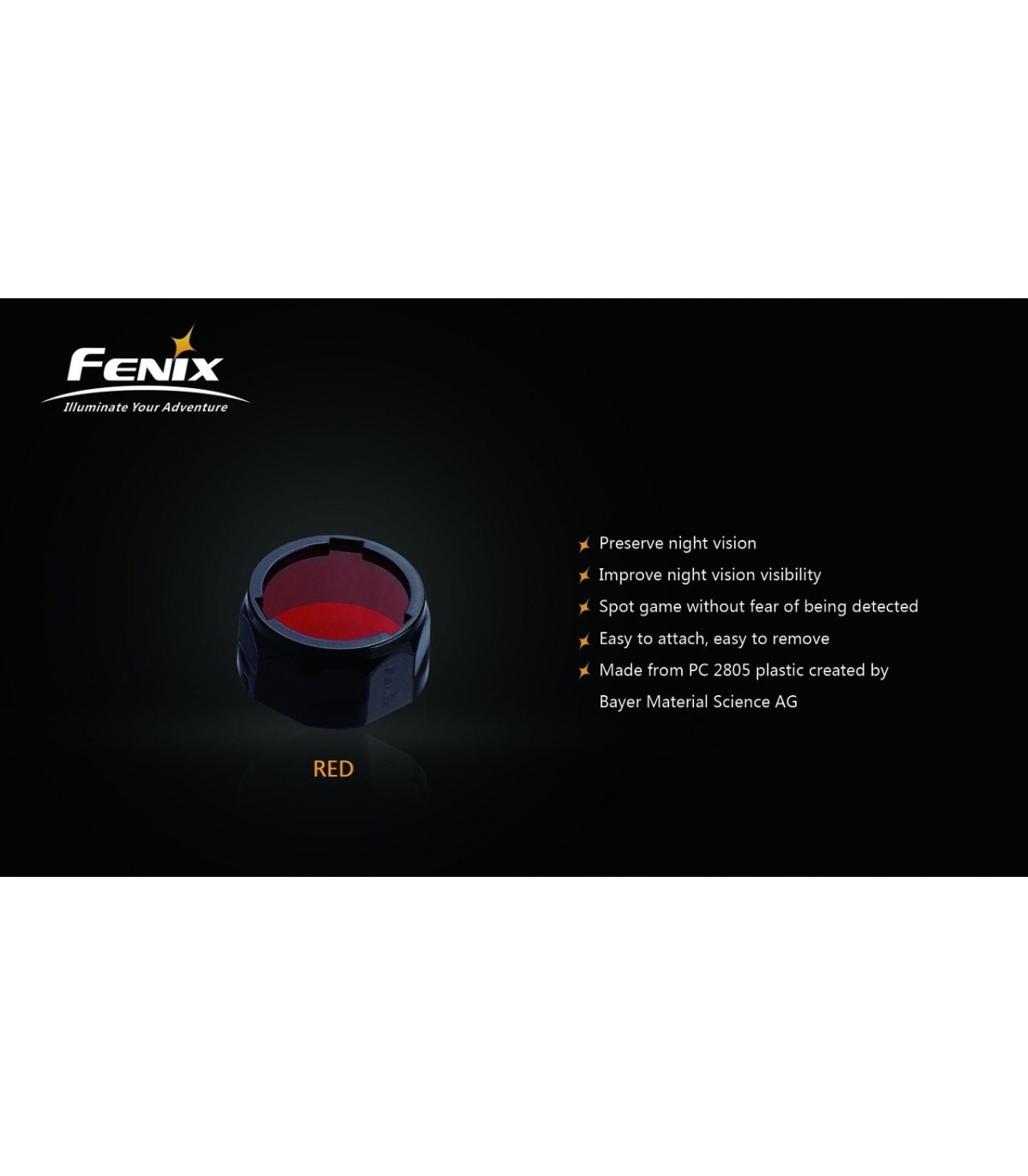Filtro rojo para las linternas fénix PD 35, PD 12 Y UC 40, que nos permite conseguir un haz rojo para emergencias.
