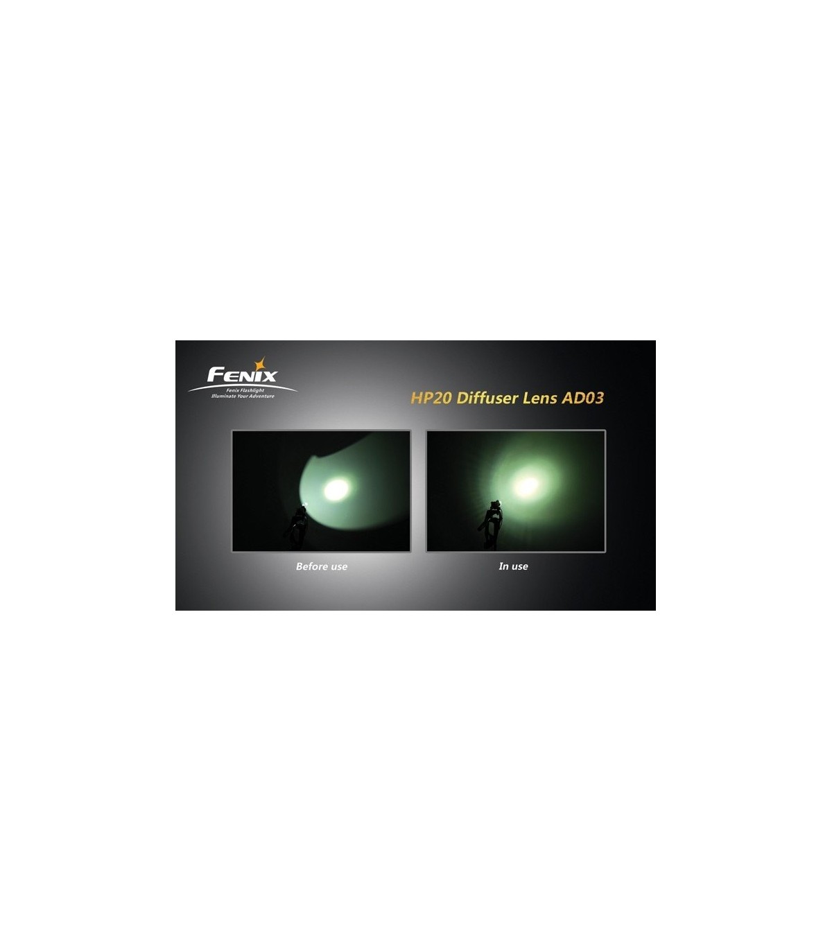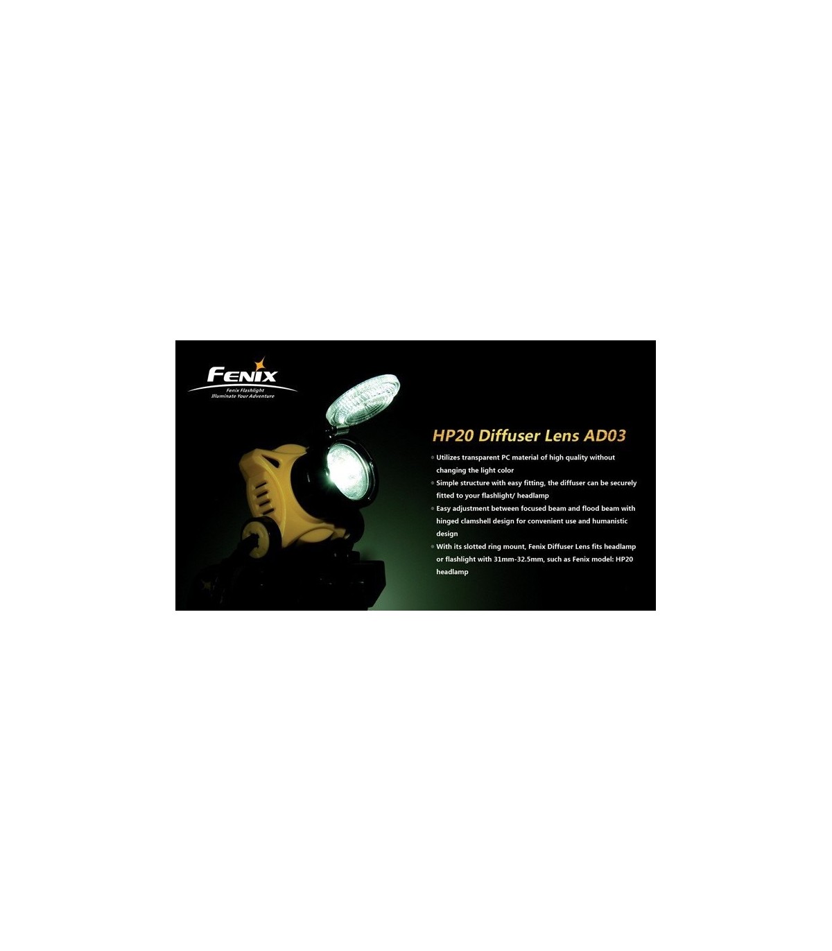 Lente difusora para el frontal fenix HP11, produciendo una luz difusa que facilmente podemos cambiar a normal. La lente difusora AD03 está especialmente diseñada para la HP11 de Fénix. El difusor produce un haz de luz difusa. * Utiliza material de policarbonato transparente de alta calidad. * Estructura simple con una instalación sencilla. * Fácil cambio en el ajuste para cambiar del haz de luz a la difusión de la luz. El diseño esta hecho con una bisagra para facilitar su uso. * Su anillo tiene ranuras para facilitar el montaje, el difusor se ajusta a frontales con un diámetro entre 31mm-32.5mm, como el modelo de Fénix HP11 LENTE DIFUSORA BLANCA PARA HP11 REF. AD03