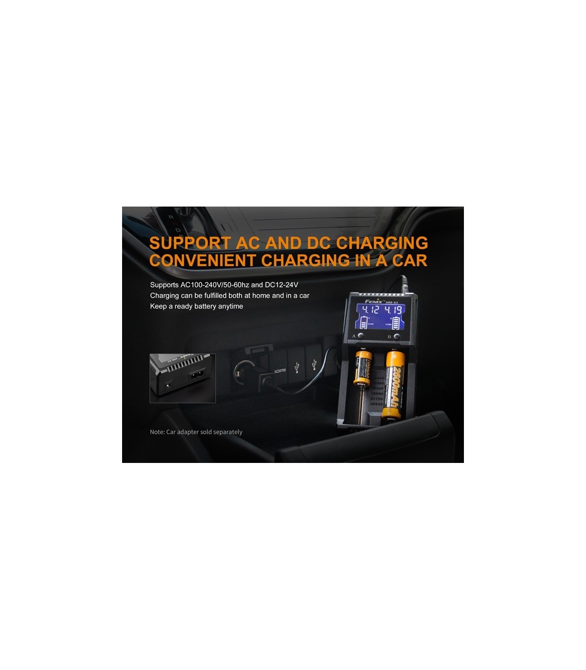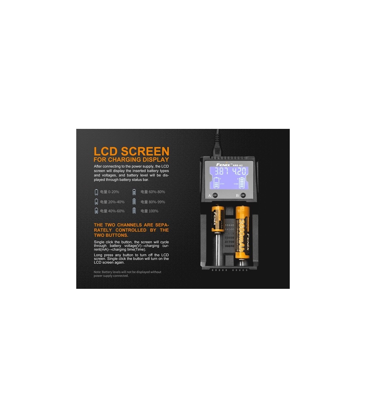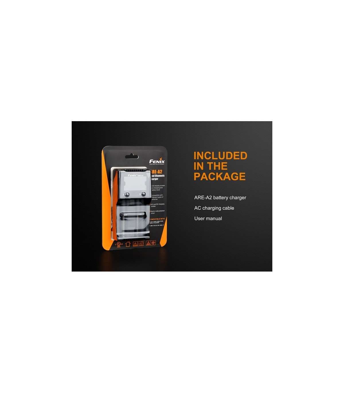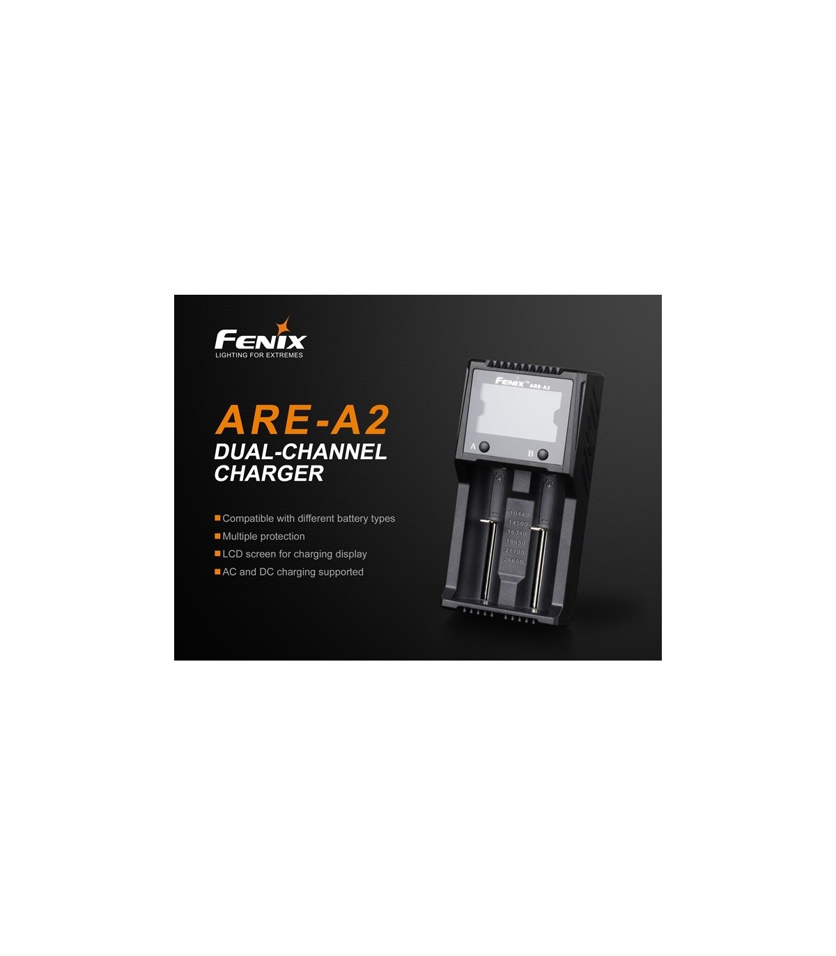 Fenix ARE-A2 es un cargador inteligente de doble canal, que es compatible con los tipos de baterías de iones de litio y Ni-MH / Ni-Cd. La pantalla LCD de alta definición muestra claramente el estado de carga y el nivel de batería. Además, el modo de carga del automóvil ofrece una alta comodidad para los usuarios.