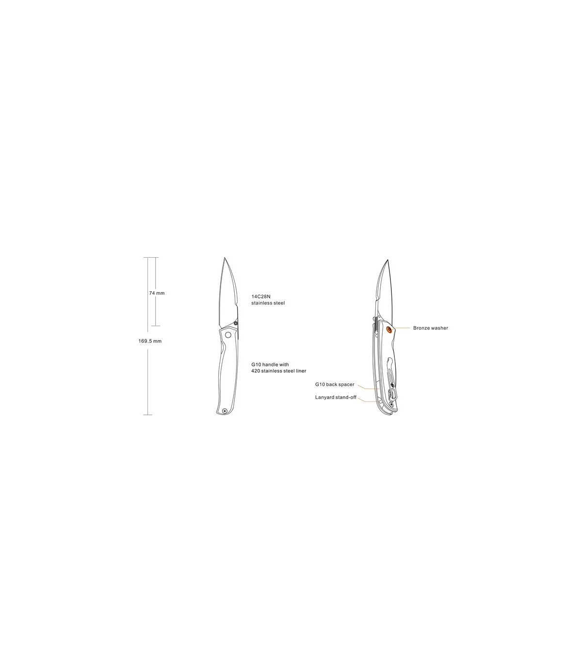 - Material del mango: G10 con revestimiento de acero inoxidable 420