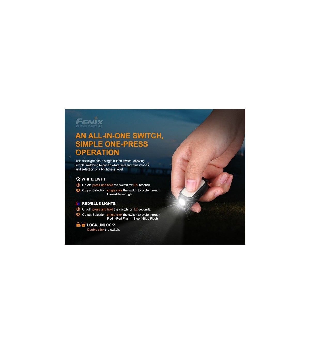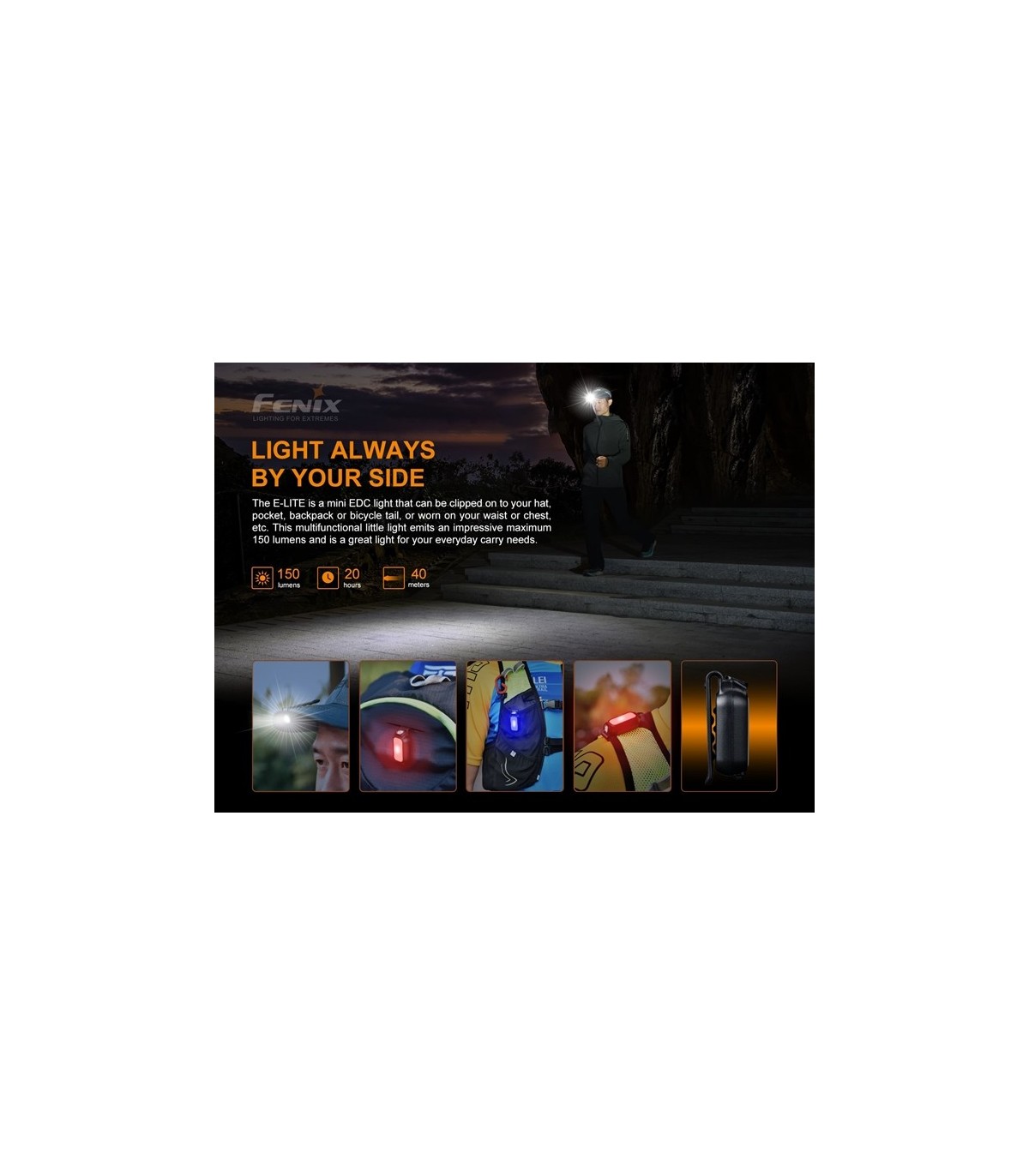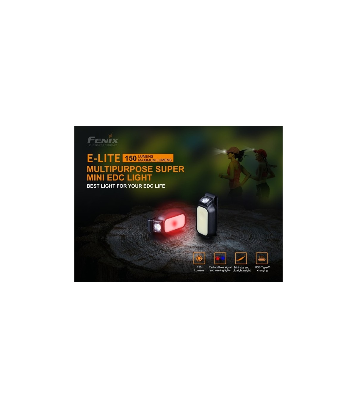 La Fenix E-LITE es una súper mini luz multiusos que se puede enganchar en una gorra, bolsillo, mochila o parte trasera de una bicicleta, también llevar en la cintura o en el pecho. Tiene dos luces: una en la parte superior que proporciona tres niveles de brillo de 5 a 150 lúmenes para las necesidades de iluminación diarias, y otra en la parte delantera que proporciona llamativas luces rojas y azules para la transmisión de señales en condiciones de emergencia. Además, está equipado con una interfaz de carga tipo C.