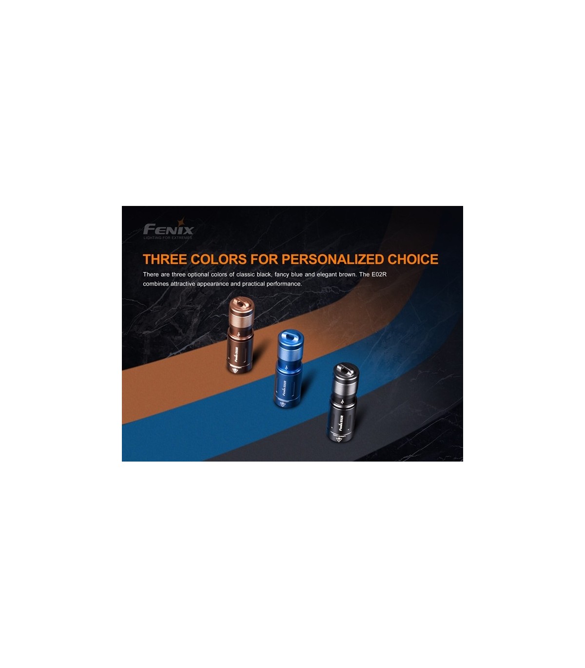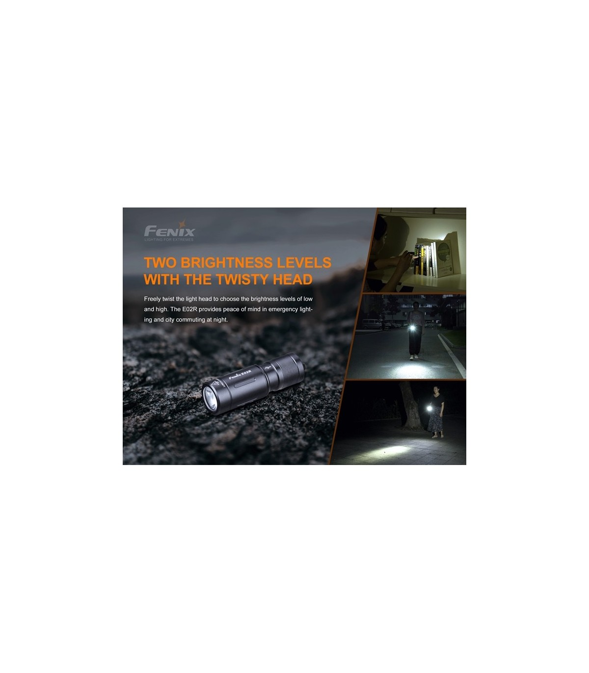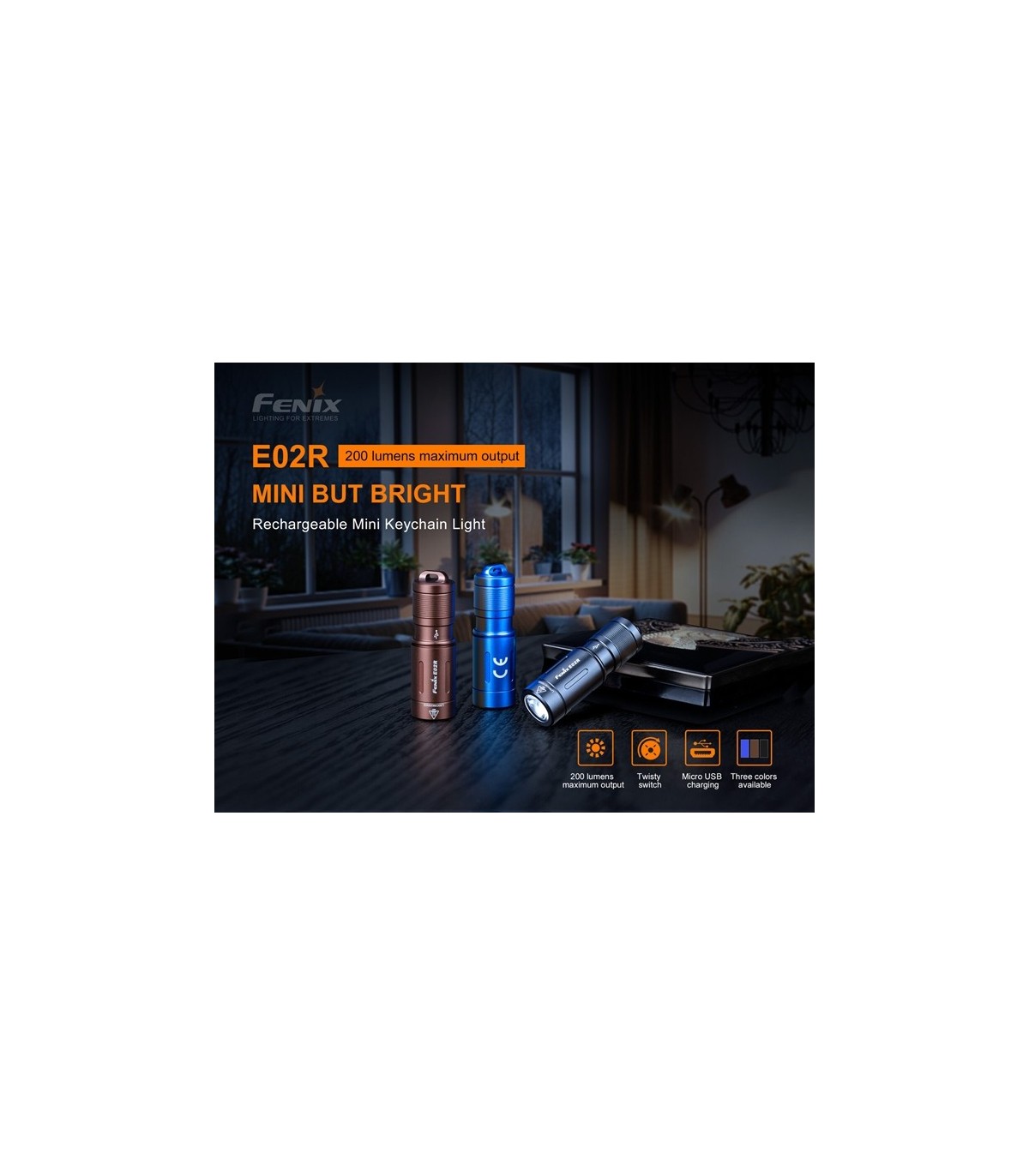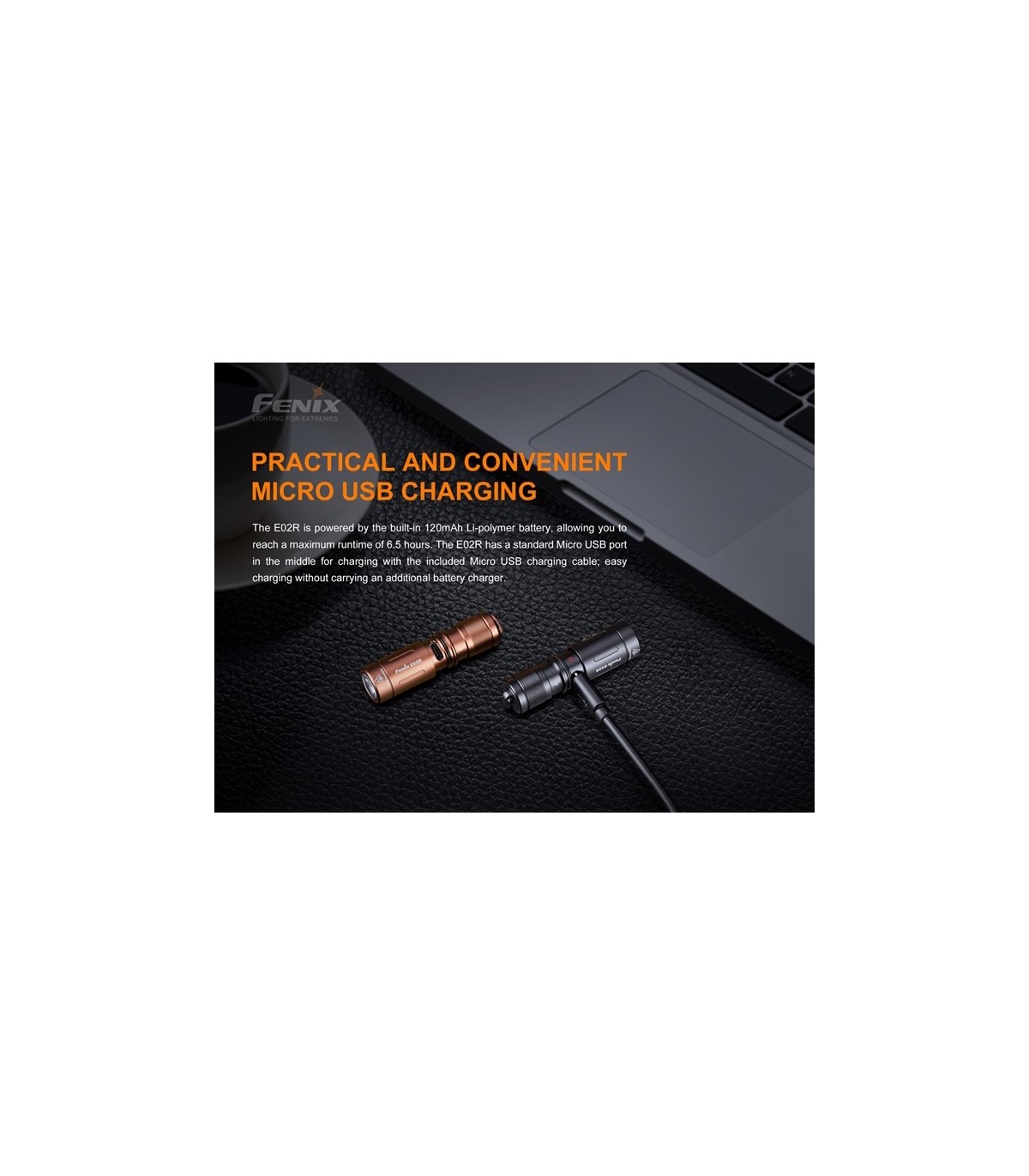 La Fenix E02R es una linterna llavero recargable USB. Esta mini linterna increíblemente pequeña funciona con la batería de polímero de litio recargable incorporada y ofrece un máximo de 200 lúmenes, arroja una distancia máxima del haz de 49 metros. Una cabeza giratoria activa los dos niveles de brillo. Gire la cabeza para acceder al puerto de carga Micro USB. Fabricada de aluminio de calidad, completamente a prueba de polvo e impermeable, esta linterna de llavero es perfecta para llevar todos los días.