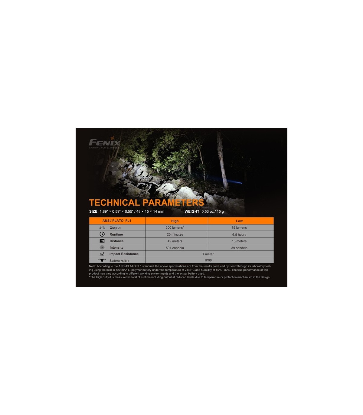 - Salida máxima de 200 lúmenes; 49 metros de distancia máxima del haz.