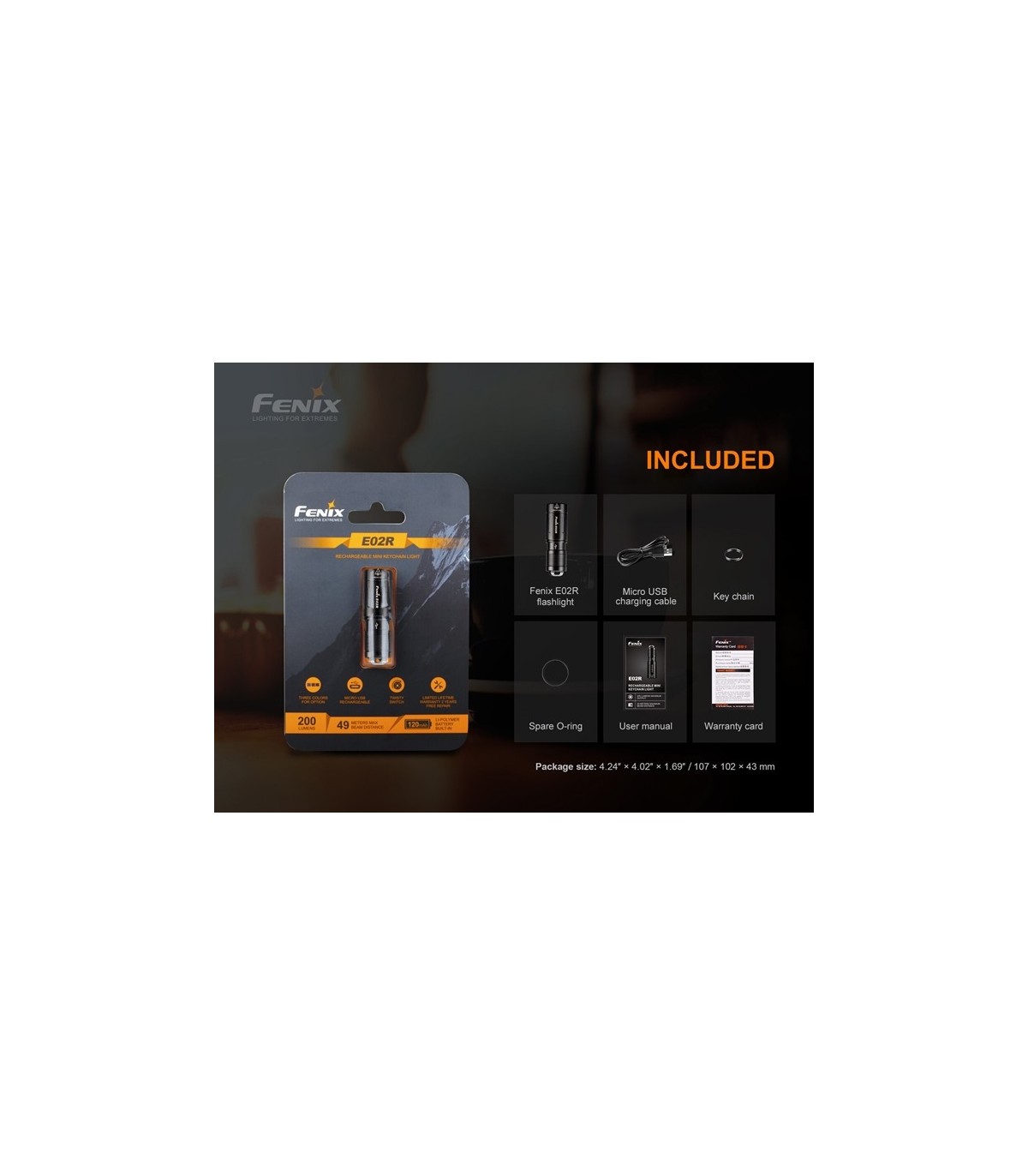 Incluye: Linterna E02R negra, Cable de carga, instrucciones, batería, O-ring, anillo metálico para llaves.