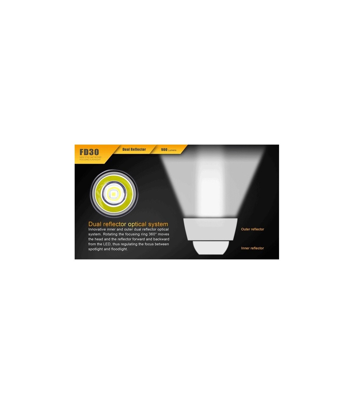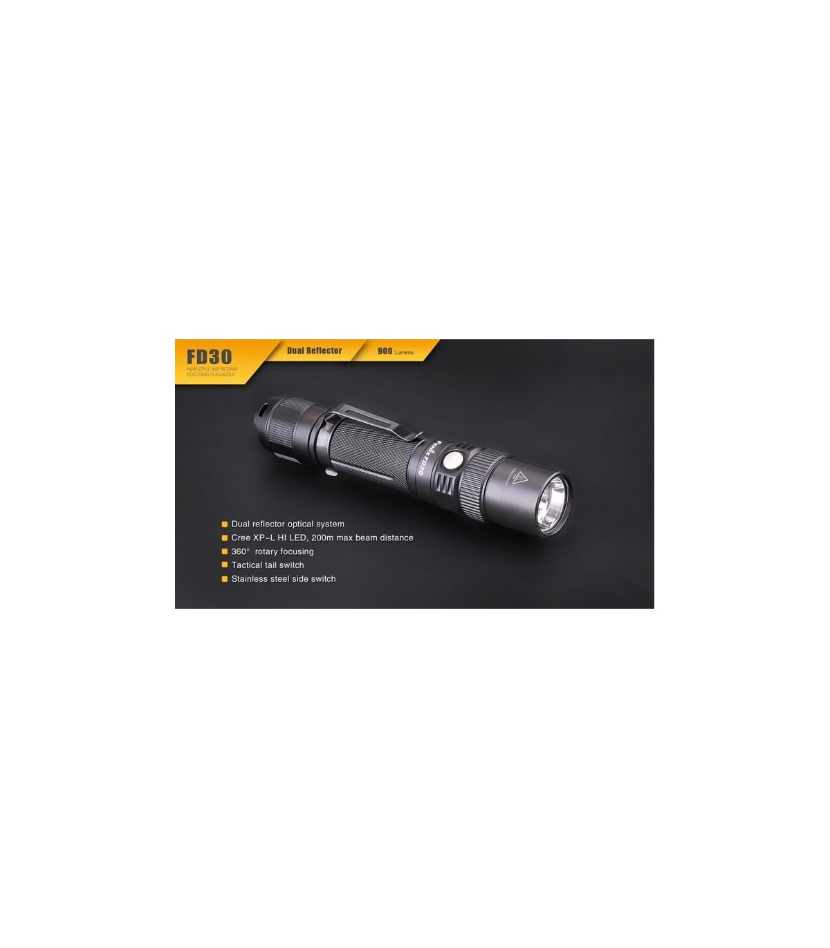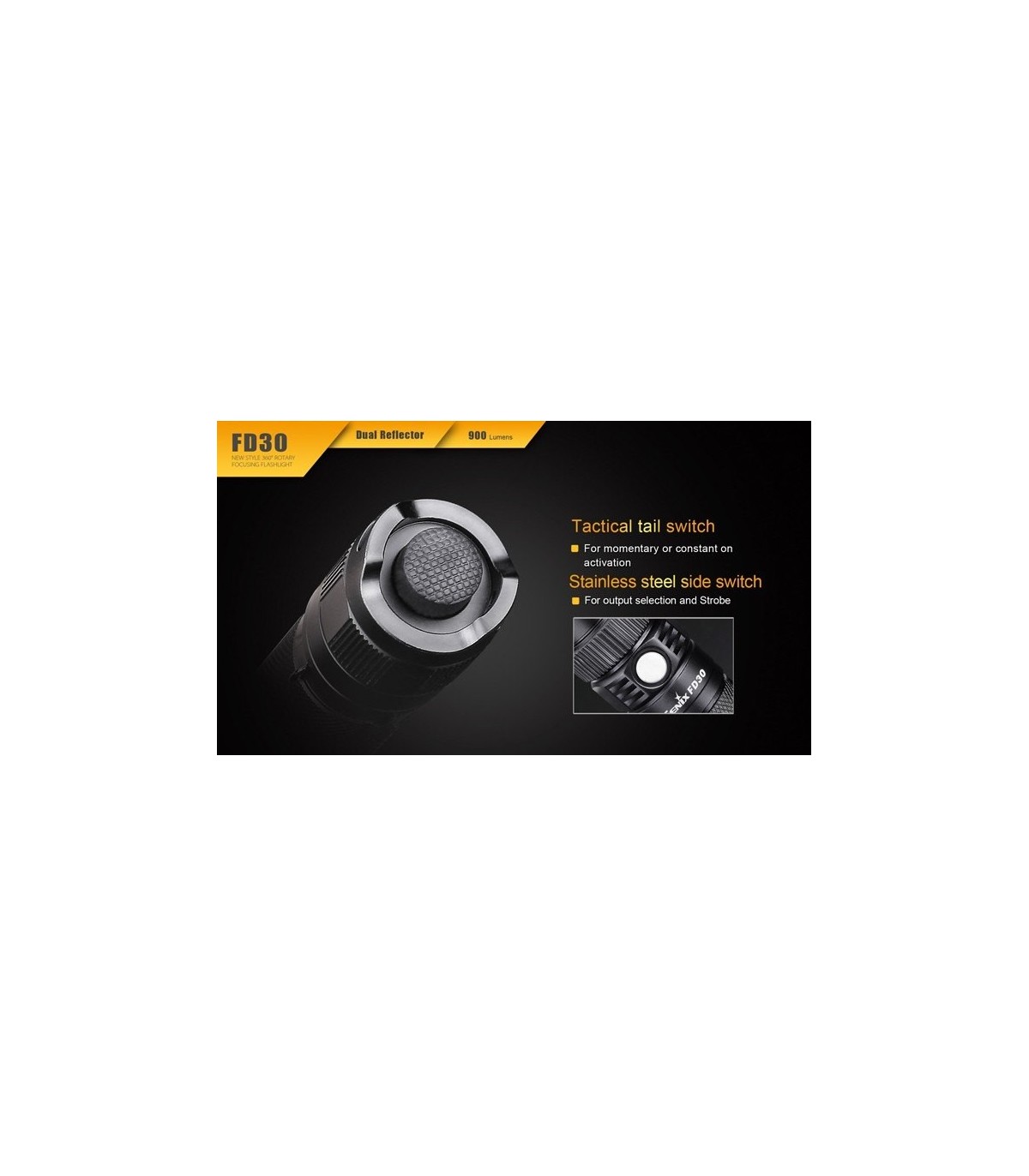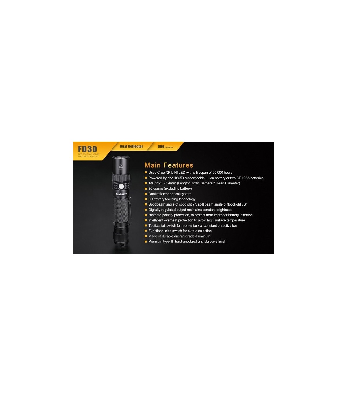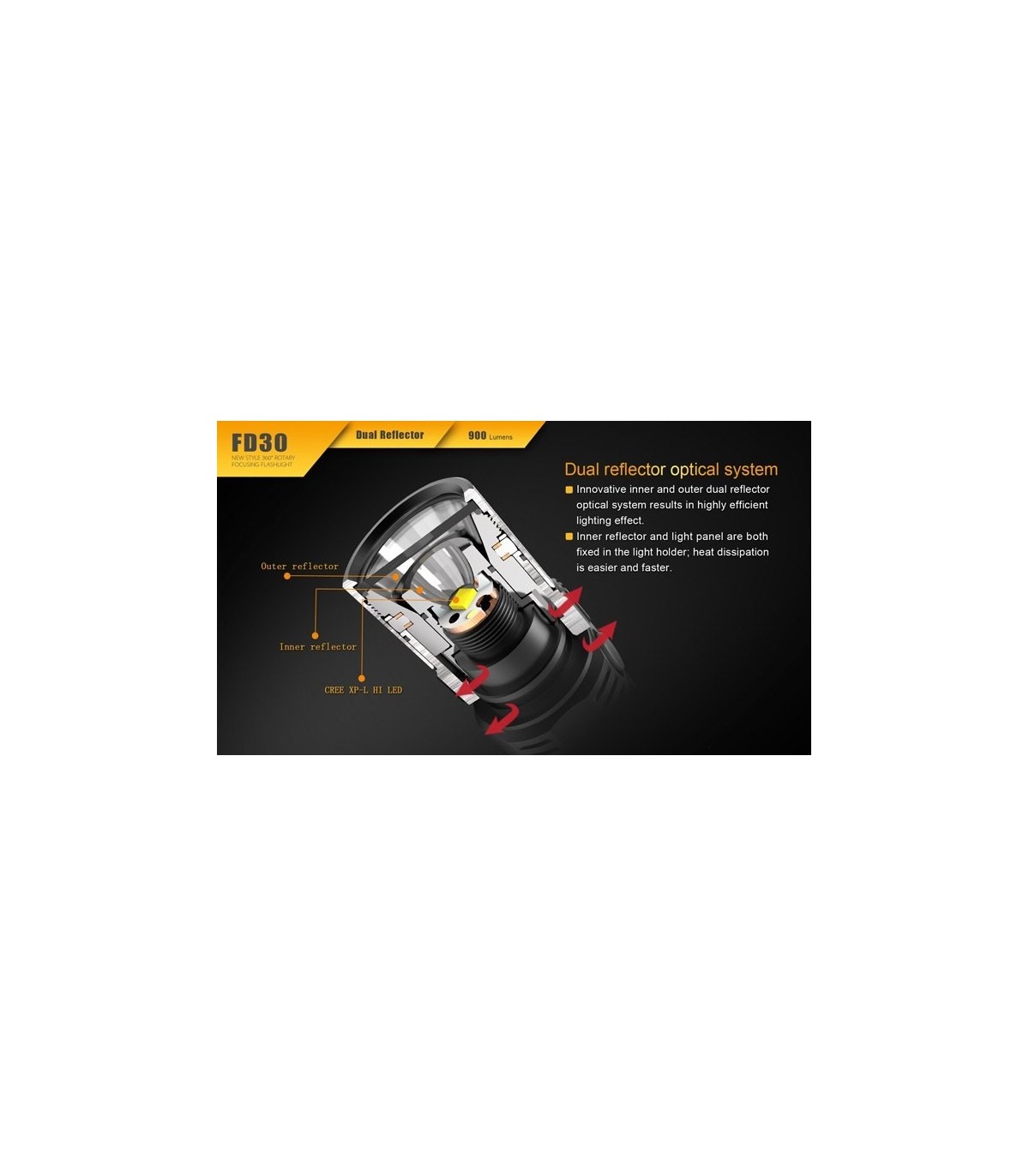 Nueva linterna focusable con rotación de 360 . La Fenix FD30 está equipada con un sistema innovador de doble reflector óptico diseñado por Fenix. Girando el anillo de enfoque este mueve el cabezal y el reflector hacia adelante y hacia atrás desde el LED, regulando así el enfoque entre la luz de inundación y la luz concentrada. Proporciona una salida máxima de 900 lúmenes y una distancia del haz de 200 metros. Tiene un interruptor de cola táctico y un interruptor lateral en él cabezal. Es compatible con las baterías 18650 de ion-litio recargables así como las baterías resistentes al frío CR123A. Todas estas características hacen que la FD30 destaque en las tareas policiales, búsqueda, acampada y fotografía.