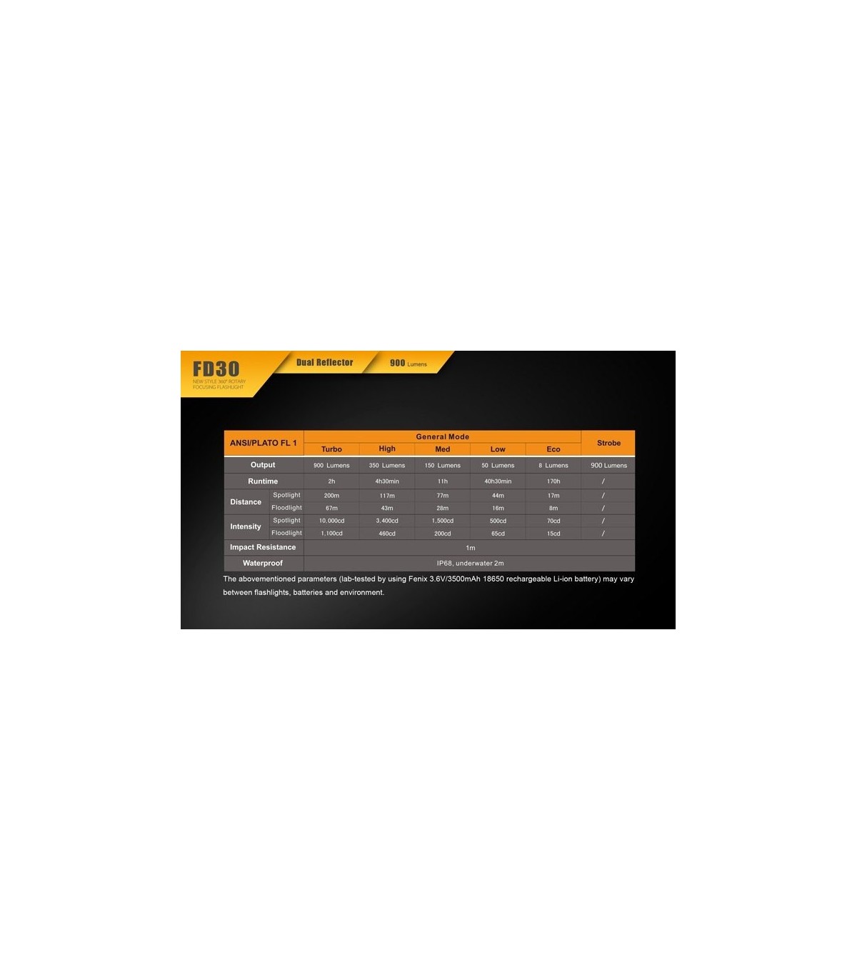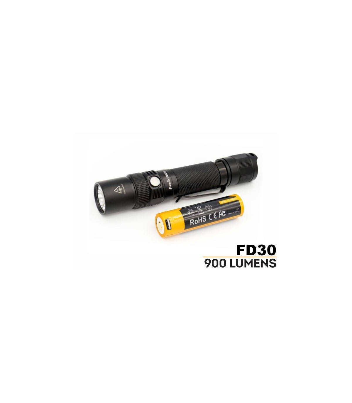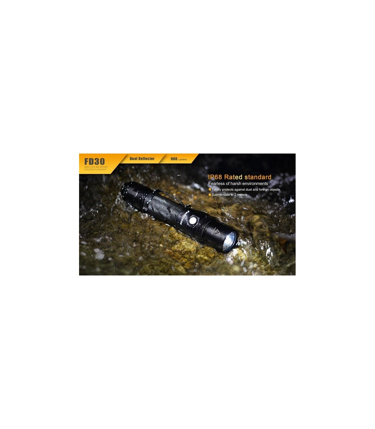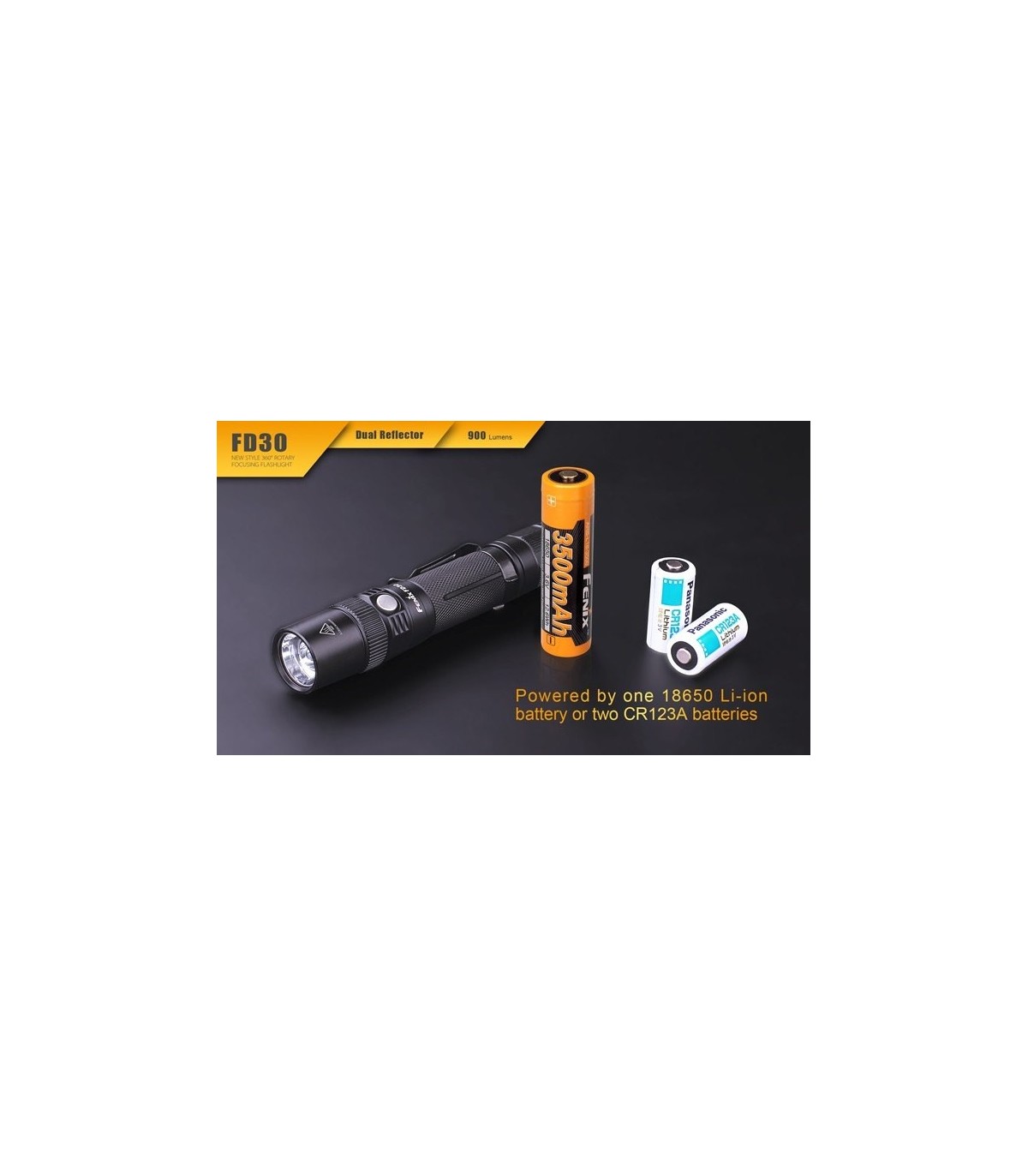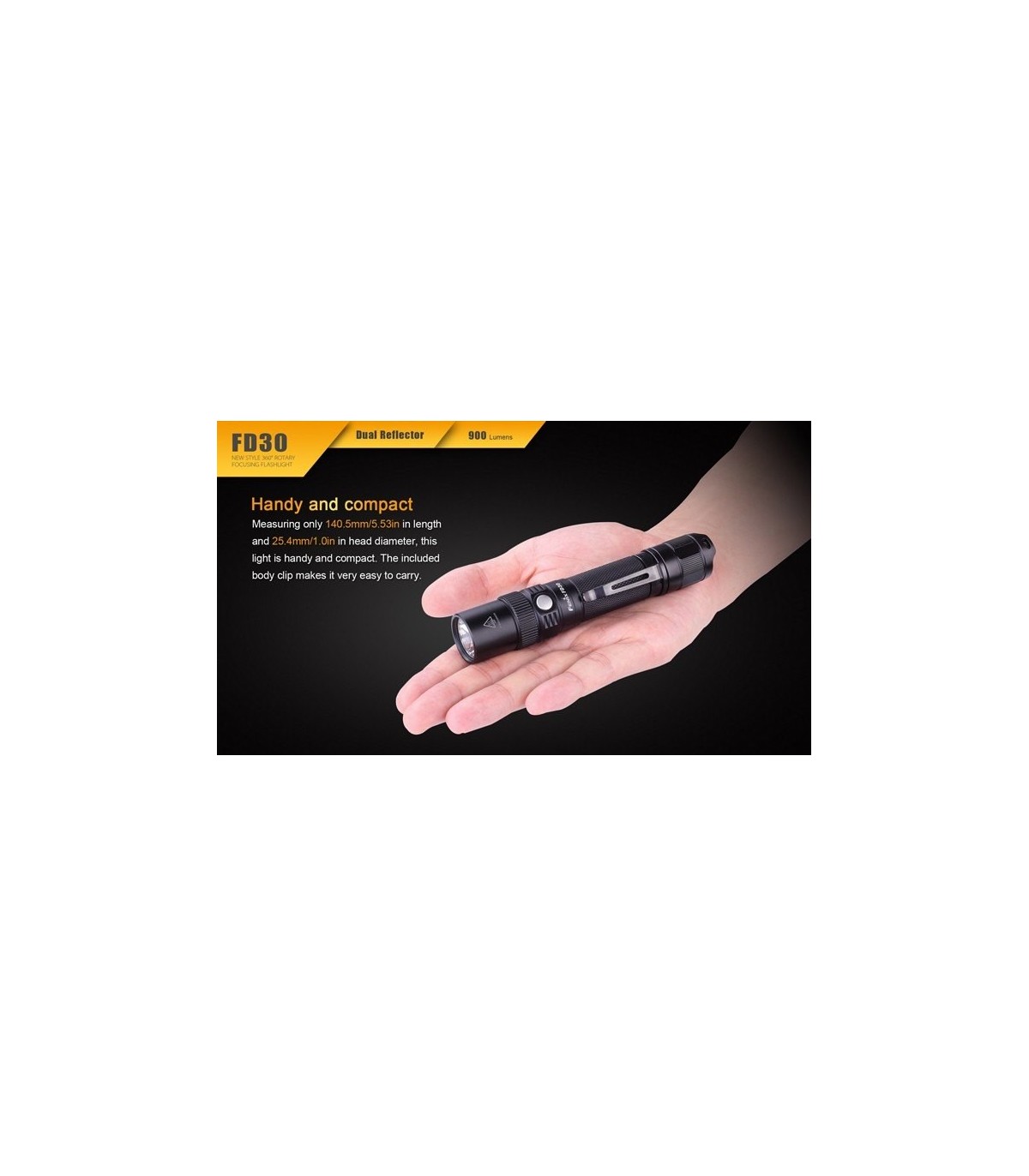 Nueva linterna focusable con rotación de 360 . La Fenix FD30 está equipada con un sistema innovador de doble reflector óptico diseñado por Fenix. Girando el anillo de enfoque este mueve el cabezal y el reflector hacia adelante y hacia atrás desde el LED, regulando así el enfoque entre la luz de inundación y la luz concentrada. Proporciona una salida máxima de 900 lúmenes y una distancia del haz de 200 metros. Tiene un interruptor de cola táctico y un interruptor lateral en él cabezal. Es compatible con las baterías 18650 de ion-litio recargables así como las baterías resistentes al frío CR123A. Todas estas características hacen que la FD30 destaque en las tareas policiales, búsqueda, acampada y fotografía.