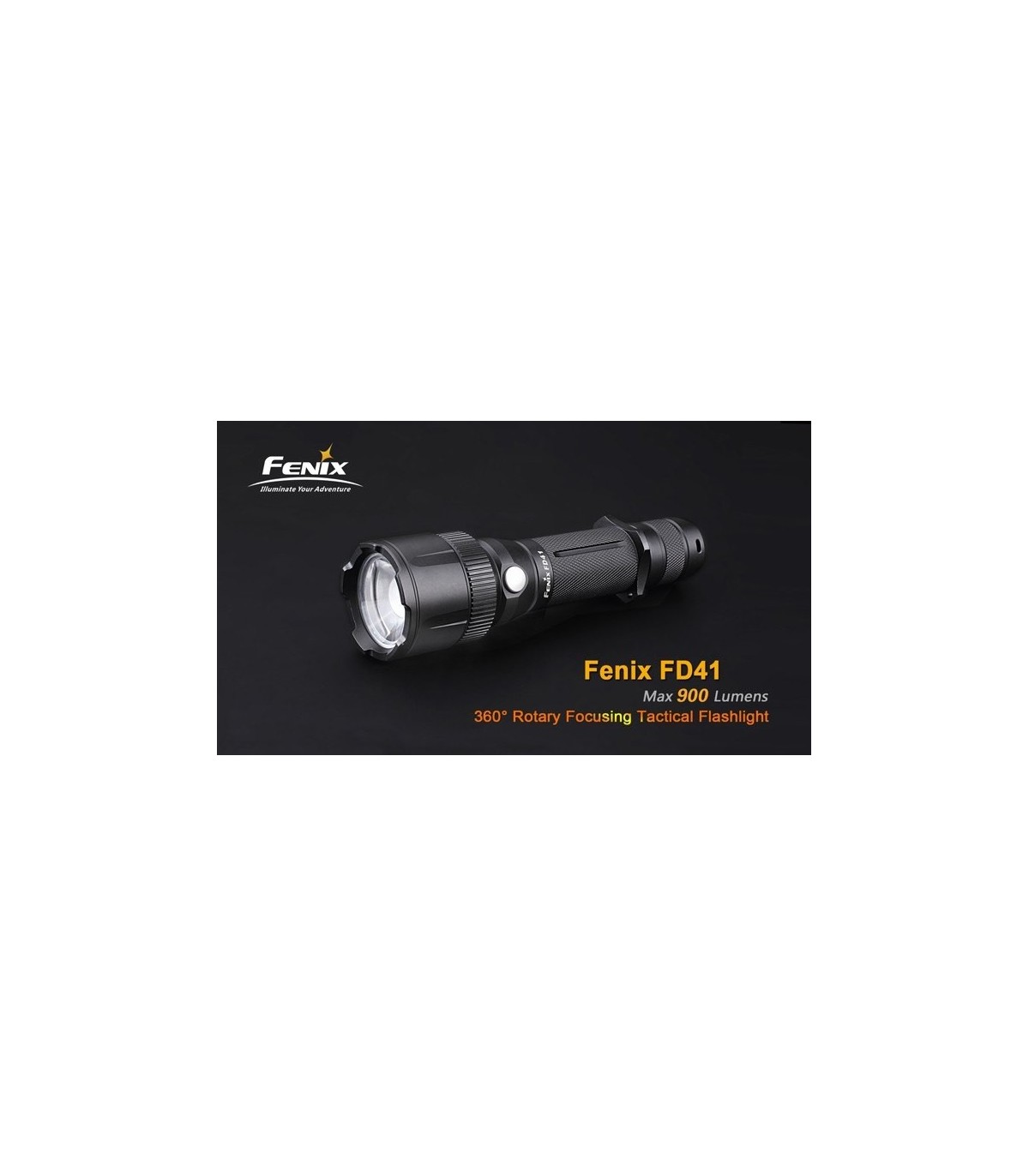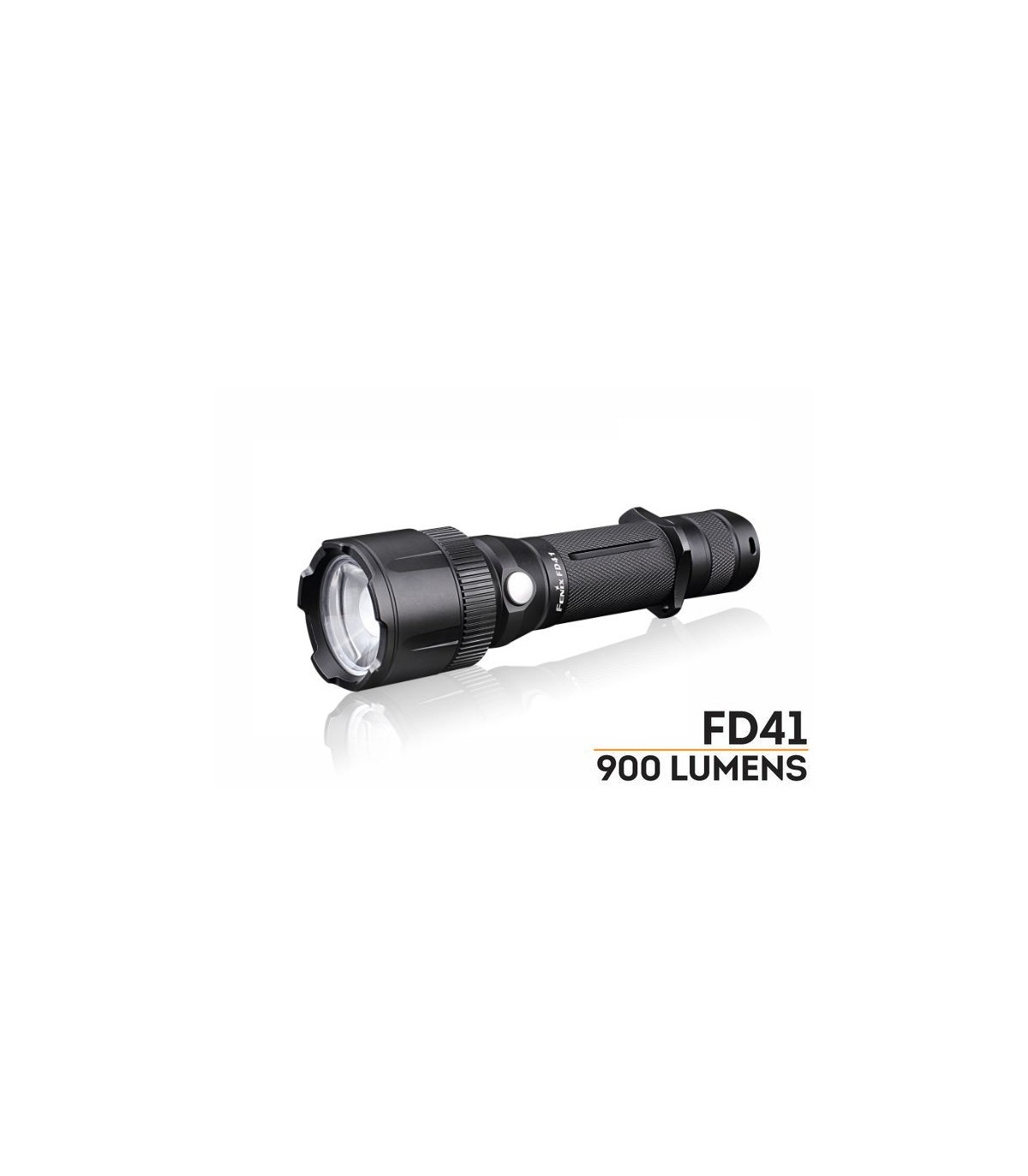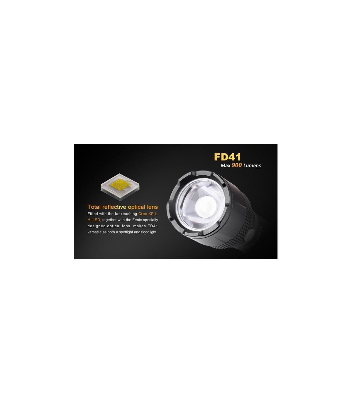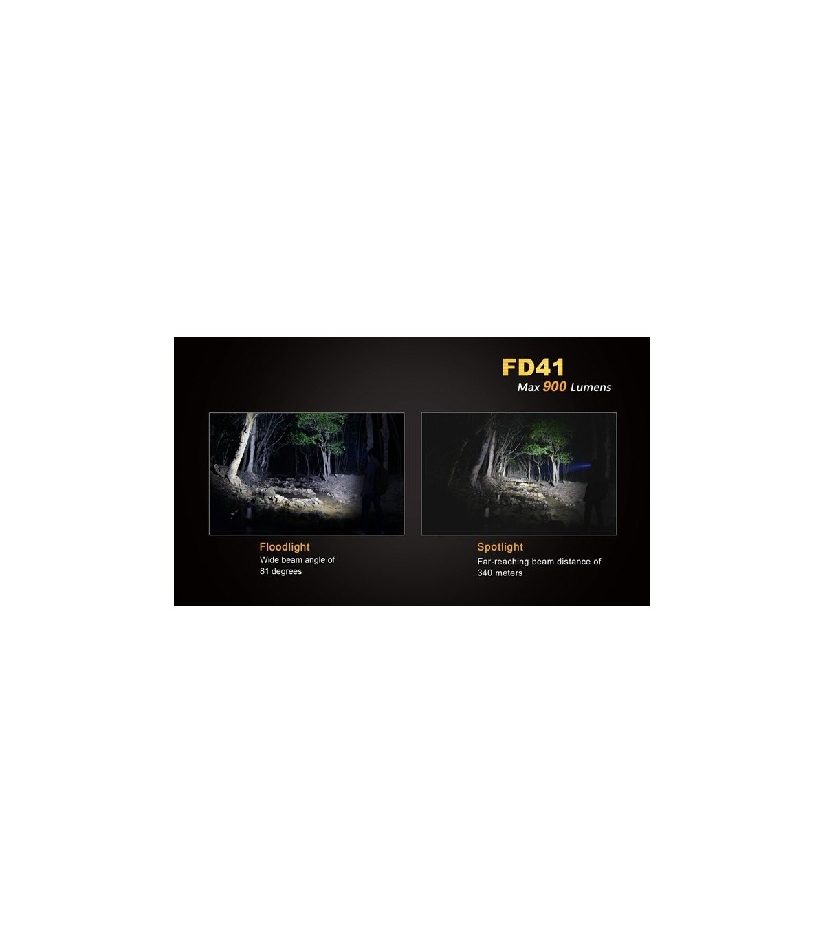 La linterna Fénix FD41 está equipada con una lente óptica con una capa reflectante completa. El anillo de enfoque gira y mueve el cabezal y la lente óptica hacia adelante y hacia atrás, regulando así el foco entre la luz de inundación y proyección. Ofrece una salida máxima de 900 lúmenes y la distancia del haz es de 340 metros. Tiene un interruptor de la cola más un interruptor lateral, es compatible con la batería de Ion-Litio 18650, así como la CR123A muy resistente al frío, todo ello hace que la FD41 se destaque en la caza, la búsqueda, el camping y la fotografía al aire libre.