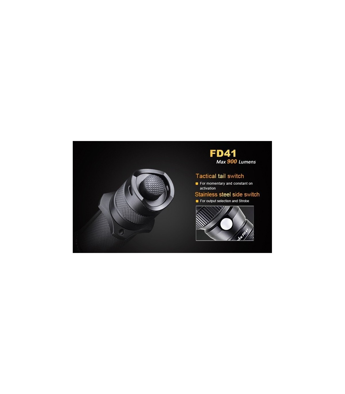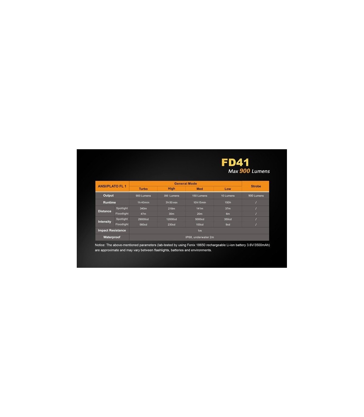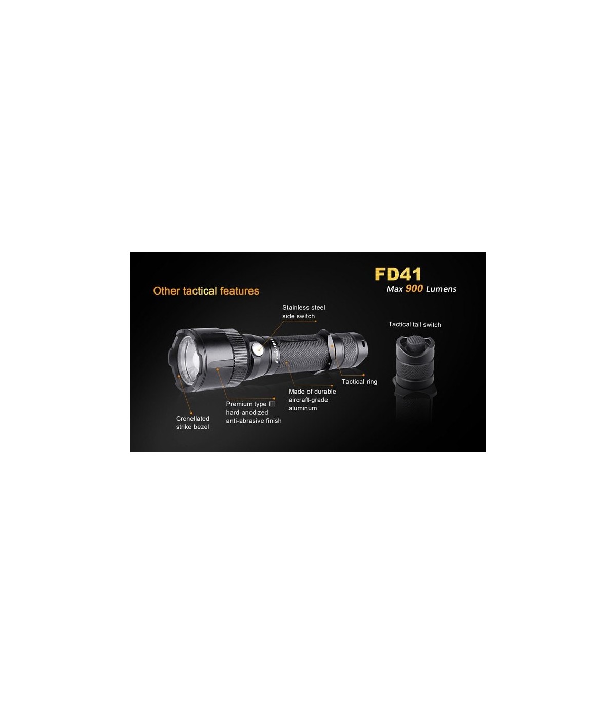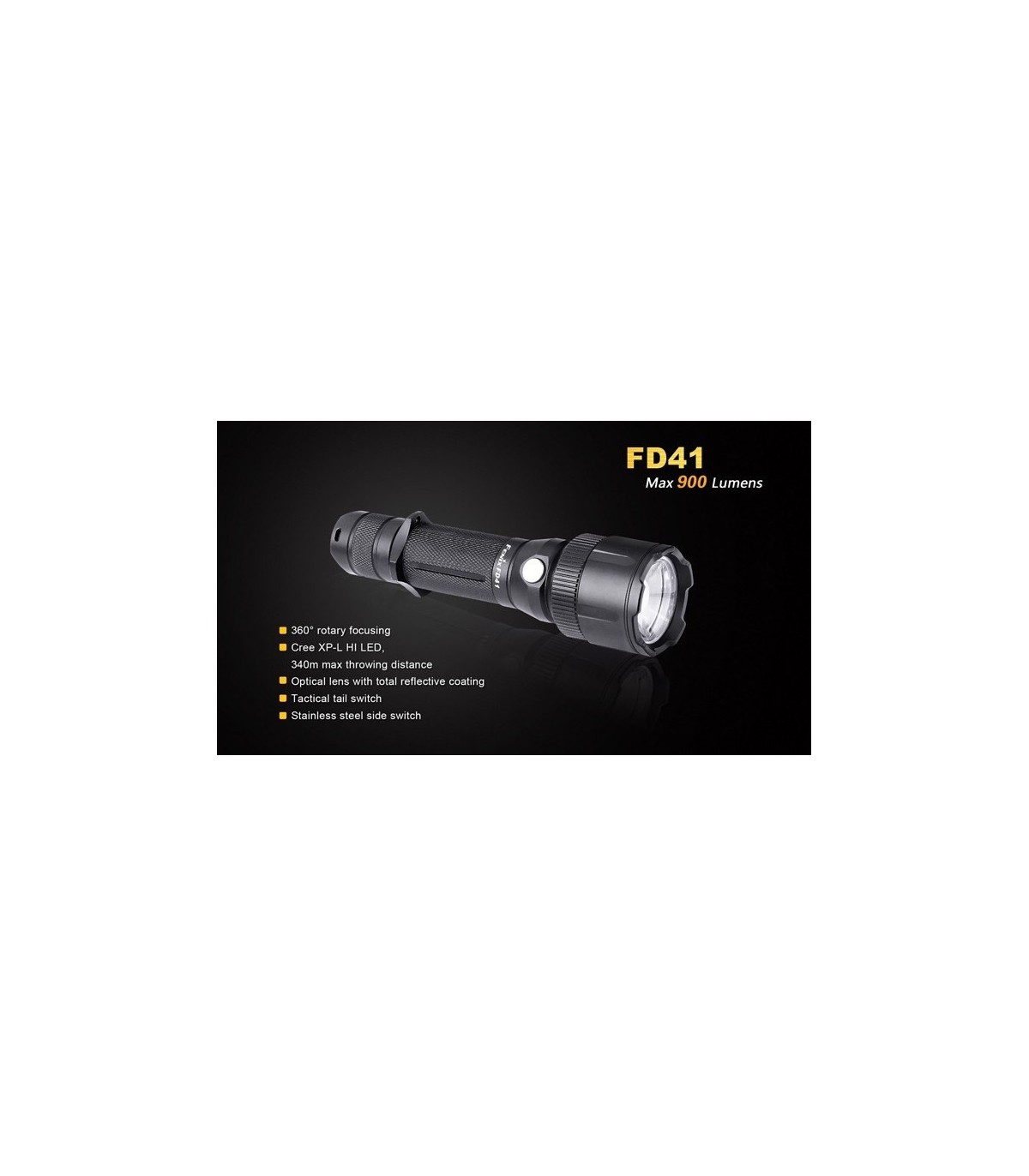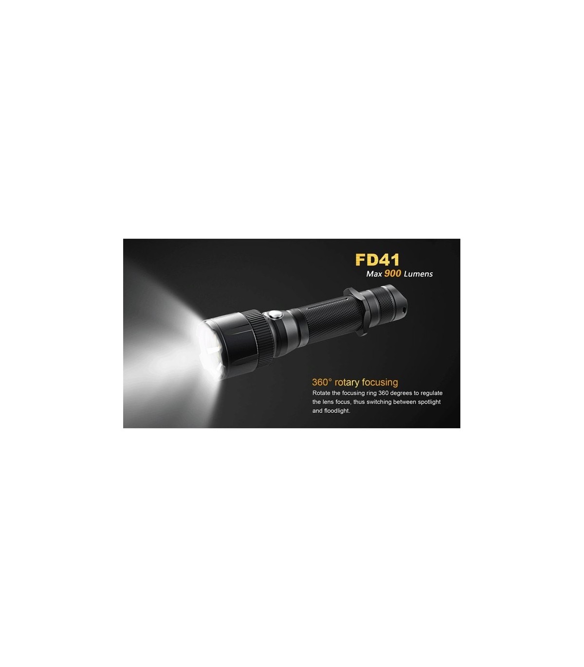 La linterna Fénix FD41 está equipada con una lente óptica con una capa reflectante completa. El anillo de enfoque gira y mueve el cabezal y la lente óptica hacia adelante y hacia atrás, regulando así el foco entre la luz de inundación y proyección. Ofrece una salida máxima de 900 lúmenes y la distancia del haz es de 340 metros. Tiene un interruptor de la cola más un interruptor lateral, es compatible con la batería de Ion-Litio 18650, así como la CR123A muy resistente al frío, todo ello hace que la FD41 se destaque en la caza, la búsqueda, el camping y la fotografía al aire libre.