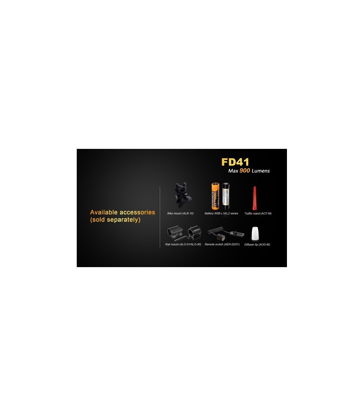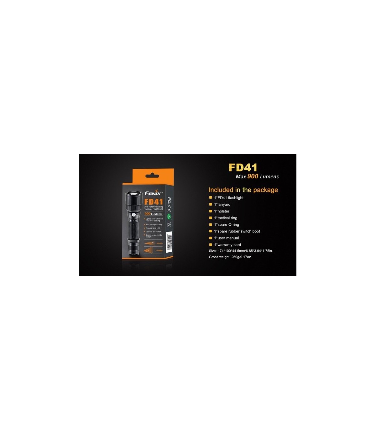 La FD41 incluye: La linterna, cordón para la muñeca, funda, garantía, manual de instrucciones, un pulsador de recambio, una junta O-ring de recambio, anillo táctico (se puede quitar y poner)