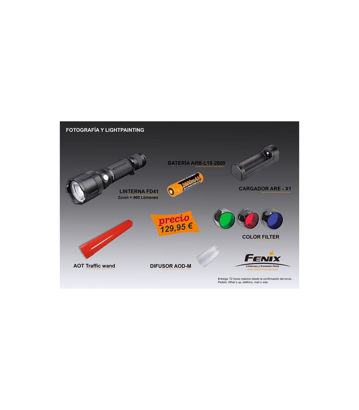 PackFD41: Linterna FD41 + batería ARB-L18-2600 + Cargador ARE-X1 + 3 filtros + Cono Rojo AOT-L + Difusor AOD-M