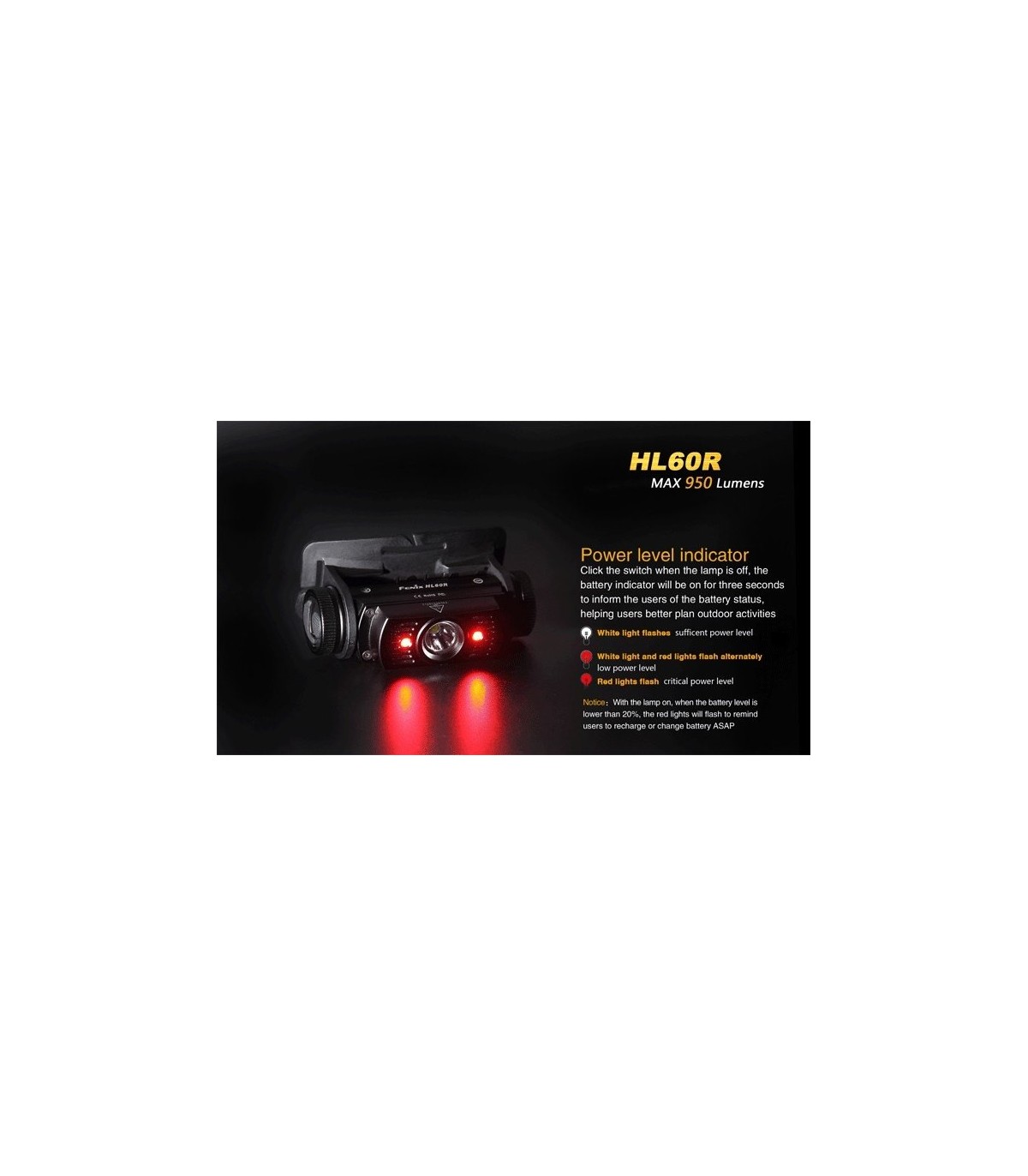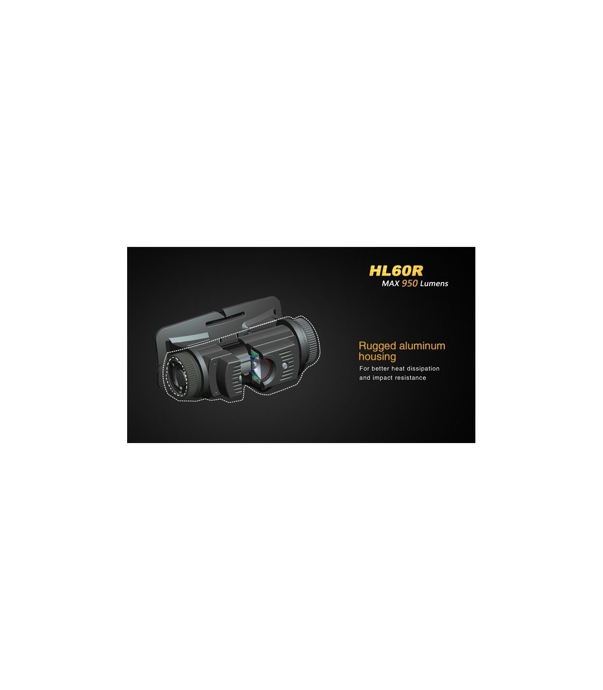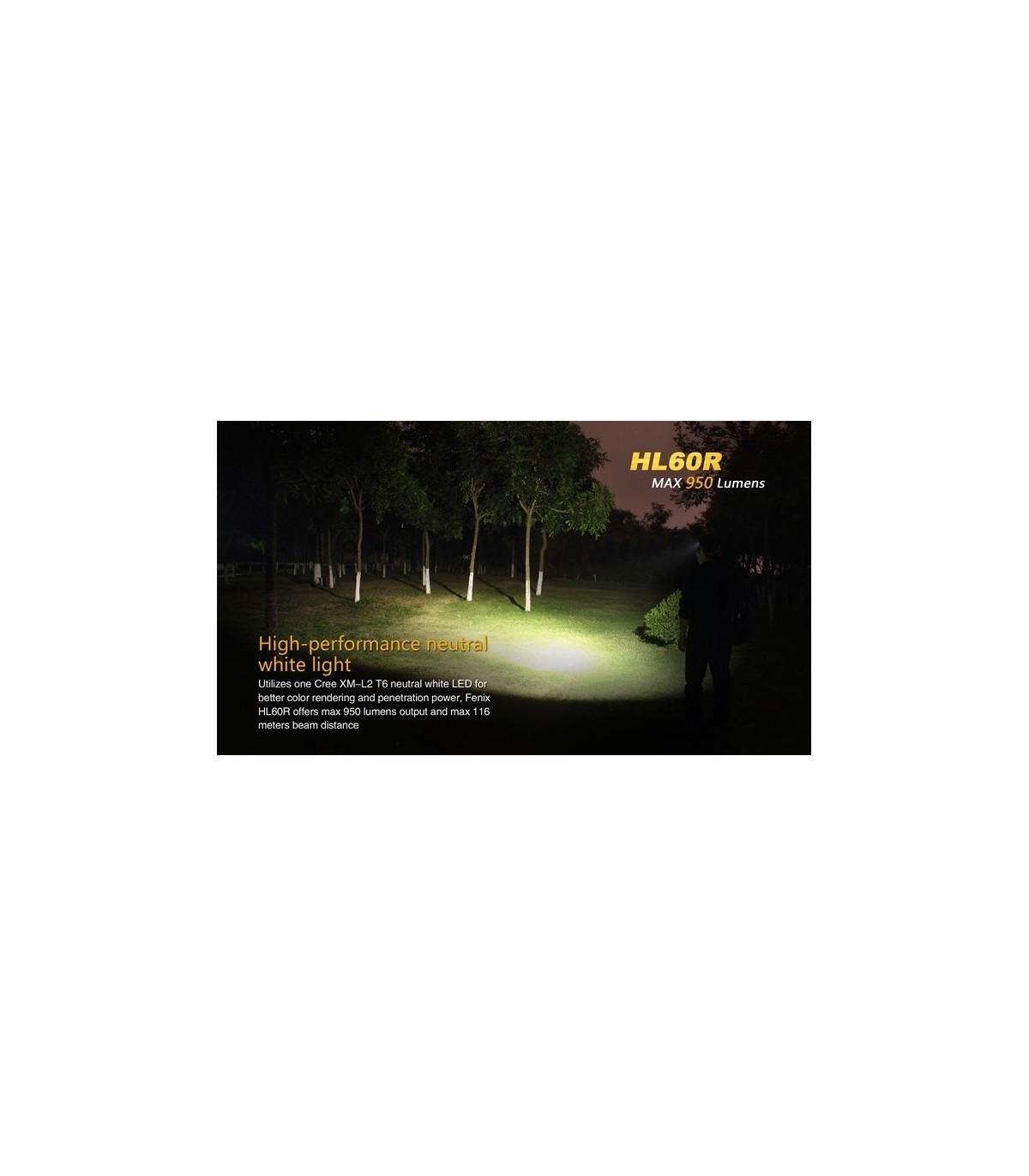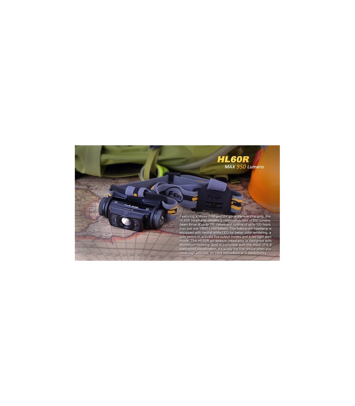 El frontal HL60R incorpora como novedad respecto al HL55 un puerto micro USB para cargarlo en cualquier lugar. Puede entregar una potencia máxima de 950 lúmenes, la viga del haz de luz es capaz de alcanzar 116 metros y el modo de intensidad más bajo permite 100 horas de iluminación con solo una batería de Ion-litio recargable 18650. Este frontal equipa un Led blanco neutro para una mejor reproducción de los colores y penetración en situaciones de niebla, lluvia o humo, así como un botón lateral para activar los cinco modos de salida y un modo de luz de alerta roja. El frontal HL60R está fabricado con un cuerpo de aluminio, es un todoterreno irrompible con una protección IPX8.