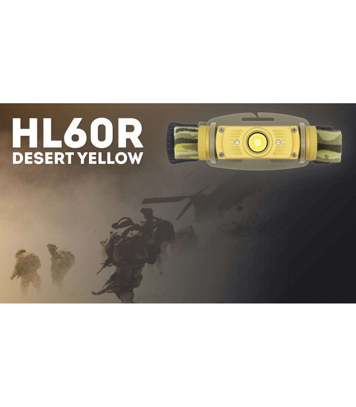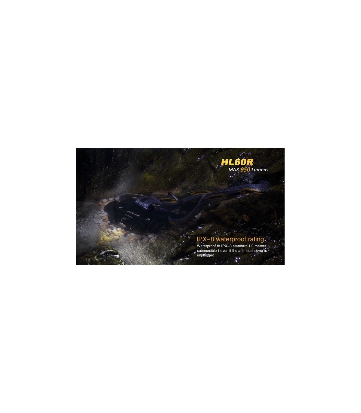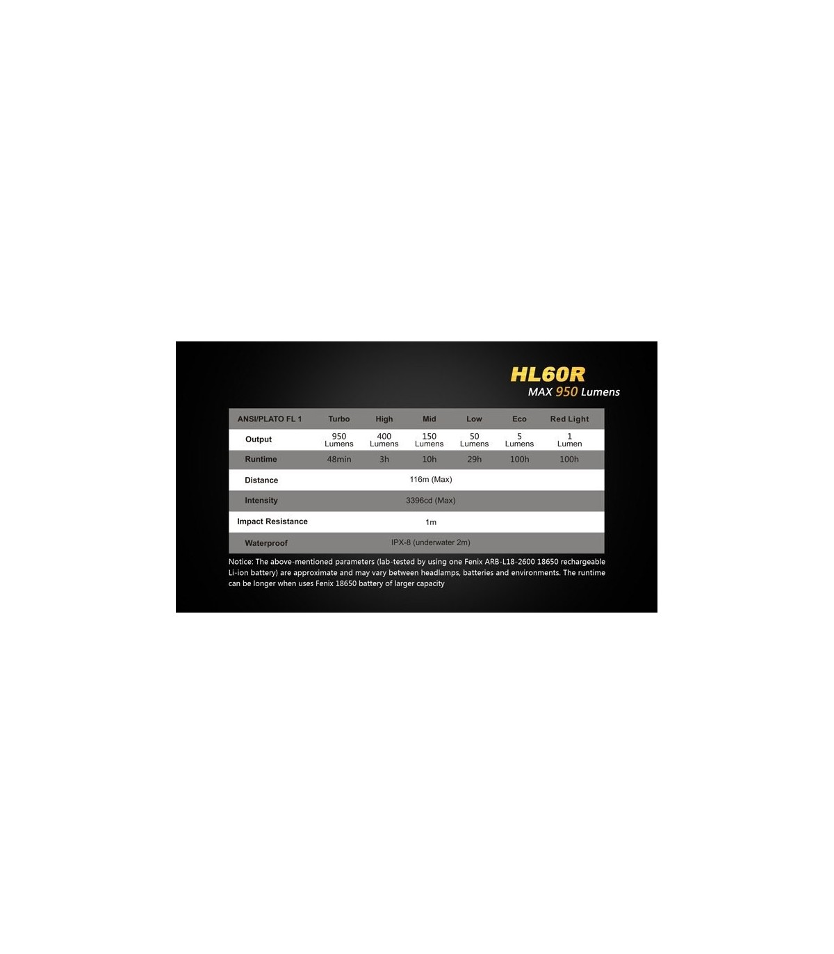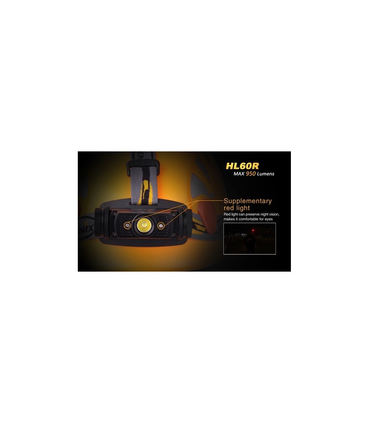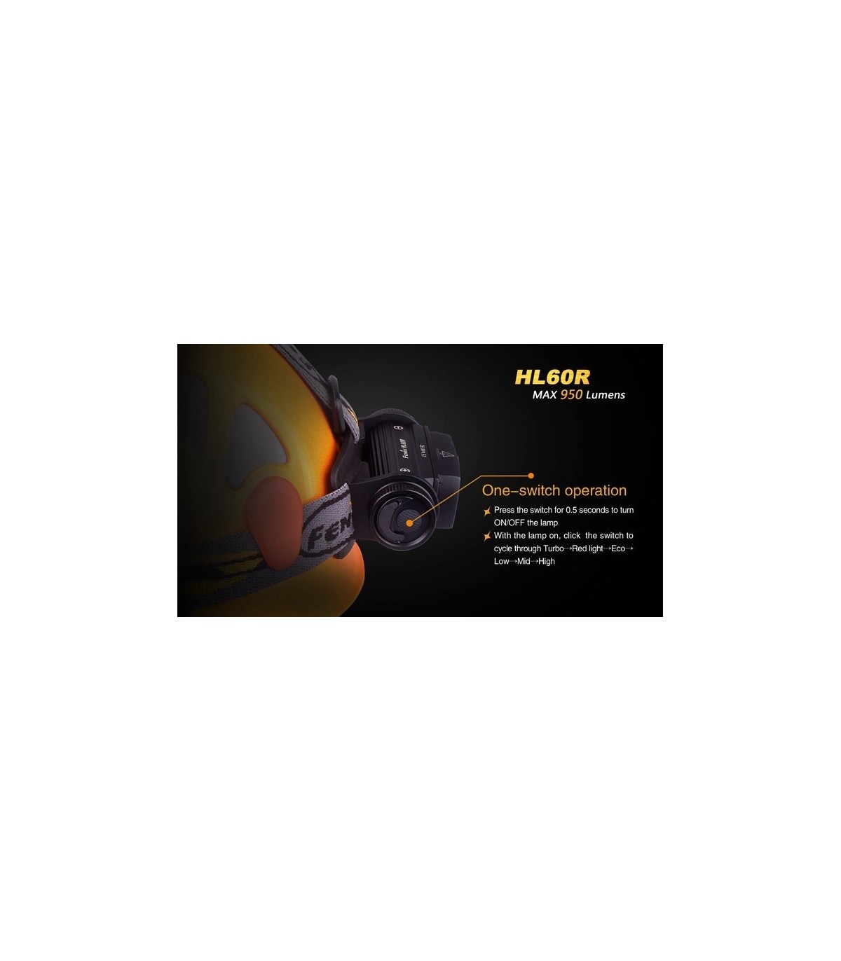 El frontal HL60R incorpora como novedad respecto al HL55 un puerto micro USB para cargarlo en cualquier lugar. Puede entregar una potencia máxima de 950 lúmenes, la viga del haz de luz es capaz de alcanzar 116 metros y el modo de intensidad más bajo permite 100 horas de iluminación con solo una batería de Ion-litio recargable 18650. Este frontal equipa un Led blanco neutro para una mejor reproducción de los colores y penetración en situaciones de niebla, lluvia o humo, así como un botón lateral para activar los cinco modos de salida y un modo de luz de alerta roja. El frontal HL60R está fabricado con un cuerpo de aluminio, es un todoterreno irrompible con una protección IPX8.