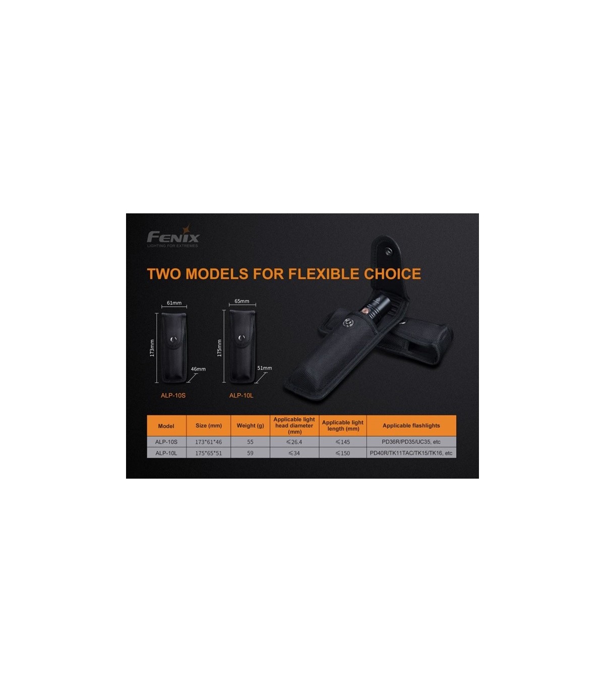 Proteja su inversión Fenix con la funda ALP-10S. Esta funda completamente nueva tiene excelentes características, incluido el material de nailon moldeado por presión en caliente y un diseño de liberación rápida que es perfecto para los agentes del orden. La funda ALP-10 está disponible en dos tamaños diferentes para adaptarse a diferentes linternas Fenix.