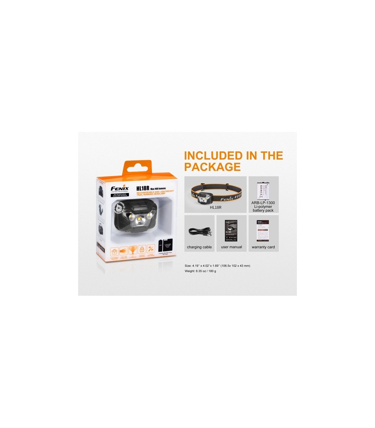 Incluye: Frontal HL18R, cable de carga micro usb-USB, batería litio polímero 1300 mAh ARB-LP-1300. Garantía y manual de instrucciones en español.