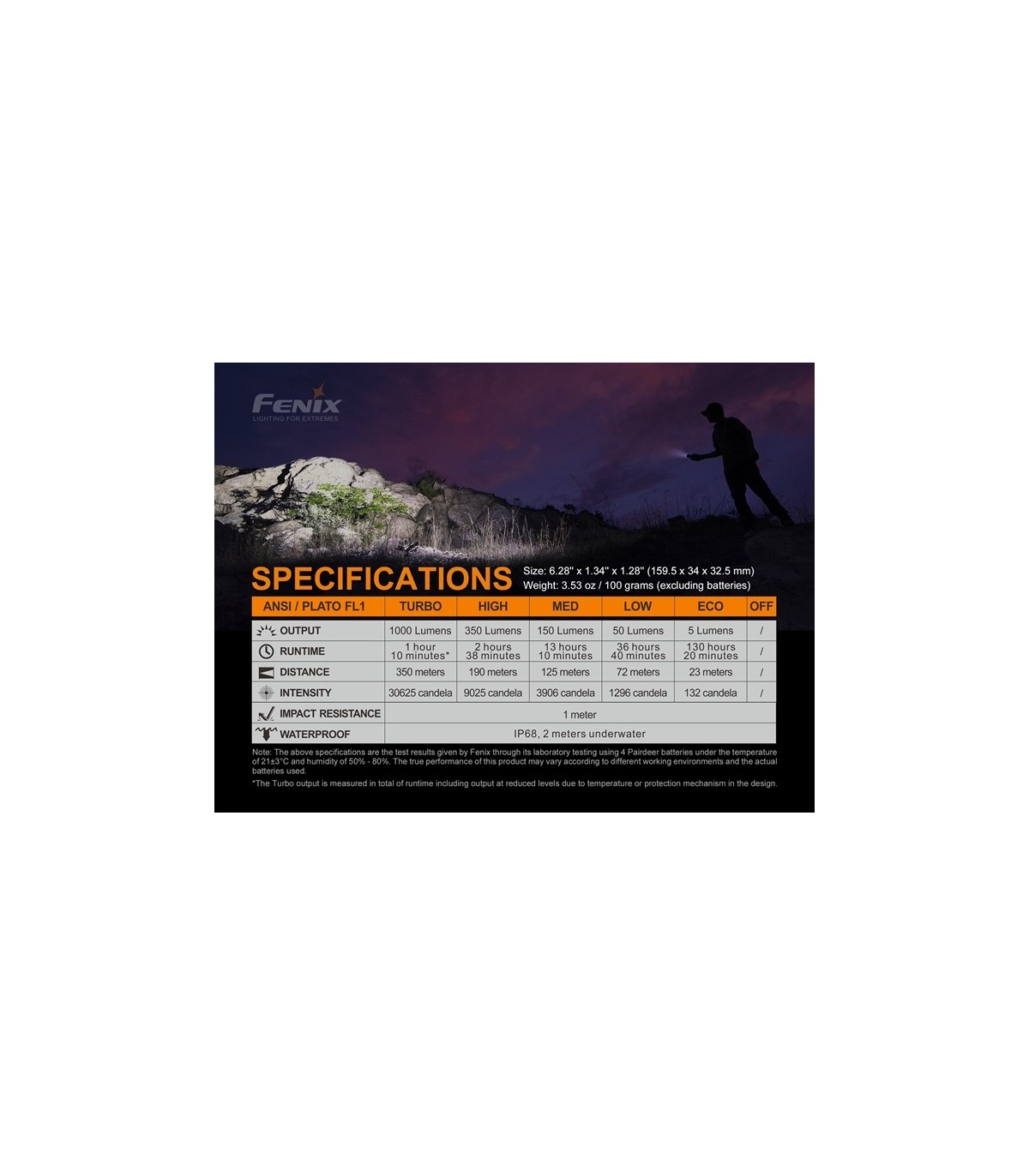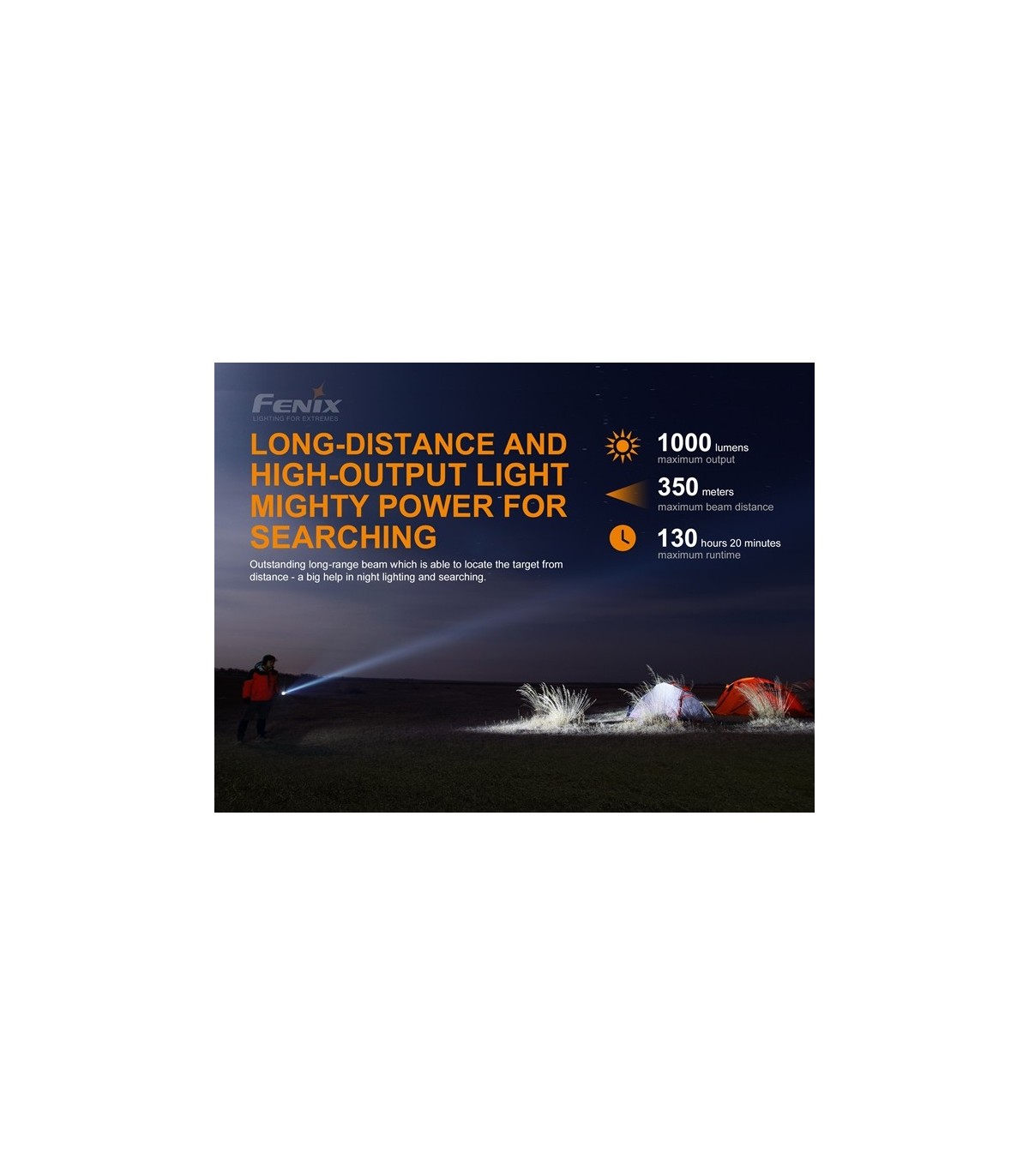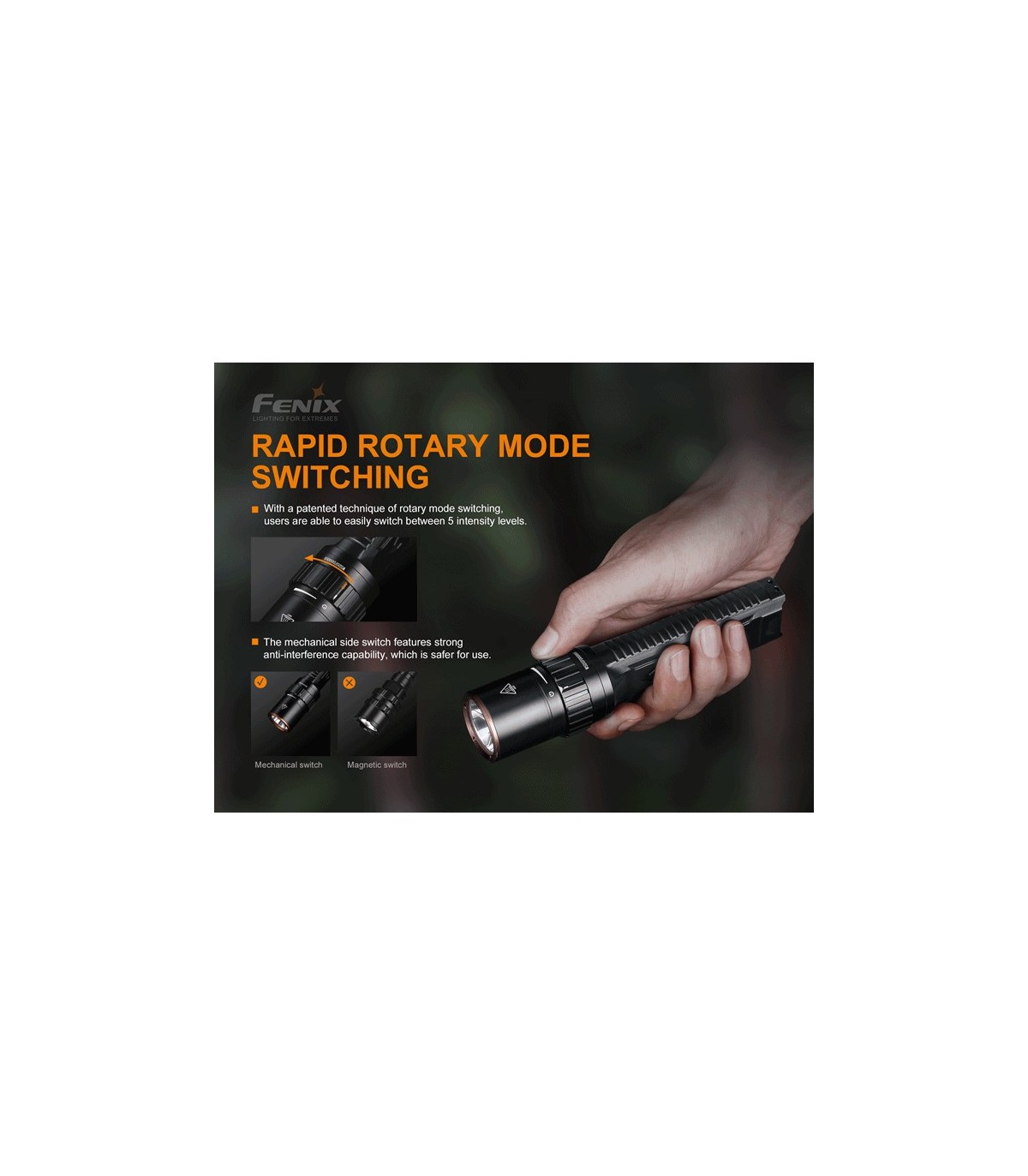 La Fenix LD42, es una linterna de alto rendimiento que utiliza 4 pilas AA con un interruptor giratorio mecánico y una salida máxima de 1000 lúmenes. Tiene un excelente haz de largo alcance y es capaz de localizar el objetivo a gran distancia, es de una gran ayuda en la iluminación nocturna y la búsqueda. Con una técnica patentada de cambio de modo rotativo, los usuarios pueden cambiar fácilmente entre 5 niveles de intensidad. La linterna no consume estando apagada por lo que evitamos sulfatación de la pilas.