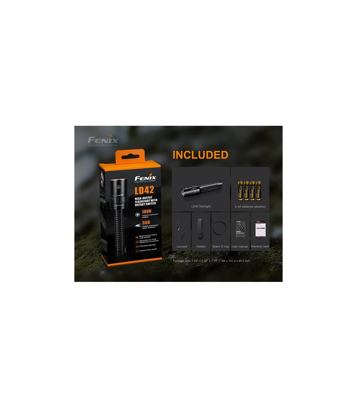 Incluye: Linterna LD42, 4 pilas AA, correa, funda, junta tórica de recambio, manual de instrucciones y garantía.