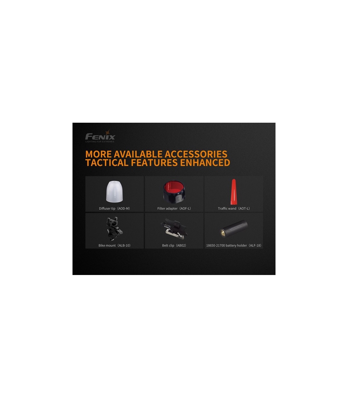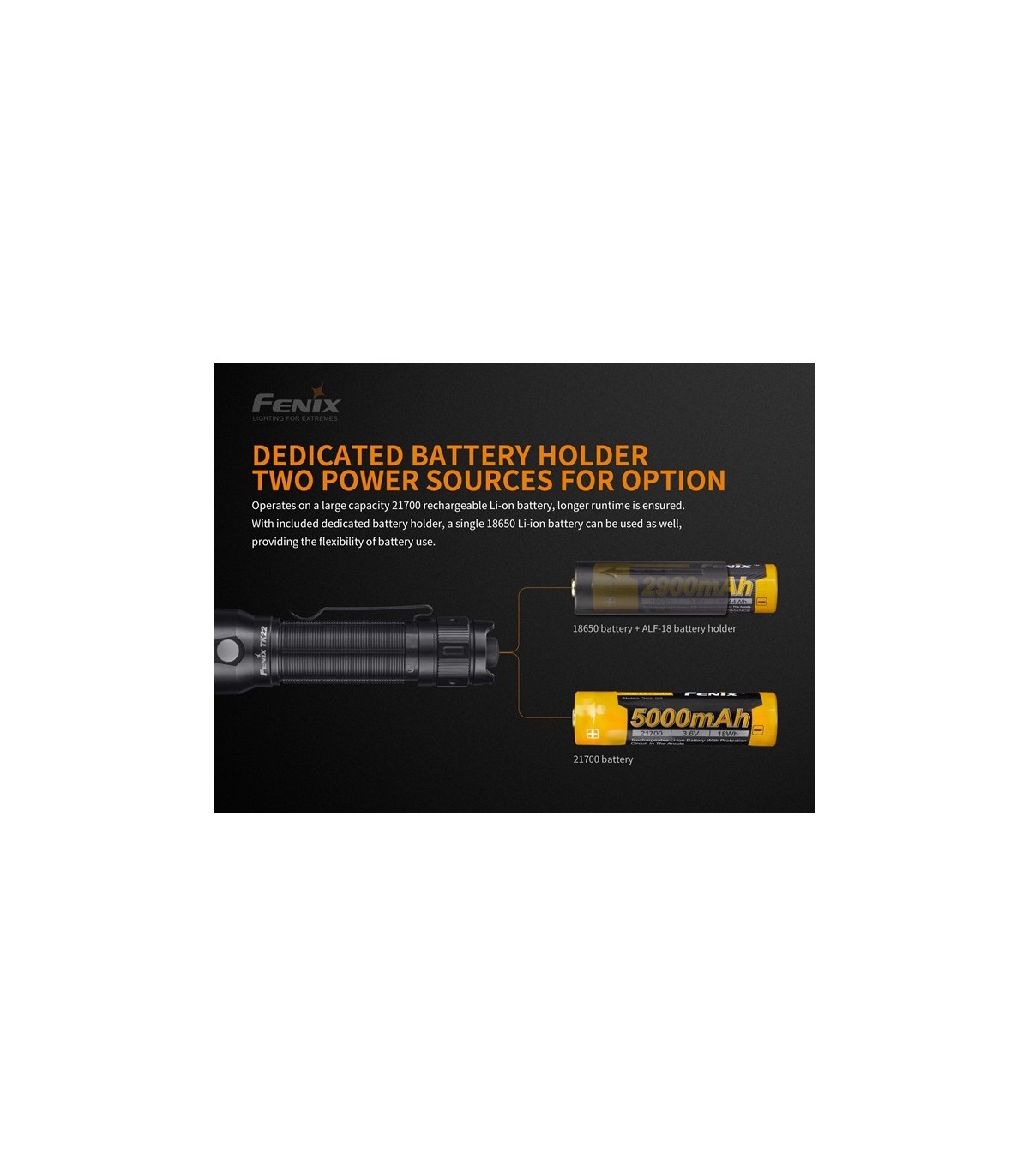 Alimentada por una batería recargable de iones de litio 21700, se puede usar una batería recargable de iones de litio 18650 junto con el soporte de la batería ALF-18.