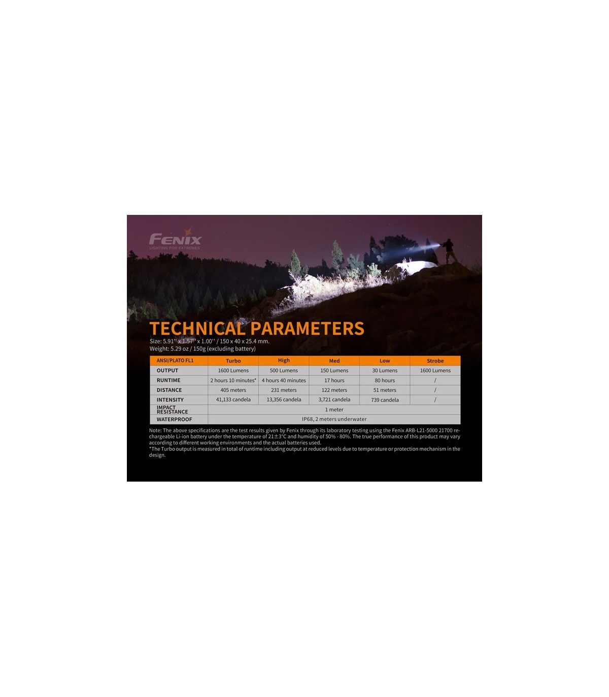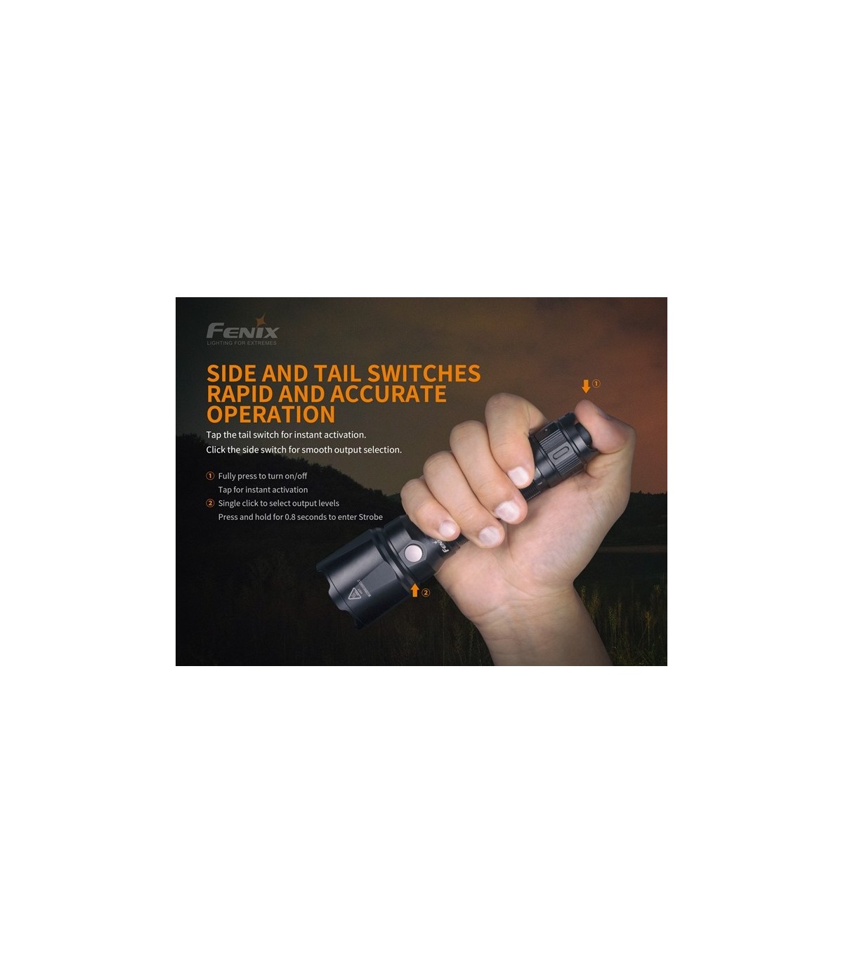 La linterna Fenix TK22 V2.0 mantiene el concepto de diseño de la serie TK de tenacidad, confiabilidad e impermeabilidad. Alimentada por una batería de iones de litio 21700 de gran capacidad, esta linterna tiene una potencia máxima de 1600 lúmenes y una distancia del haz de 405 metros. Dos interruptores separados funcionan de manera independiente: el interruptor de cola táctico para la activación instantánea de la alimentación y el interruptor lateral para la selección de la salida. Las características adicionales incluyen bisel de ataque táctico y protección con clasificación IP68, esta TK22 V2.0 se convierte en la opción inigualable para la vigilancia, las actividades militares y la aplicación de la ley, así como para cazar, buscar y viajar.
