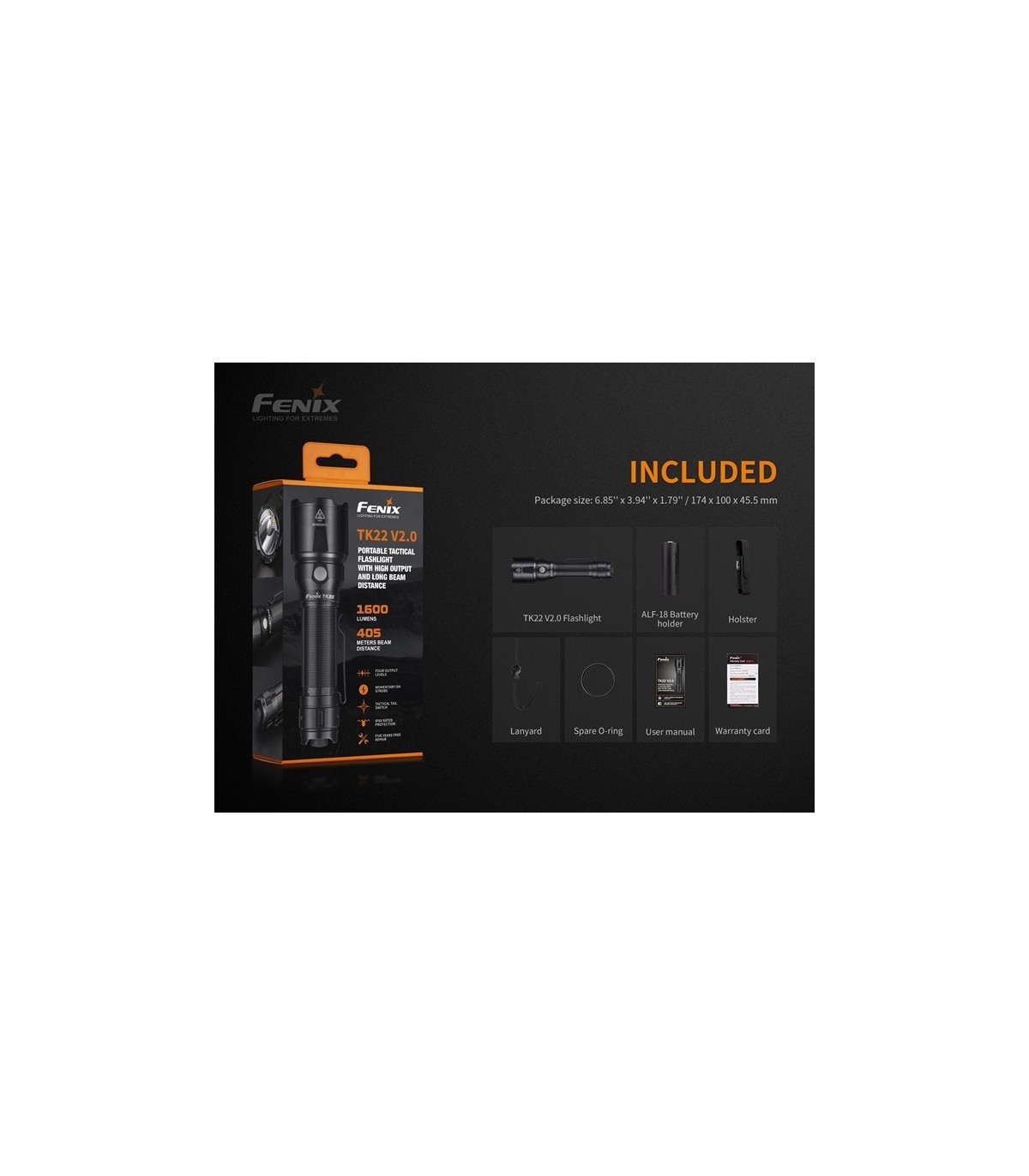 Incluye: Linterna TK22V2.0, ALF-18 (accesorio para poder instalar una batería 18650), funda, cordón para la muñeca, O-ring, garantía y manual de instrucciones.