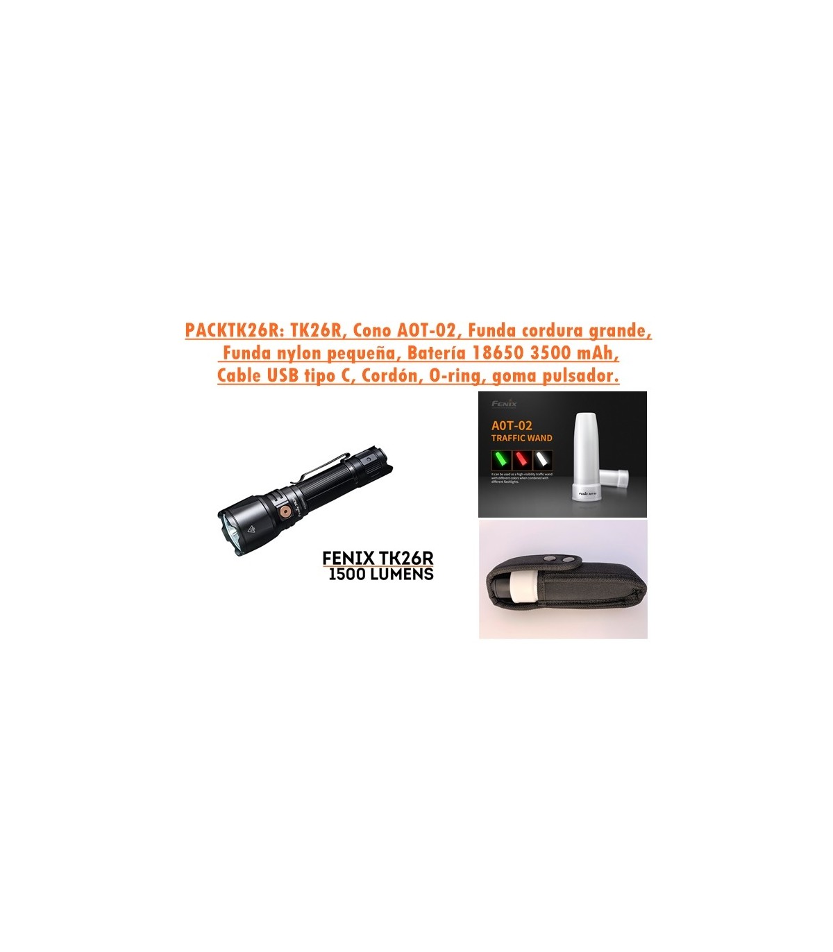 El PACKTK26R incluye: Linterna TK26R, funda de cordura para albergar linterna + Cono AOT-02, Funda nylon solo para TK26R, Batería recargable de 3500 mAh 18650, Cable USB tipo C, Cordón para la muñeca, Junta tórica de repuesto, goma pulsador de repuesto, Manual de usuario, tarjeta de garantía.