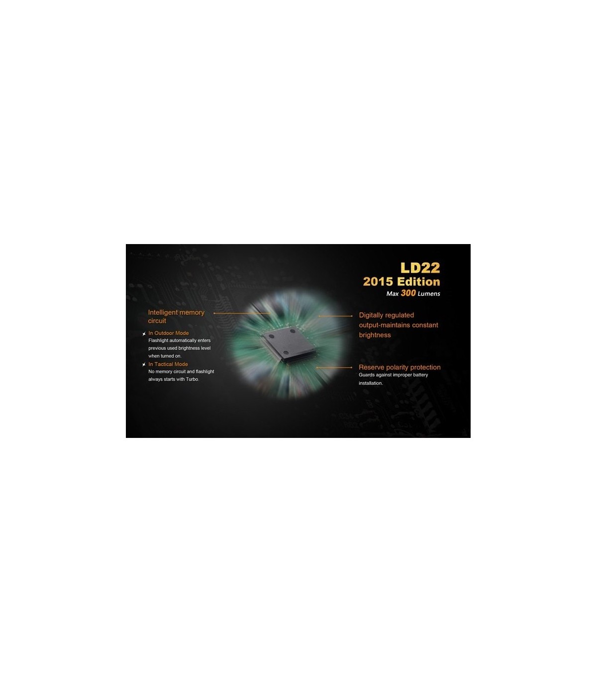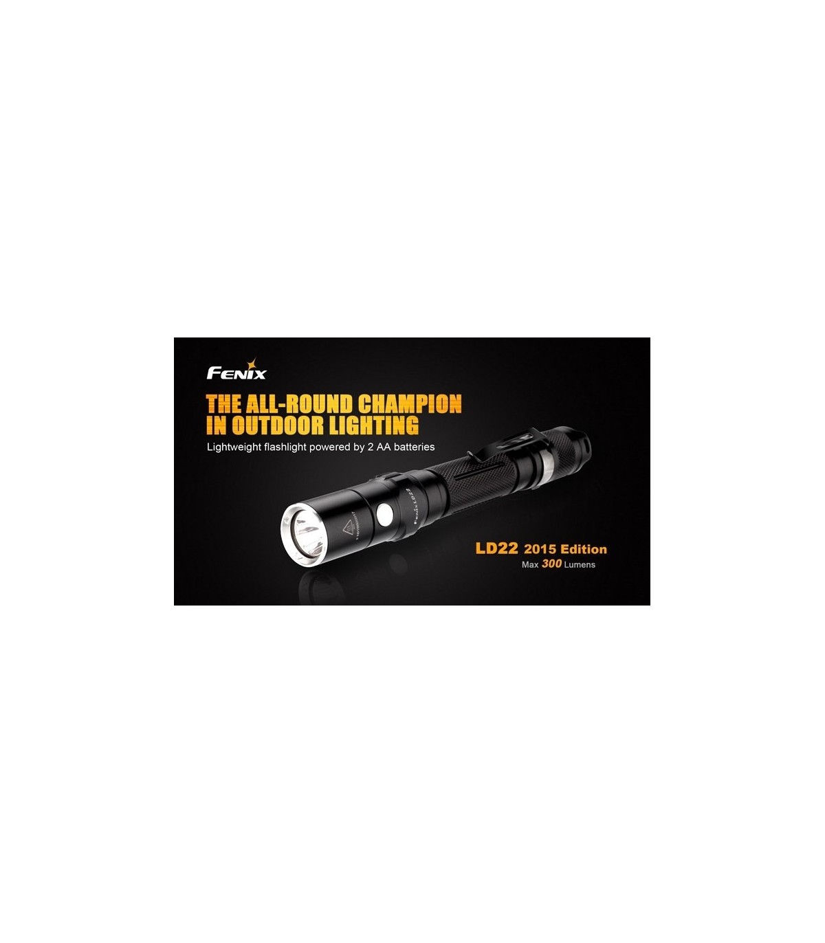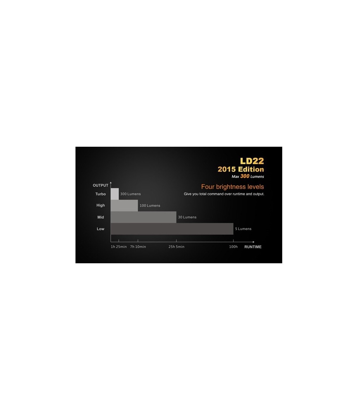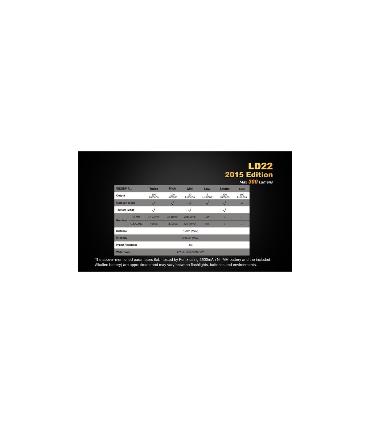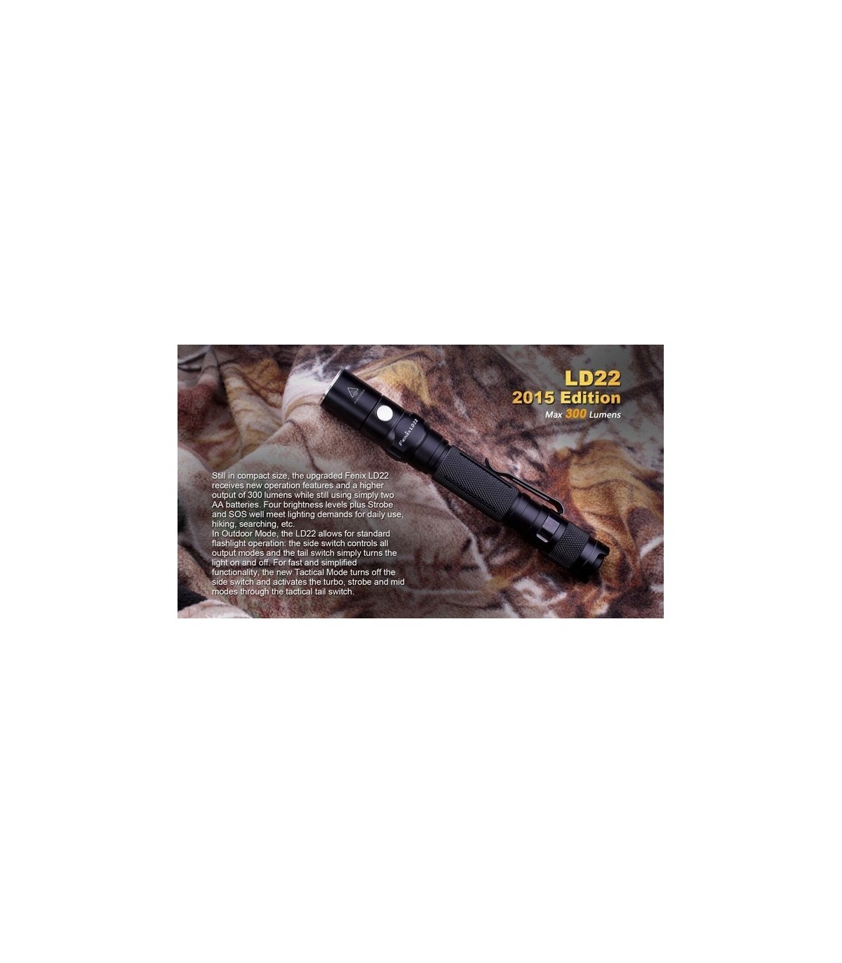 La actualizada linterna Fénix LD22 recibe nuevas características de operación y un mayor rendimiento de 300 lúmenes sin dejar de utilizar simplemente dos pilas AA. Tiene cuatro niveles de brillo más el modo estroboscópico y SOS, así la LD22 puede satisfacer las demandas de iluminación para el uso diario, el senderismo, la búsqueda, policial, industrial, seguridad, etc.