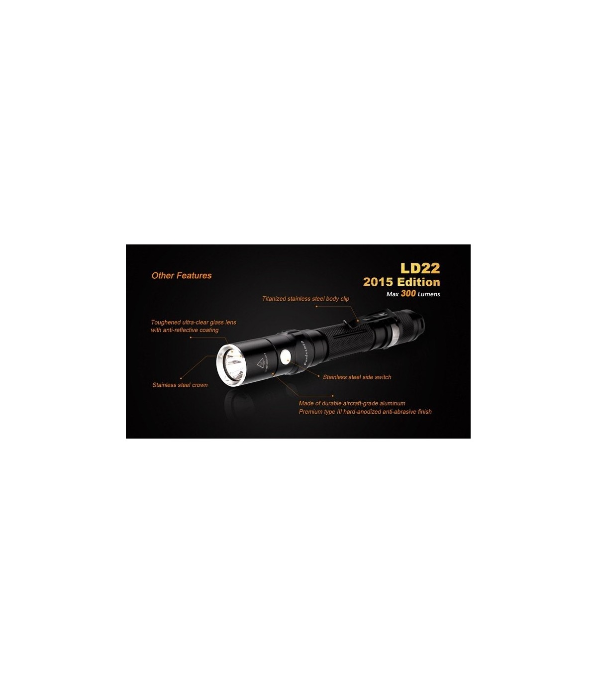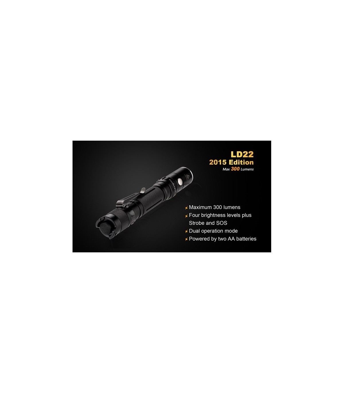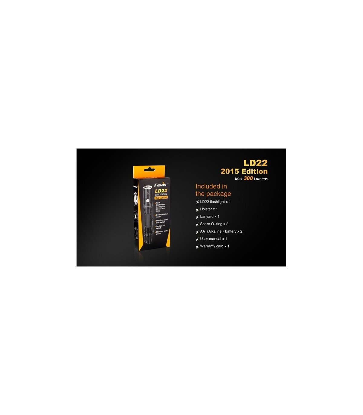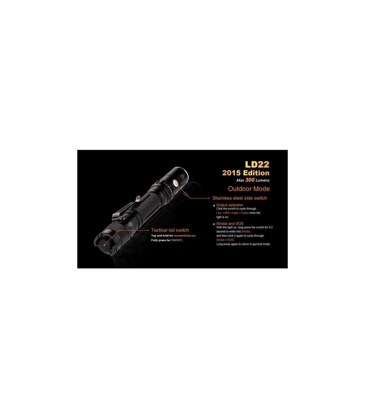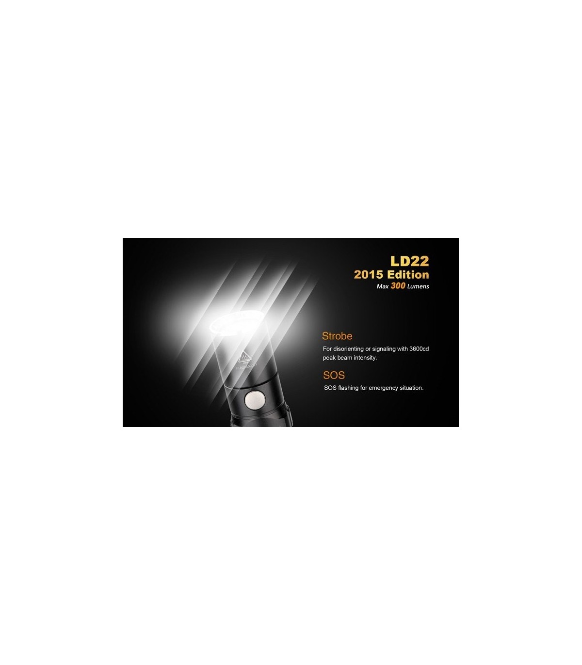 La actualizada linterna Fénix LD22 recibe nuevas características de operación y un mayor rendimiento de 300 lúmenes sin dejar de utilizar simplemente dos pilas AA. Tiene cuatro niveles de brillo más el modo estroboscópico y SOS, así la LD22 puede satisfacer las demandas de iluminación para el uso diario, el senderismo, la búsqueda, policial, industrial, seguridad, etc.