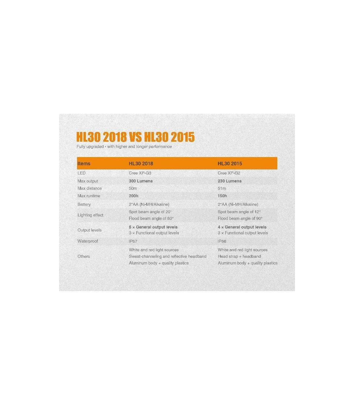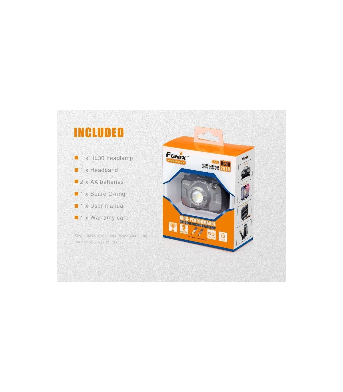 Incluye: Frontal HL30, 1 cinta, 2 pilas AA, 1 O-ring de recambio, manual de instrucciones y garantía.