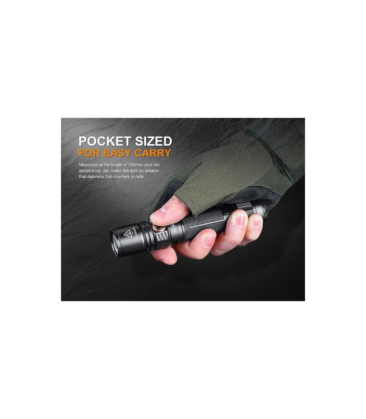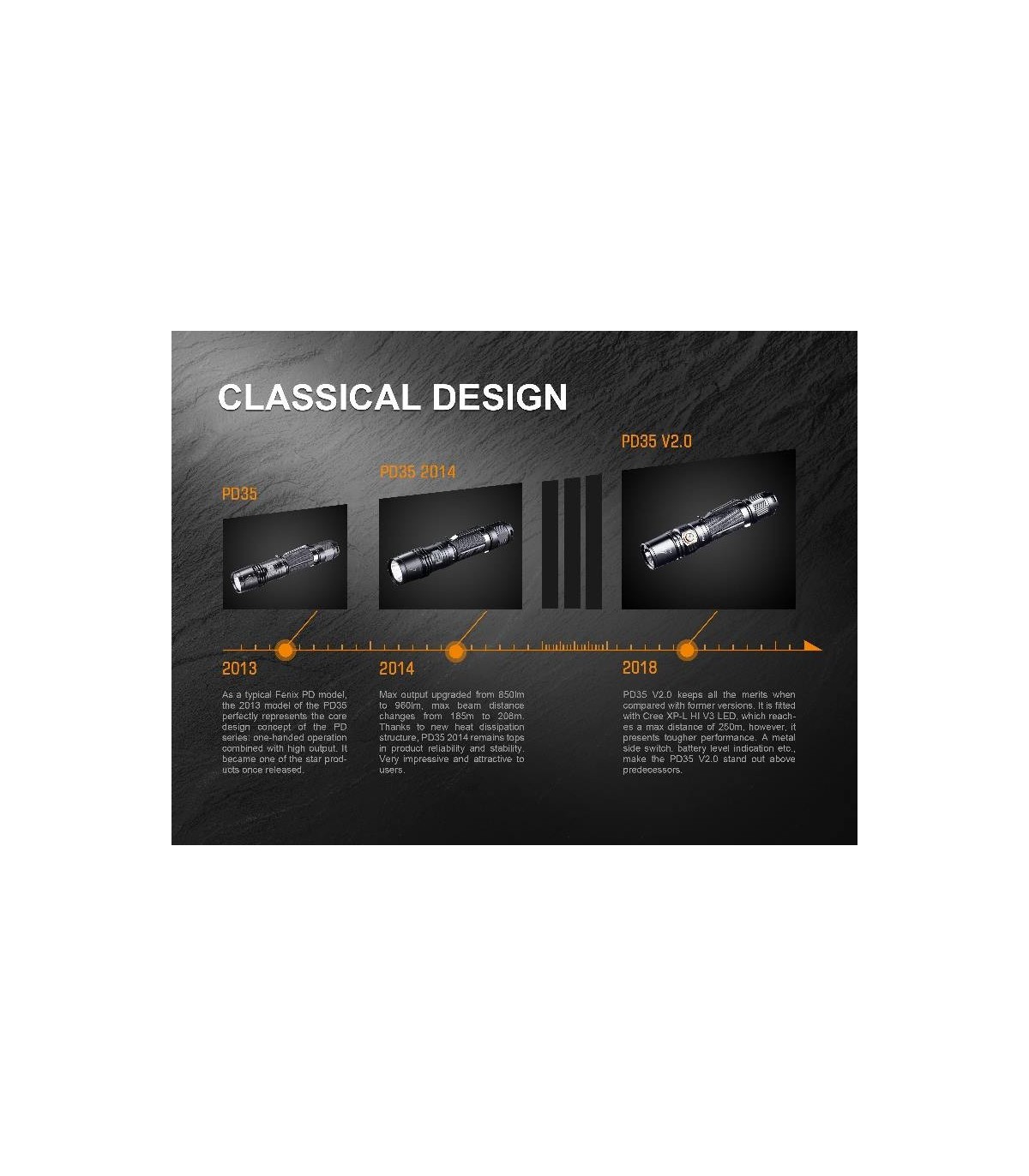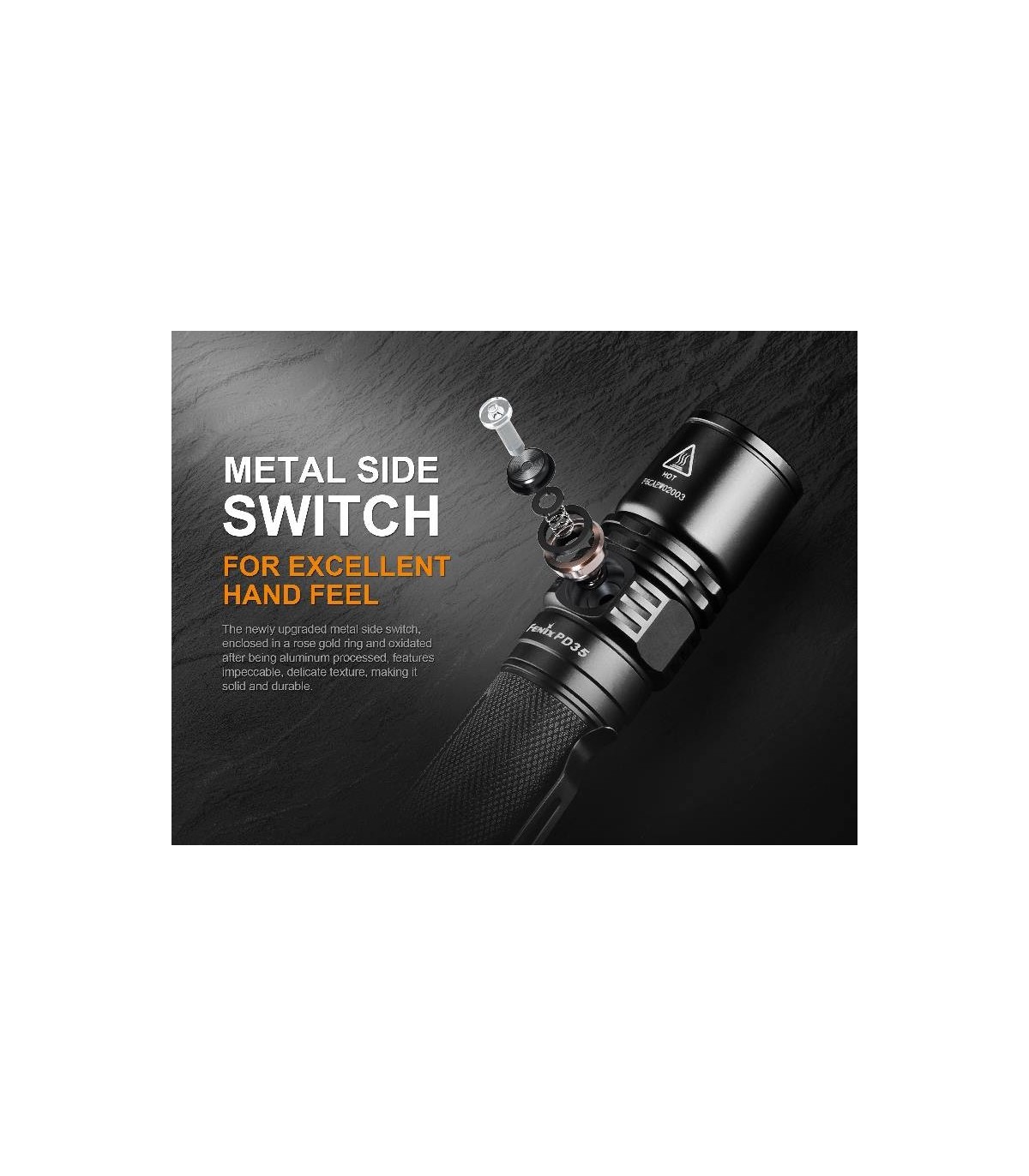 La linterna Fénix PD35 V2.0 es una linterna táctica con un muy buen diseño. Está equipada con un Led Cree XP-L HI V3 y ofrece una salida máxima de 1000 lúmenes y una buena distancia de 250 metros. Esta linterna compacta pero resistente tiene cinco niveles de salida, además de luz estroboscópica instantánea, también se incluye la indicación del nivel de la batería. Funciona con una batería recargable de ion de litio 18650, también es compatible con la batería CR123A resistente al frío. El diseño de interruptores es dual - interruptor de cola táctico e interruptor lateral de metal, ofrece un funcionamiento rápido y fácil de usar. Todos estos aspectos destacados hacen que el PD35 V2.0 sea muy adecuada para uso militar, vigilancia, exploración, actividades outdoor e iluminación de emergencia en general.