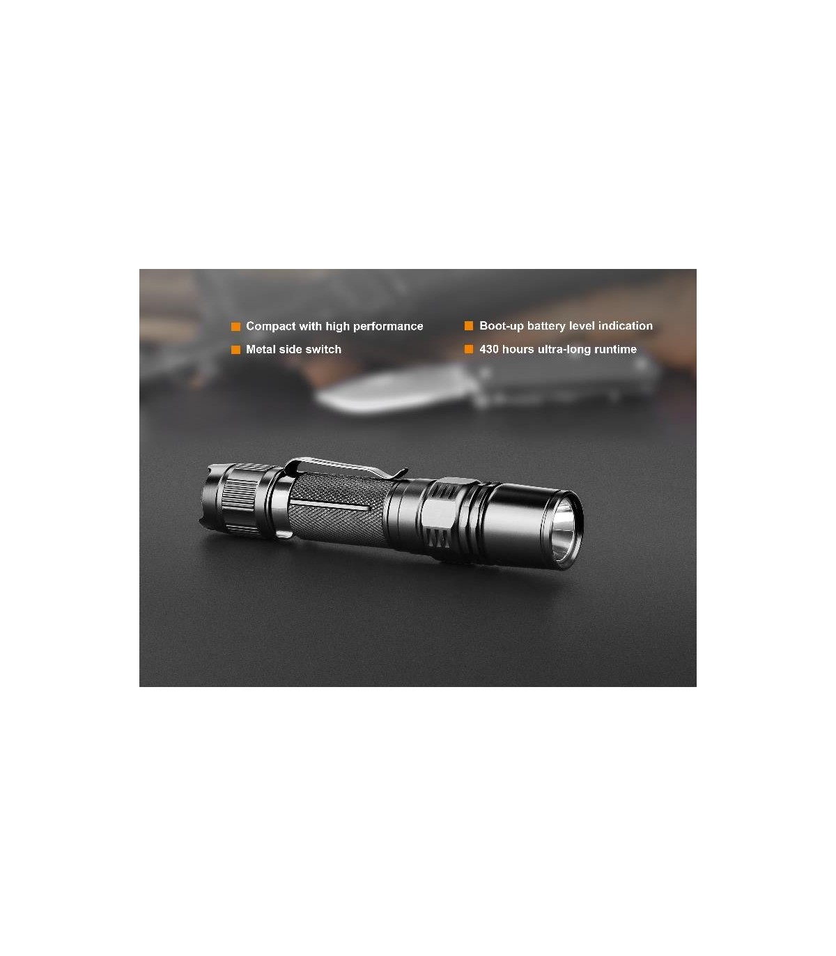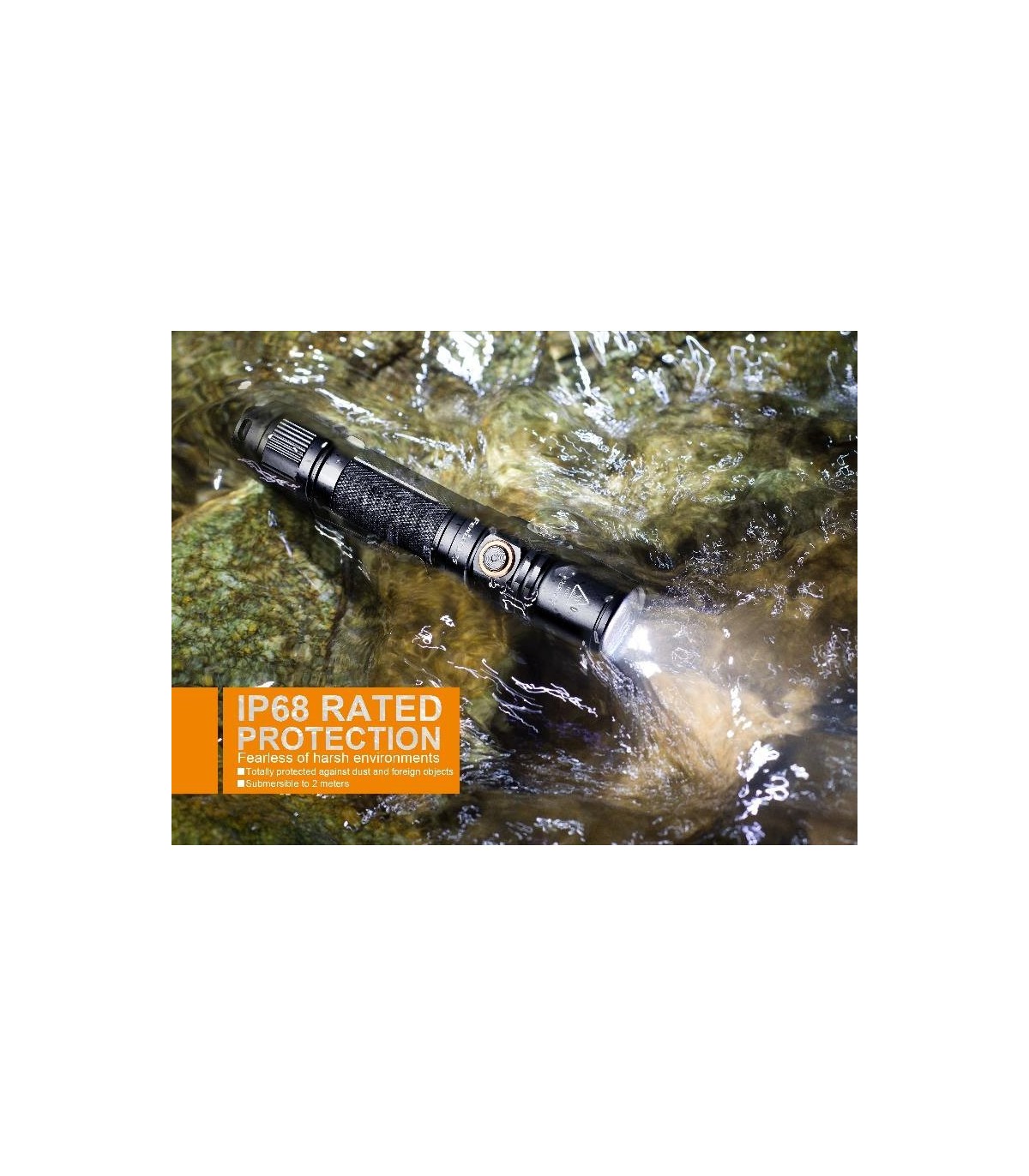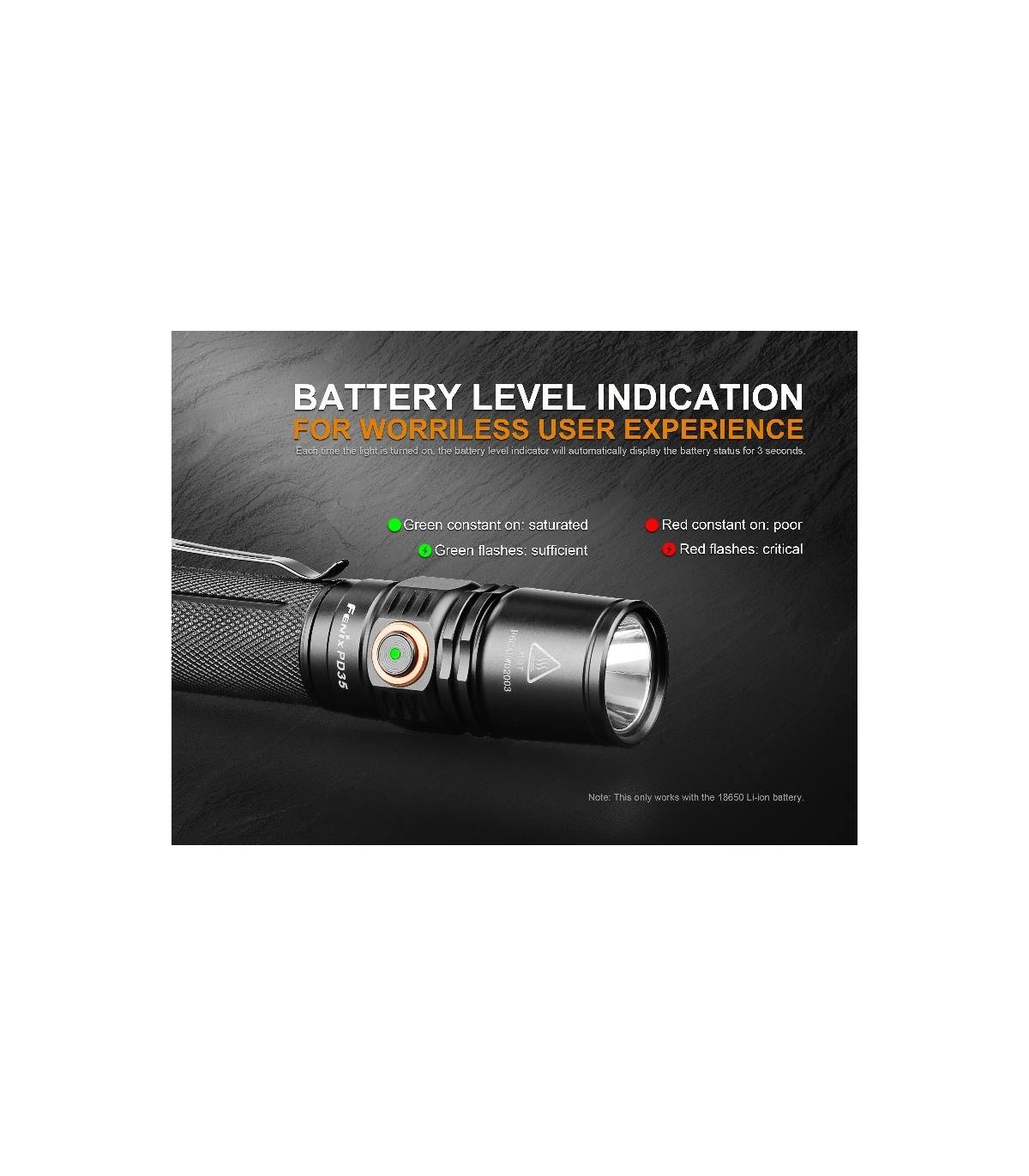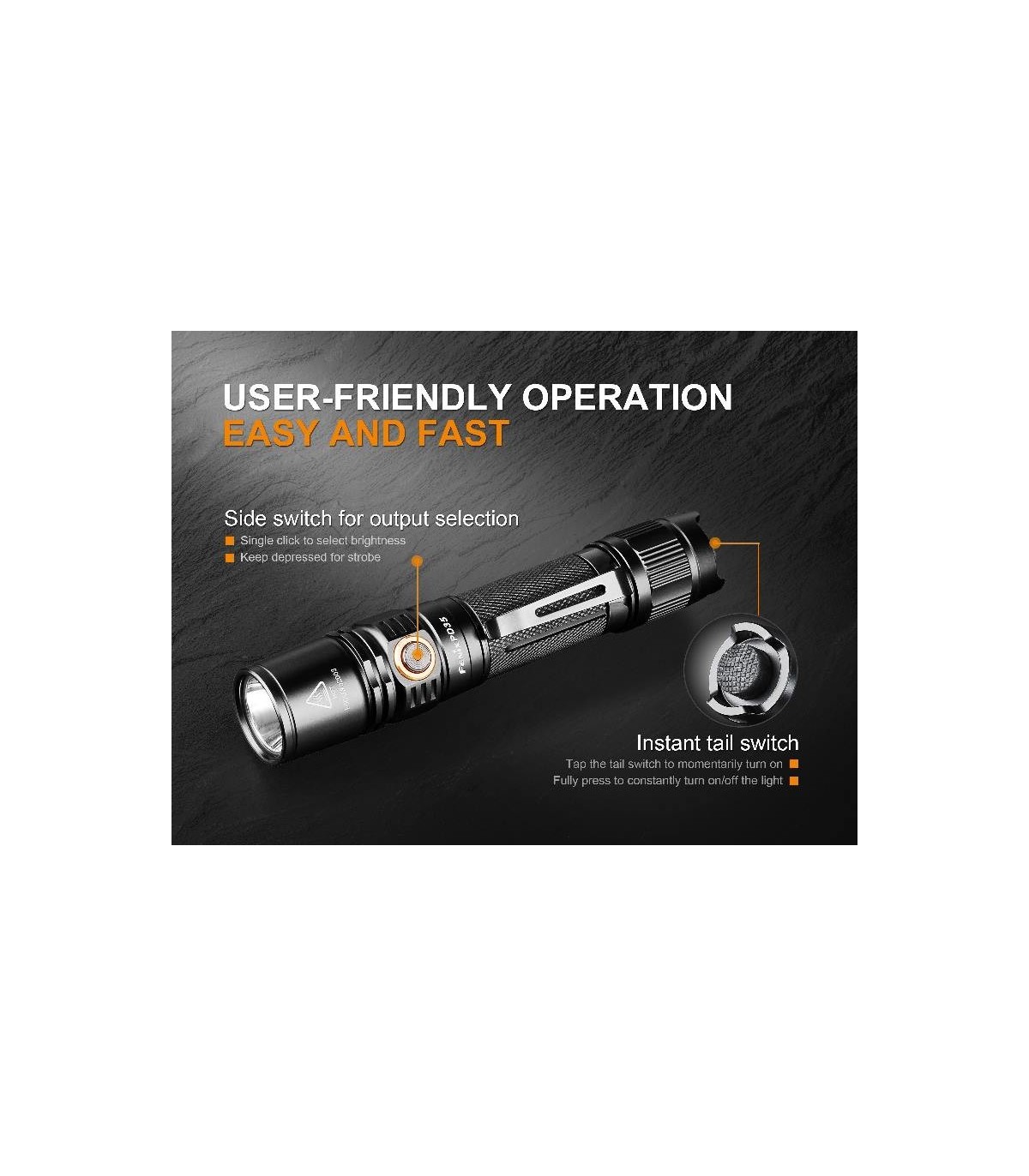 La linterna Fénix PD35 V2.0 es una linterna táctica con un muy buen diseño. Está equipada con un Led Cree XP-L HI V3 y ofrece una salida máxima de 1000 lúmenes y una buena distancia de 250 metros. Esta linterna compacta pero resistente tiene cinco niveles de salida, además de luz estroboscópica instantánea, también se incluye la indicación del nivel de la batería. Funciona con una batería recargable de ion de litio 18650, también es compatible con la batería CR123A resistente al frío. El diseño de interruptores es dual - interruptor de cola táctico e interruptor lateral de metal, ofrece un funcionamiento rápido y fácil de usar. Todos estos aspectos destacados hacen que el PD35 V2.0 sea muy adecuada para uso militar, vigilancia, exploración, actividades outdoor e iluminación de emergencia en general.