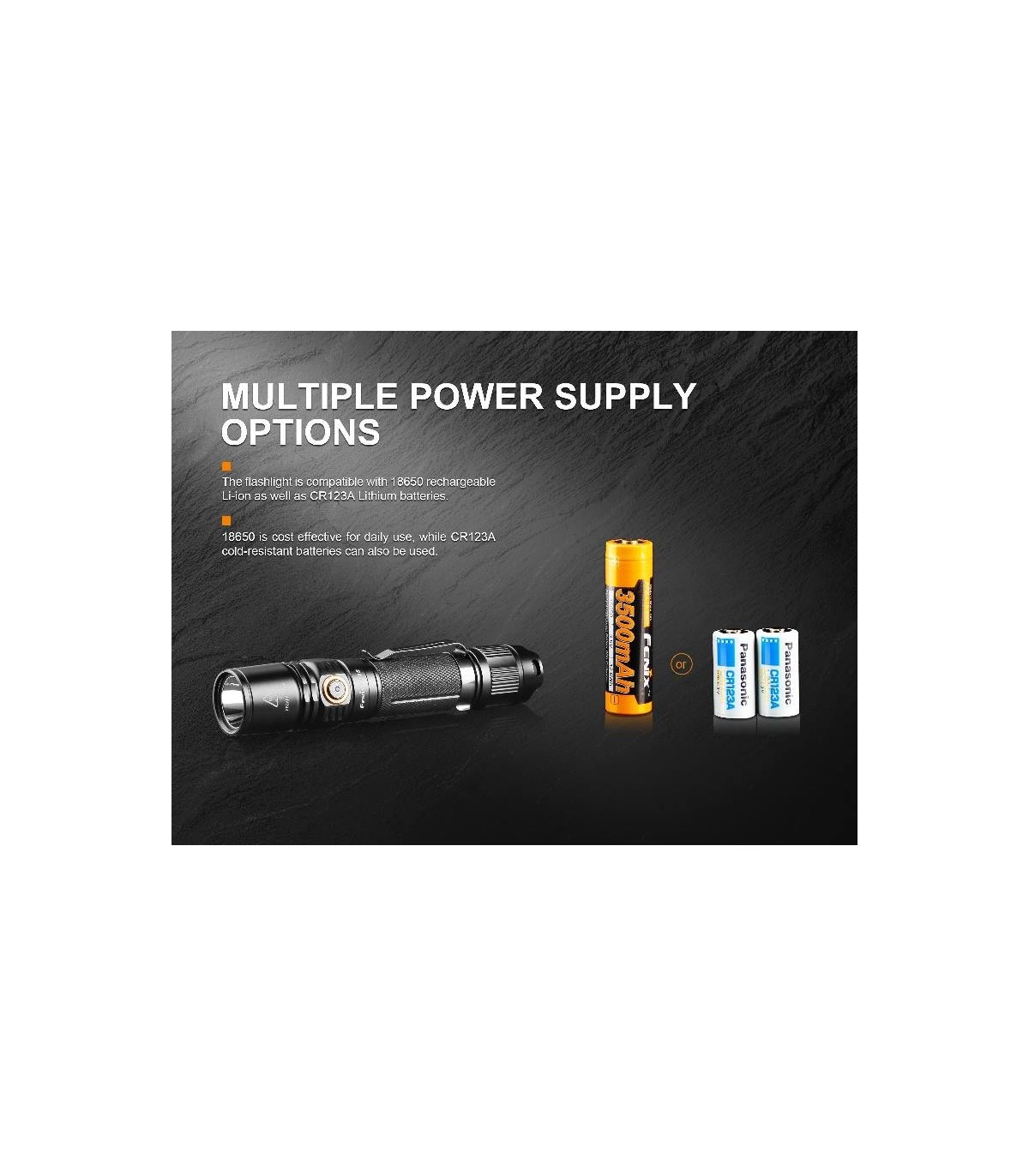 • Funciona con una batería recargable de ión de litio de 18650 o dos baterías de litio 3V / CR123A