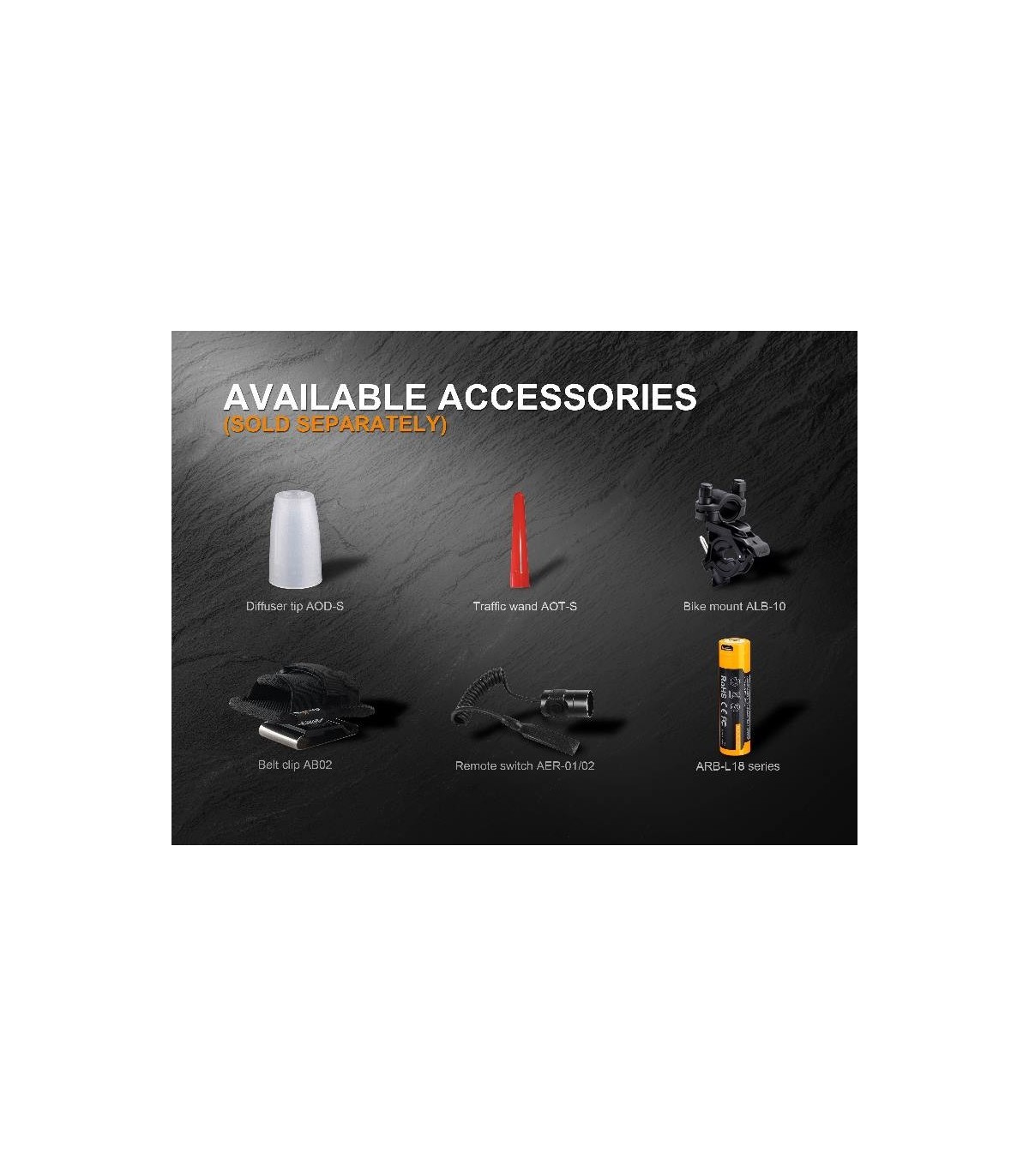 Accesorios disponibles: AOD-S (difusor), AOT-S (cono de tráfico rojo), ALB-10 (soporte para manillar bici), AB02 (clip cinturón rotativo Fénix), AER-02 (pulsador remoto), Baterías ARB-L18..