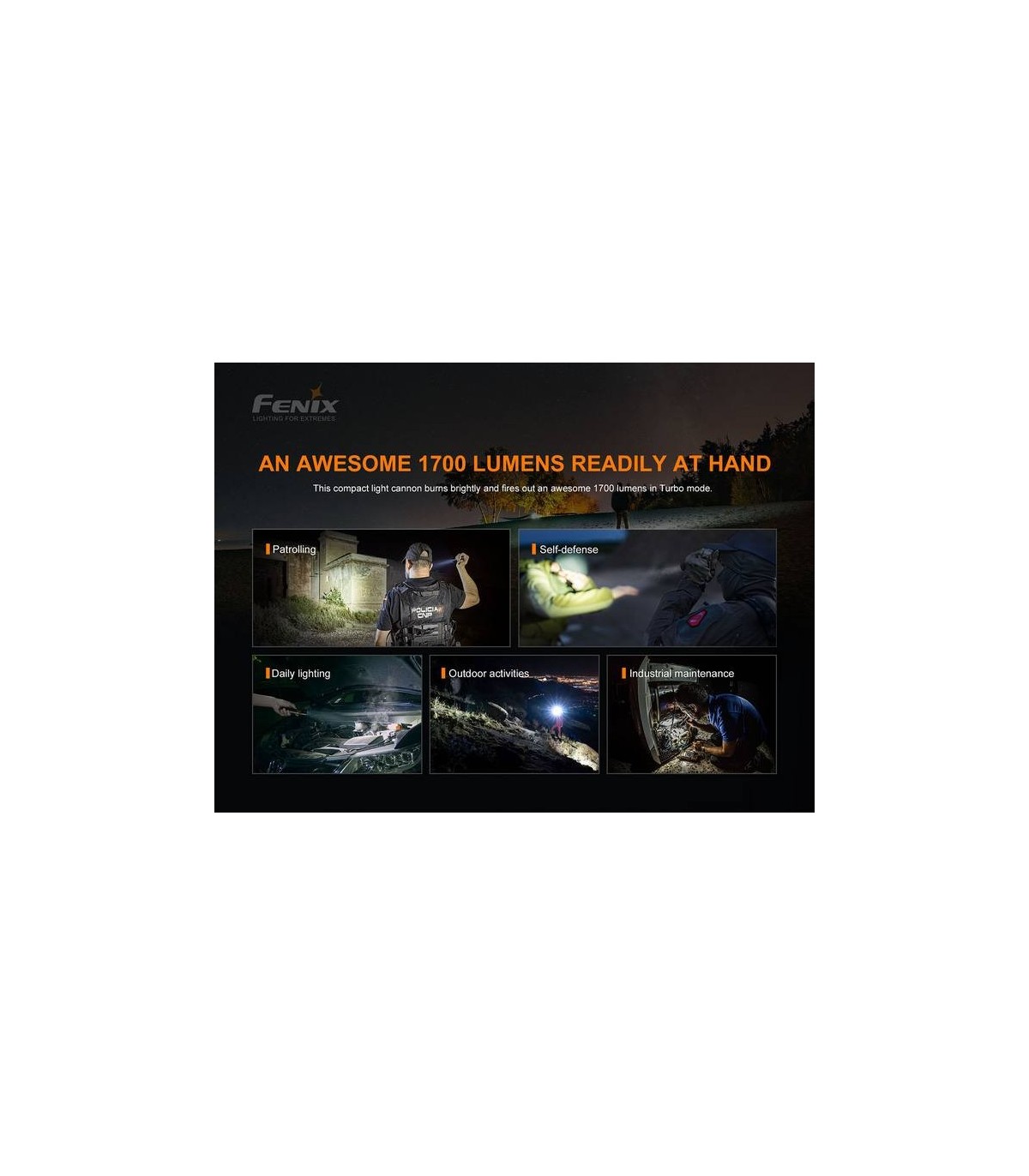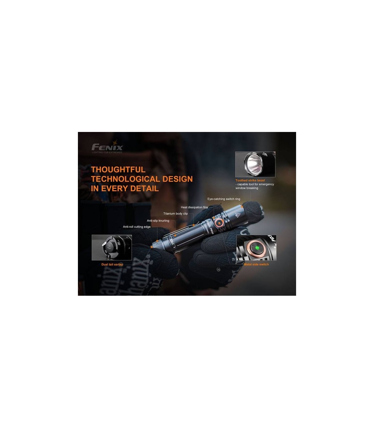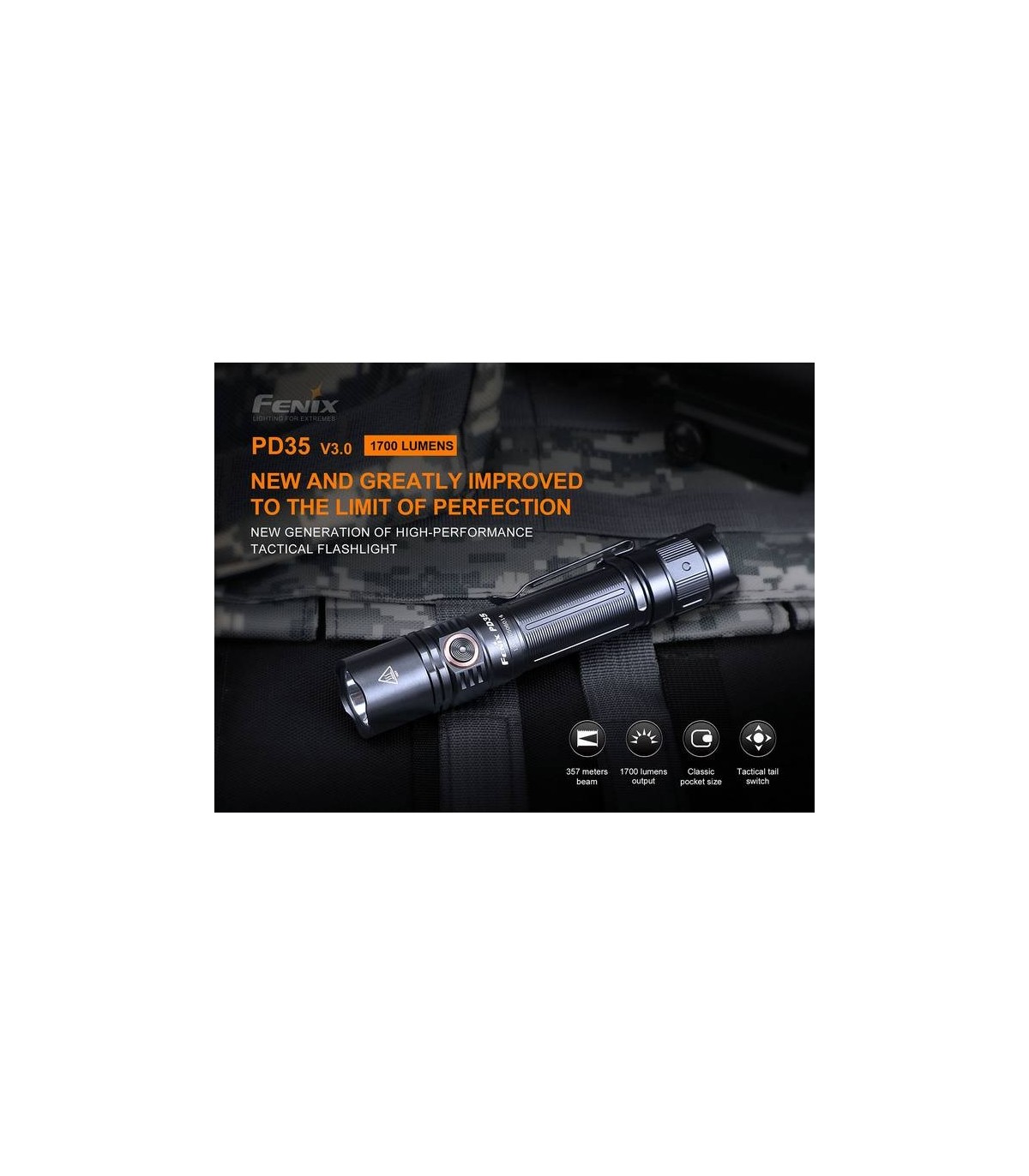 Todos estas características especiales hacen que la linterna táctica Fenix PD35 V3.0 sea muy adecuada para uso militar, vigilancia, exploración al aire libre, iluminación de emergencia, EDC (Everyday Carry ) y otras aplicaciones Profesionales y Outdoor.