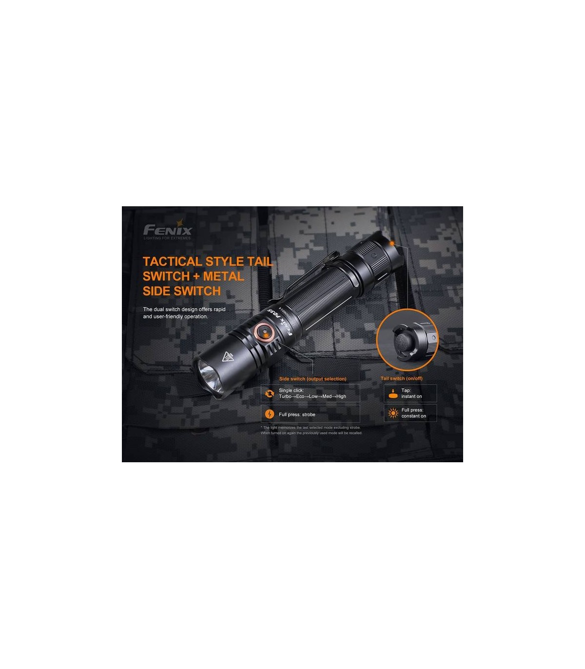 - Activación instantánea con el interruptor de cola táctico; selección de modos de salida con el interruptor lateral.