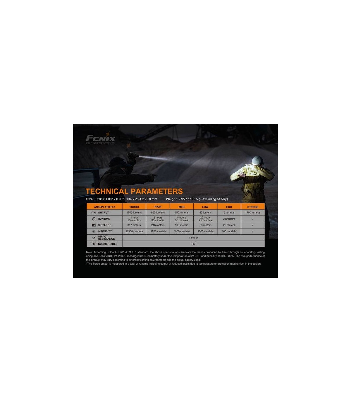 - Turbo: 1700 lúmenes, 1,4 horas, 357 metros