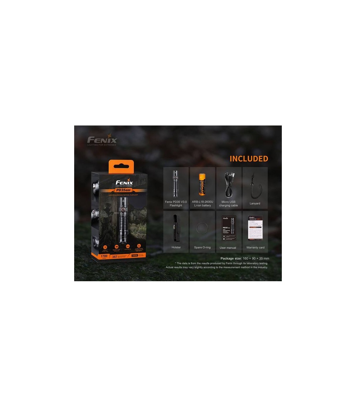 Incluye : Linterna Fenix PD35 V3.0, Batería recargable USB 18650 2600mAh, Cable de carga micro USB, Cuerda para colgar, Funda, Junta tórica de repuesto, Manual de usuario y Tarjeta de garantía.