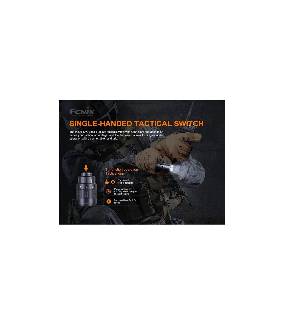 Entre el increíble diseño del interruptor táctico y el interruptor de palanca mecánico, su forma compacta y los dos modos de operación, hace que esta linterna táctica PD36 TAC lo tenga todo.