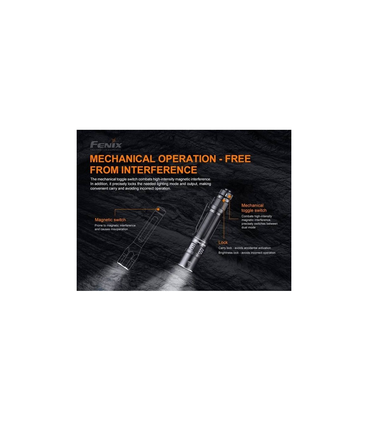 3. Mejor rendimiento antiinterferente: el sistema APF combate la interferencia de señal, pero no funciona si se aplica a un interruptor magnético. Por lo tanto, la linterna TK11 TAC será menos propensa a sufrir interferencias debido al uso de un interruptor mecánico.