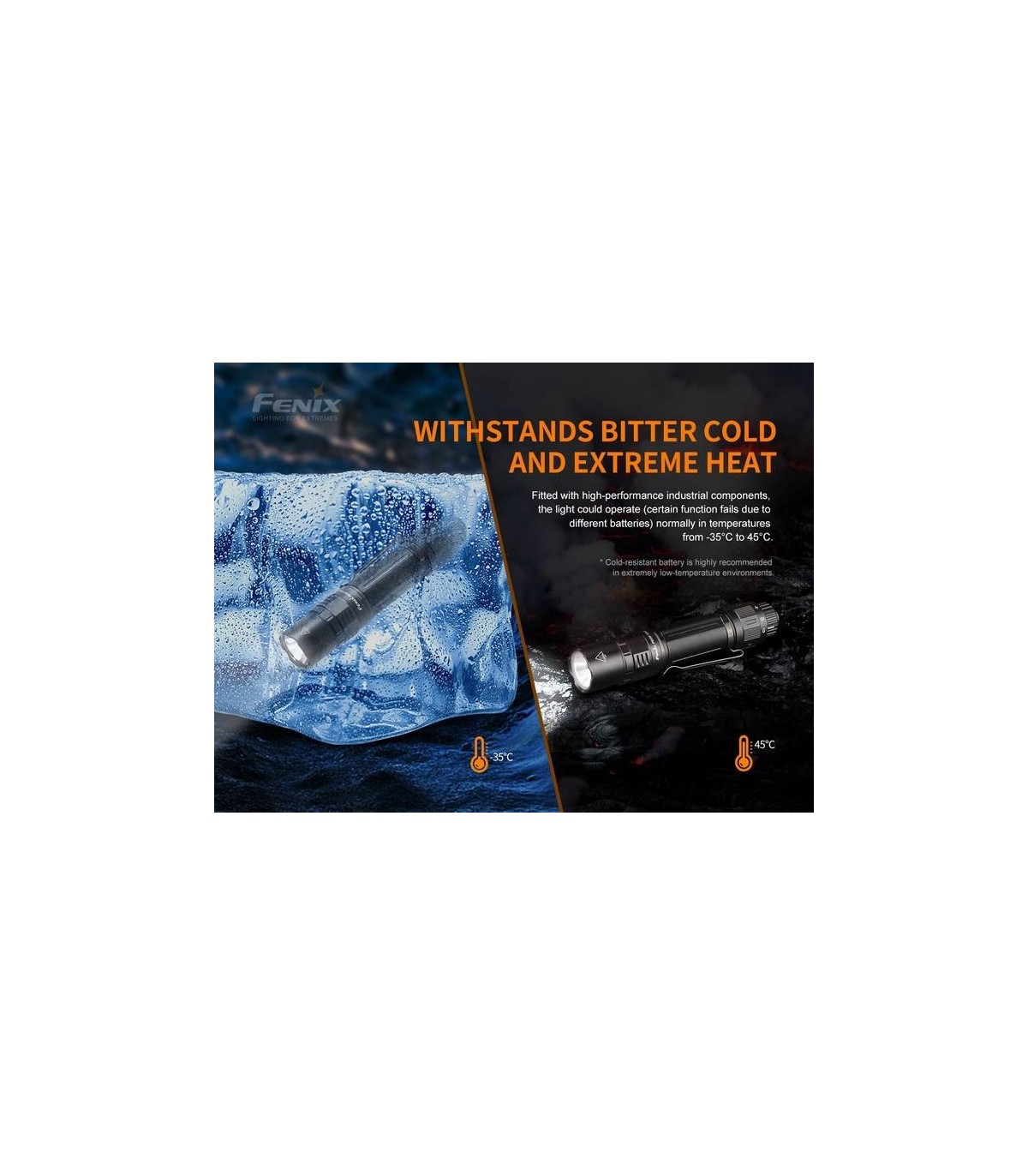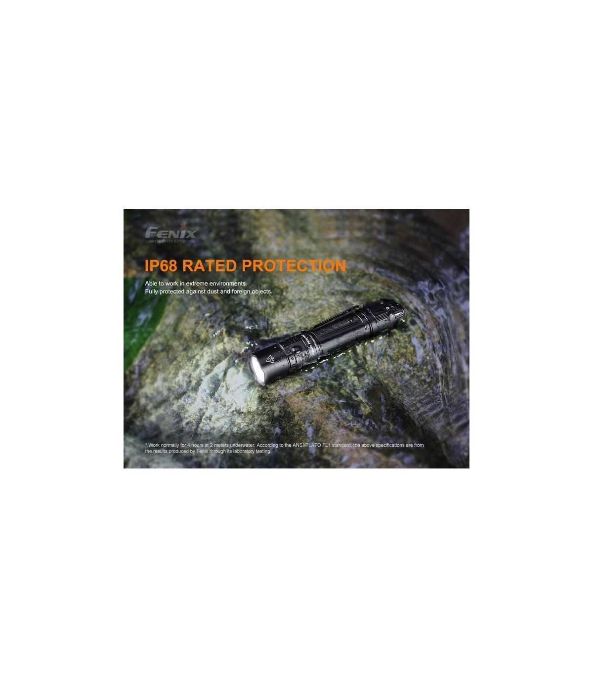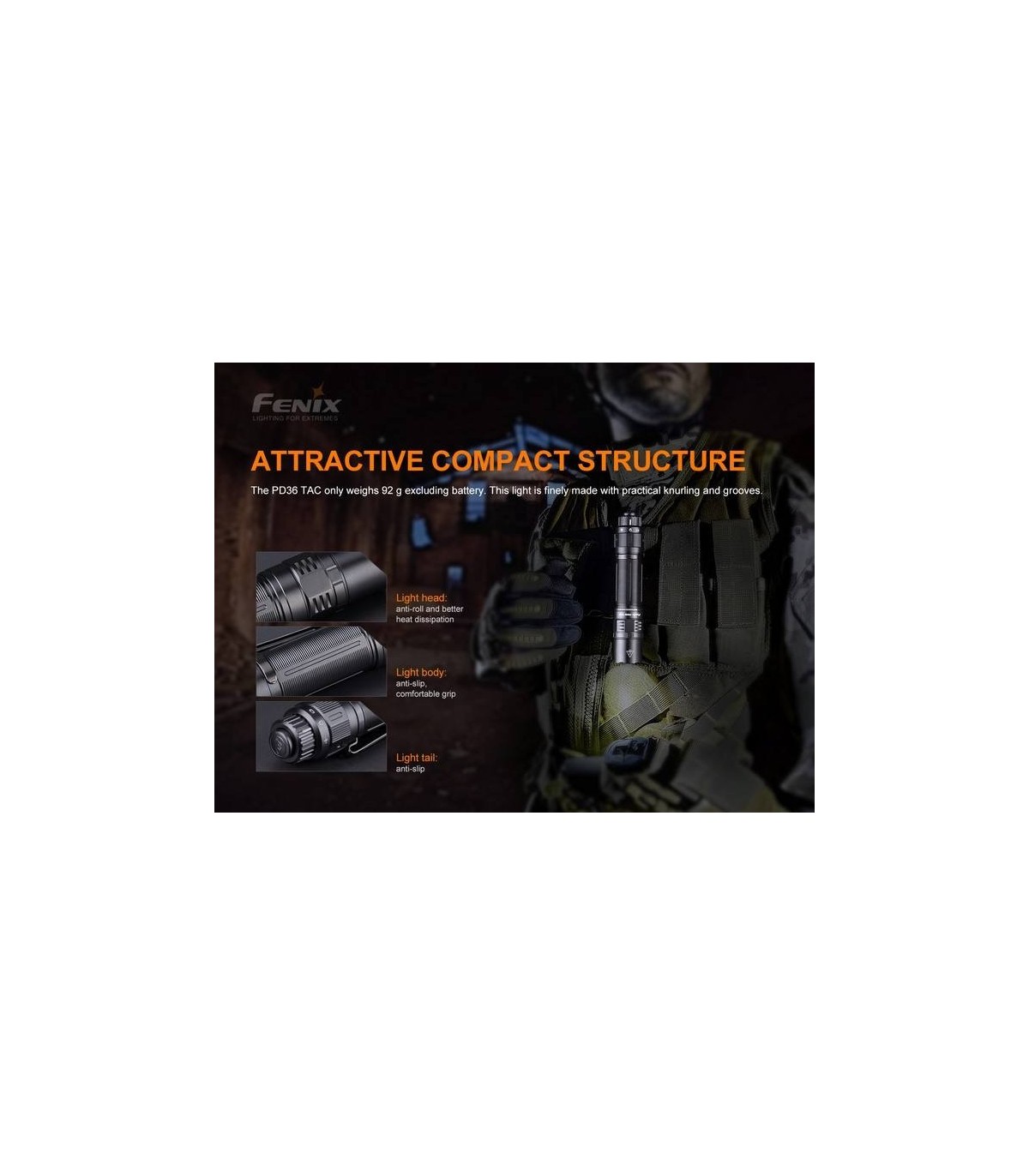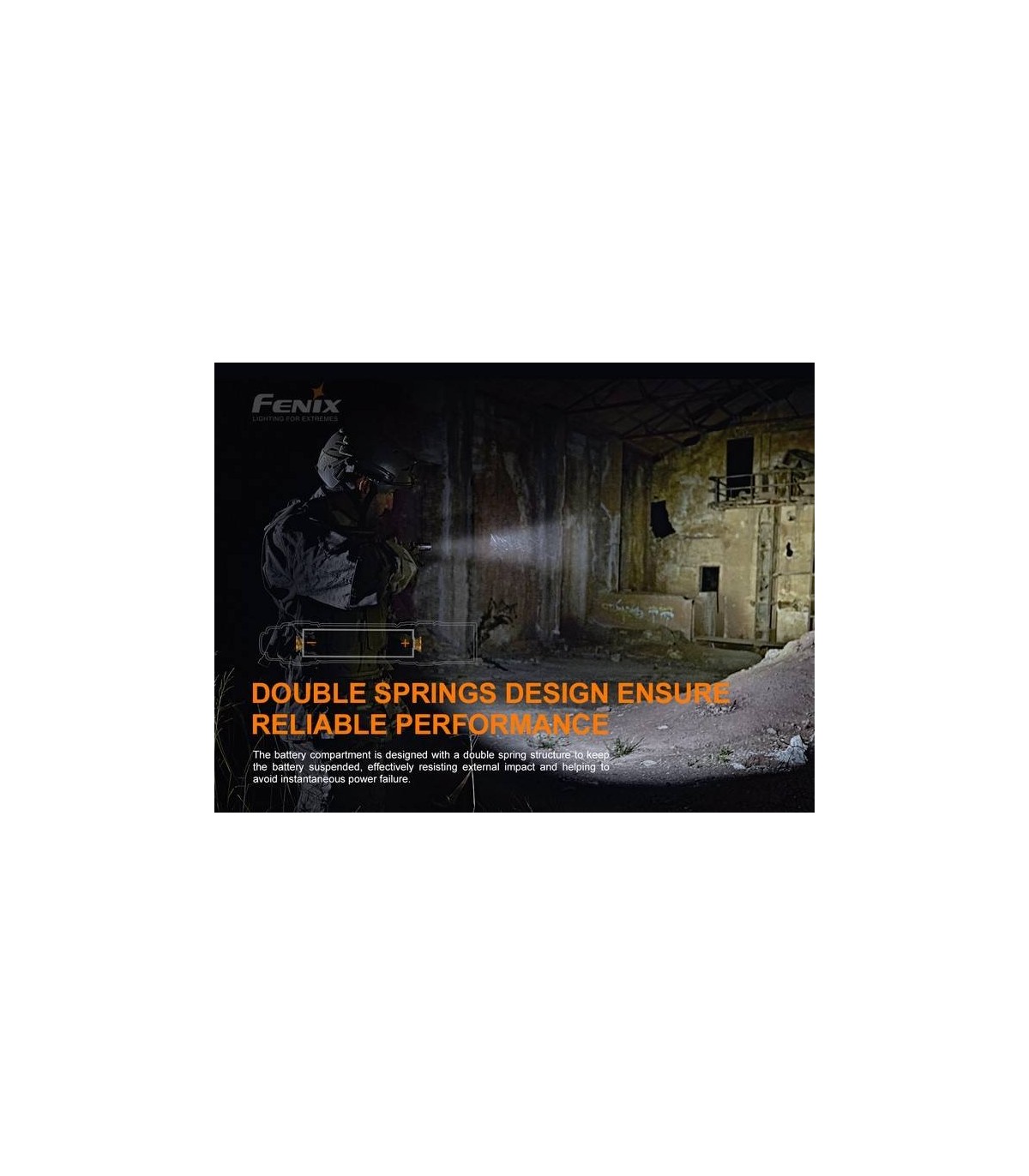 Fenix diseñó esta luz con resortes dobles para mantener la batería suspendida, lo que permite que la batería resista los daños causados por impactos externos. La propia linterna PD36 TAC también es resistente a impactos de hasta 1,5 metros.