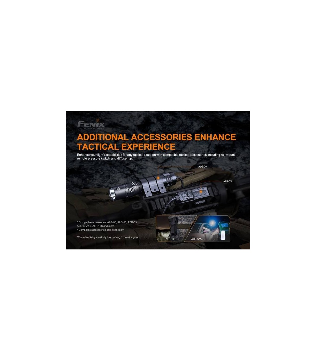 Lo último que queremos comentar es la compatibilidad con algunos accesorios indispensables para ciertas actividades profesionales. La PD36TAC es compatible con muchos accesorios que ya están disponibles. Puede emparejar la linterna PD36TAC con el soporte para pistola Fenix ALG-00 o el ALG-18. Si está buscando un control remoto, el AER-05 es el accesorio perfecto.