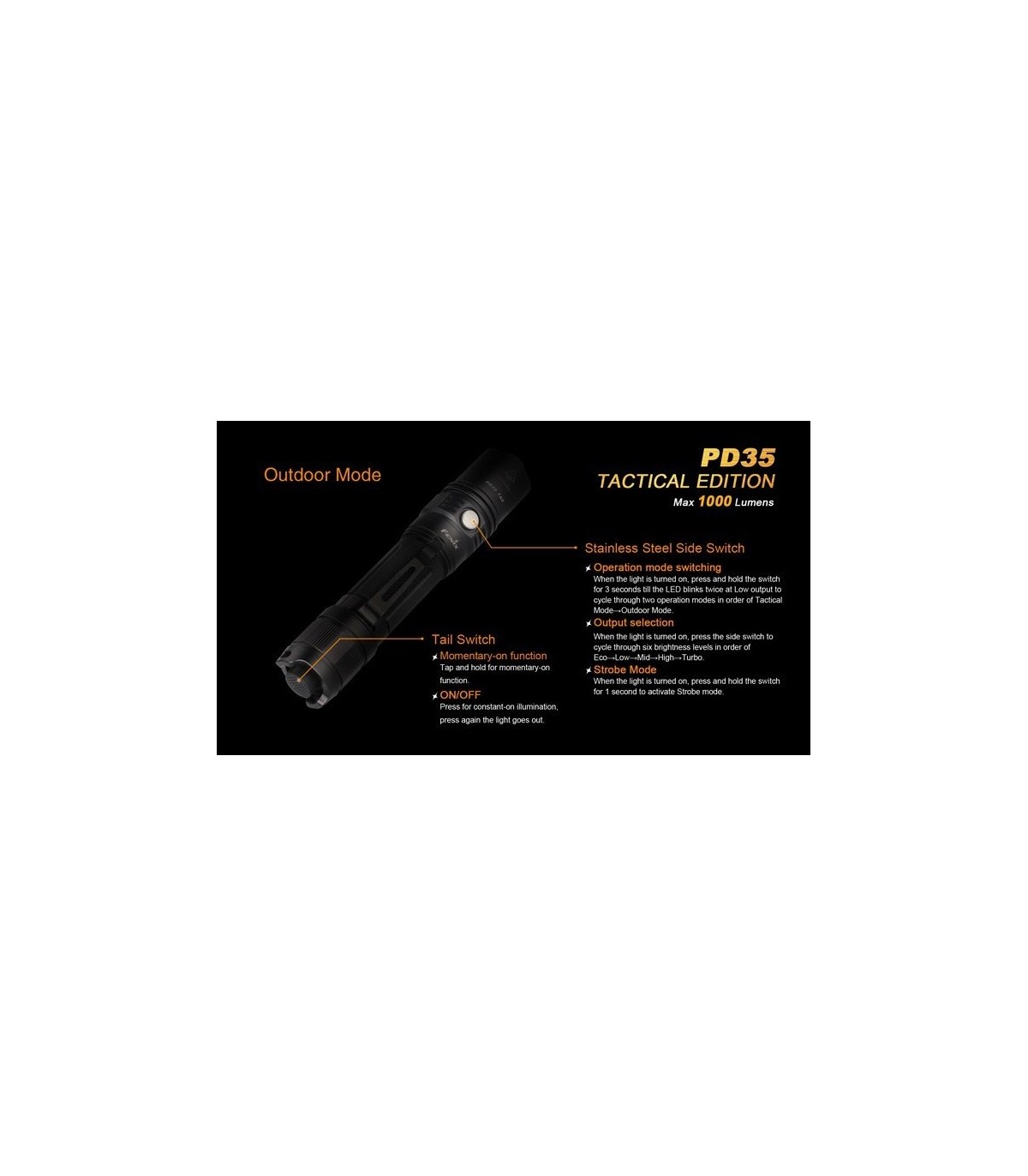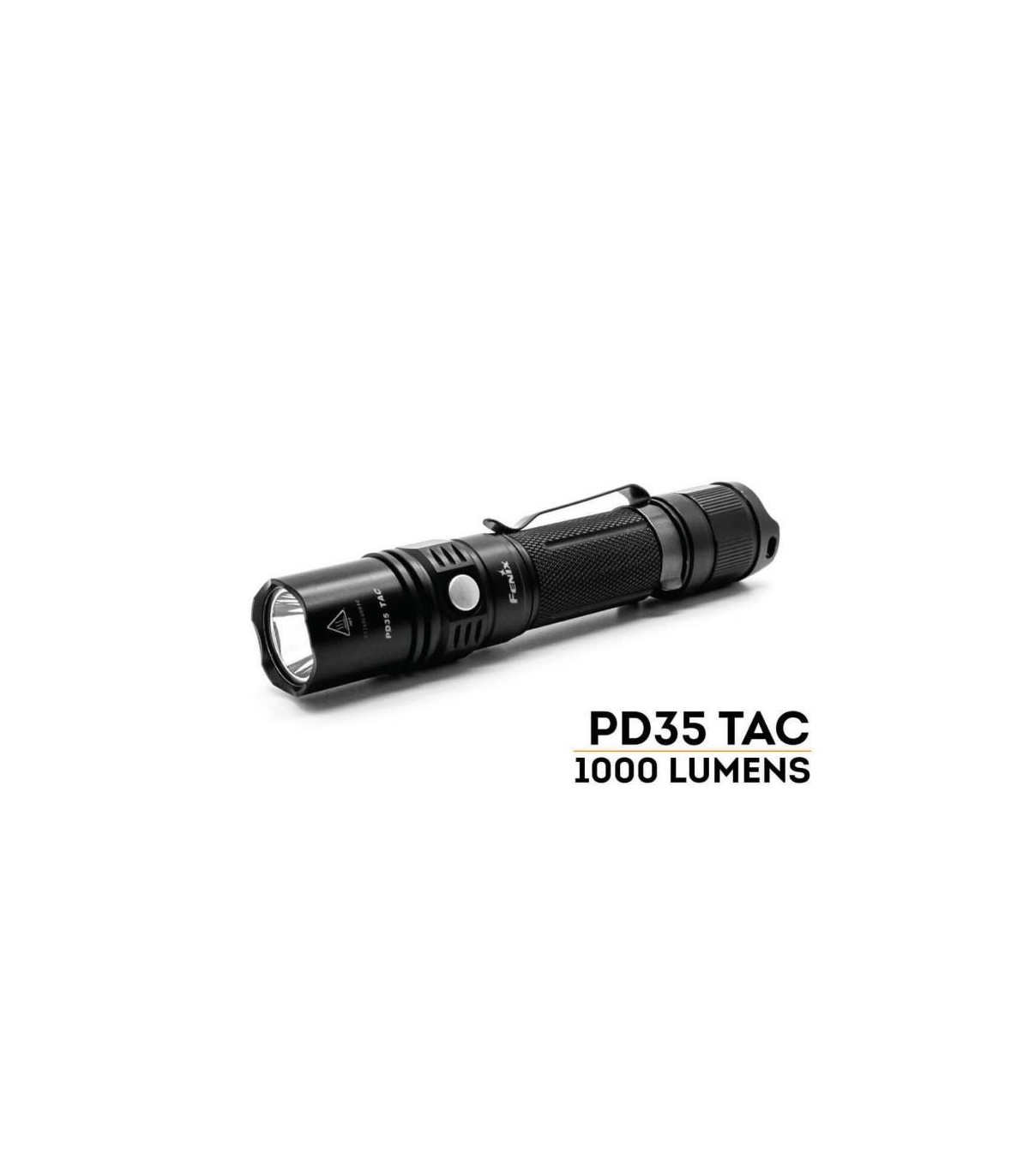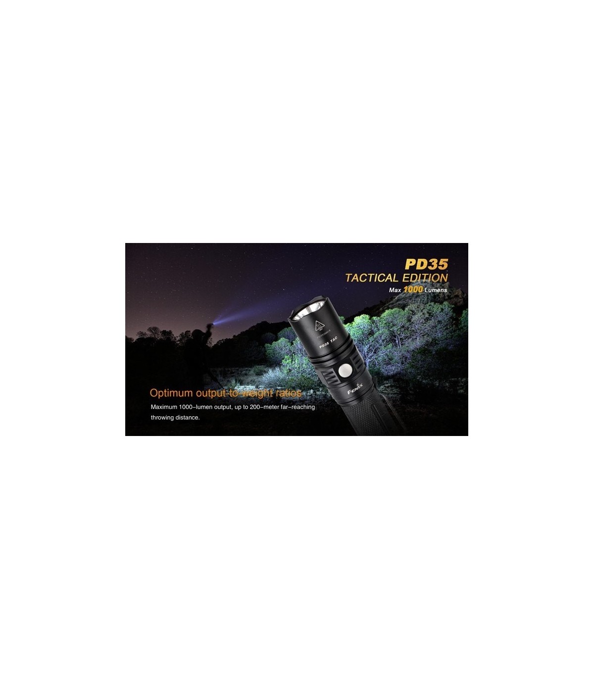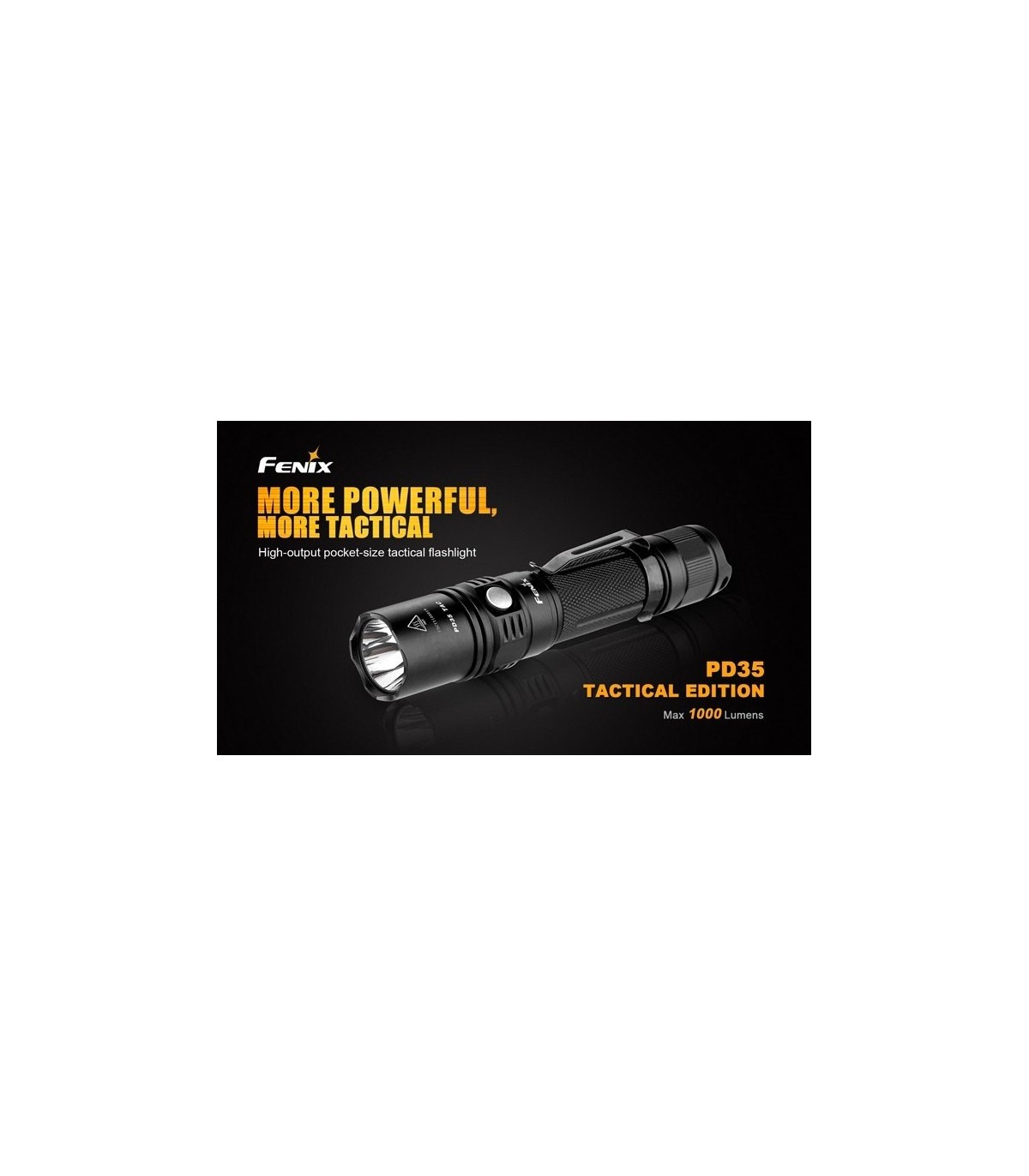 La linterna Fénix PD35 TAC (Edición táctica), tiene un tamaño de bolsillo pero un gran rendimiento y un enfoque táctico. Midiendo menos de 14 cm de largo, la PD35TAC cuenta con una potencia de hasta 1.000 lúmenes y 200 metros de distancia. Ofrece 6 modos de salida. Sin embargo, el modo táctico permite a la PD35 TAC una operación muy fácil, intuitiva y rápida