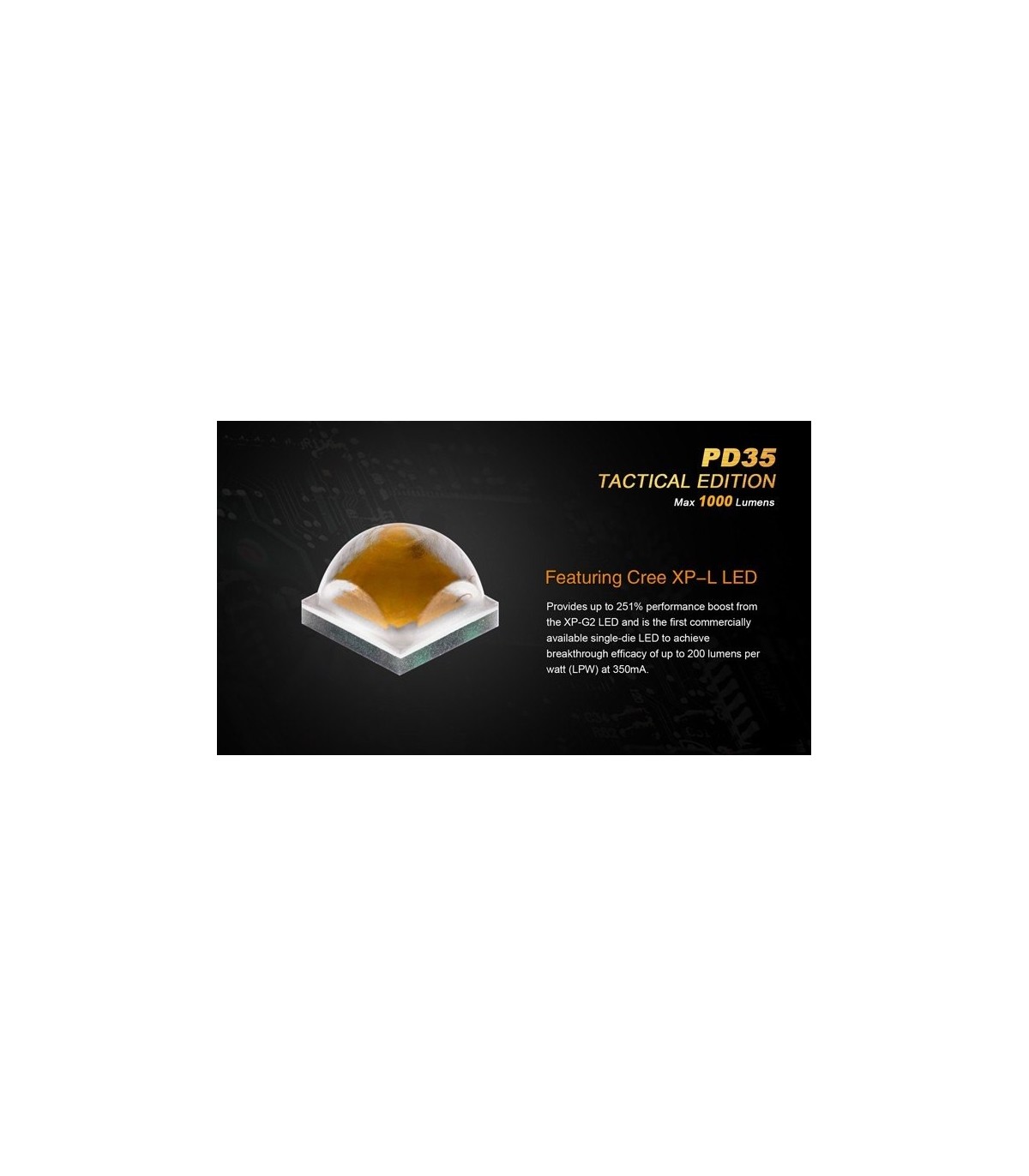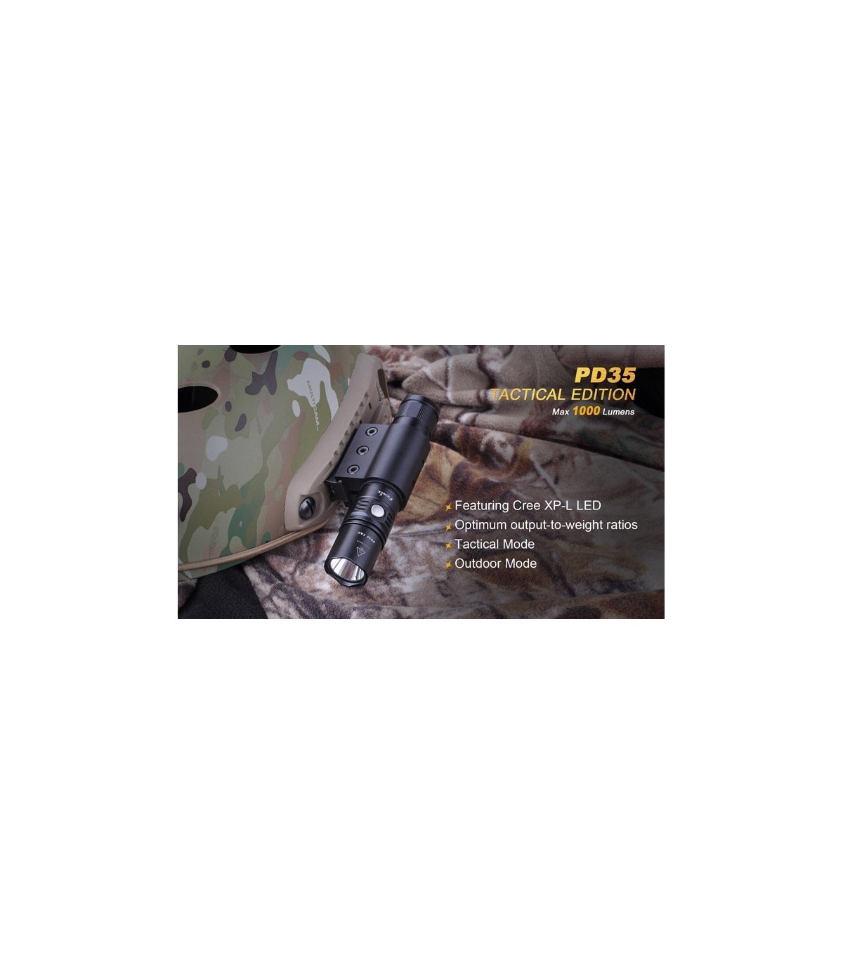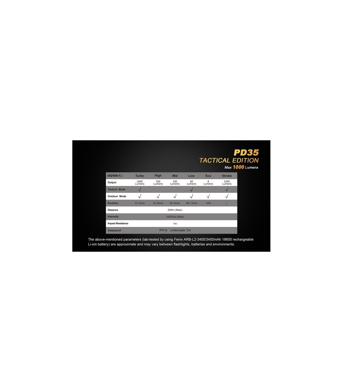 La linterna Fénix PD35 TAC (Edición táctica), tiene un tamaño de bolsillo pero un gran rendimiento y un enfoque táctico. Midiendo menos de 14 cm de largo, la PD35TAC cuenta con una potencia de hasta 1.000 lúmenes y 200 metros de distancia. Ofrece 6 modos de salida. Sin embargo, el modo táctico permite a la PD35 TAC una operación muy fácil, intuitiva y rápida