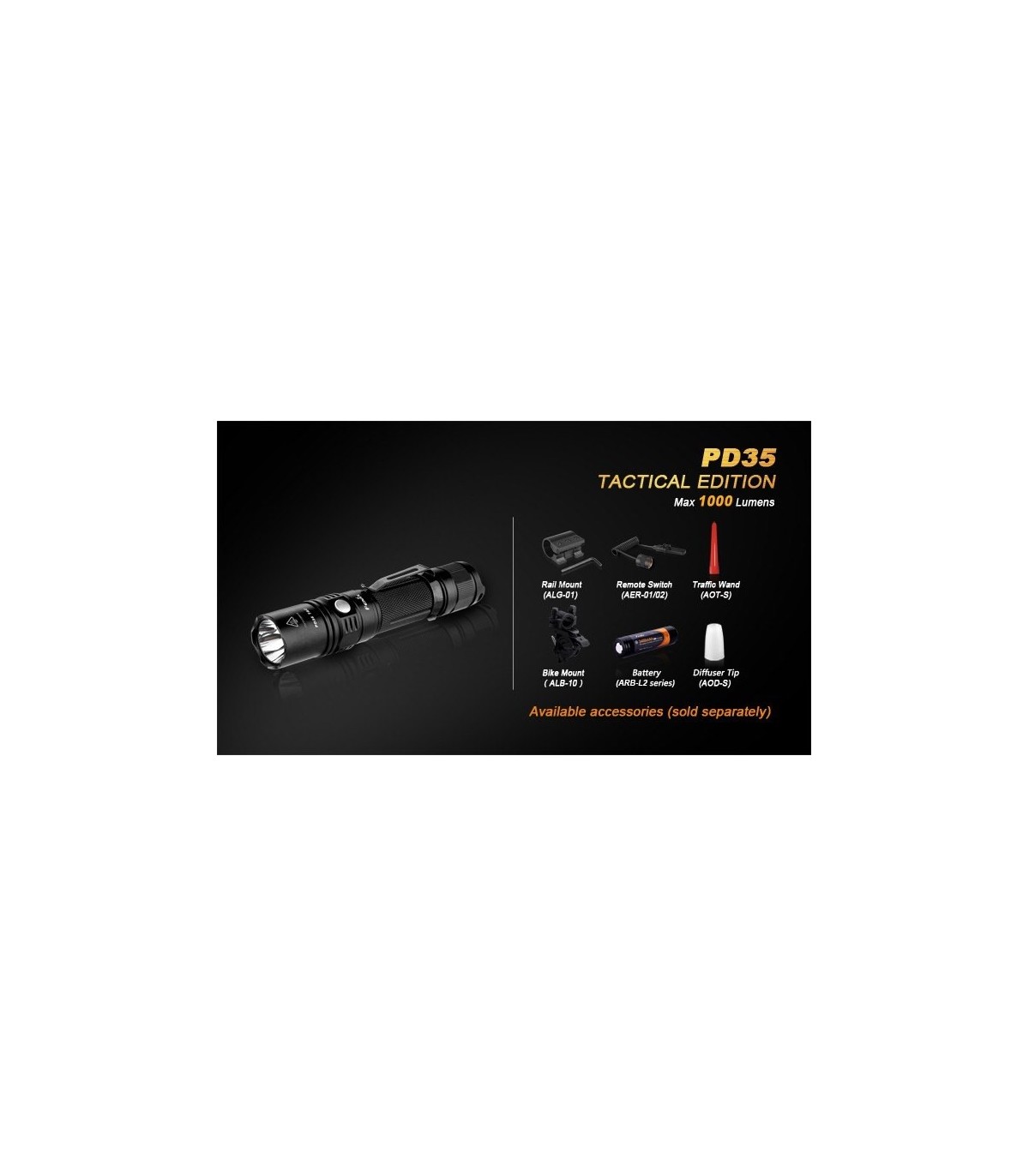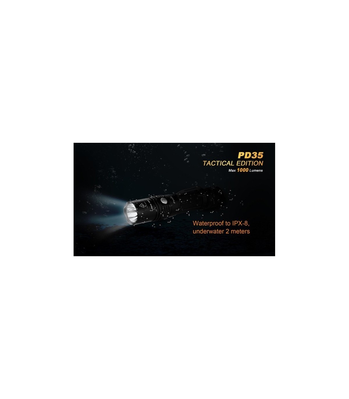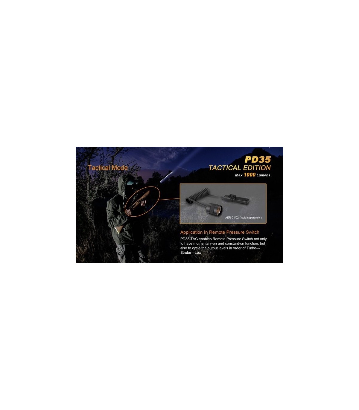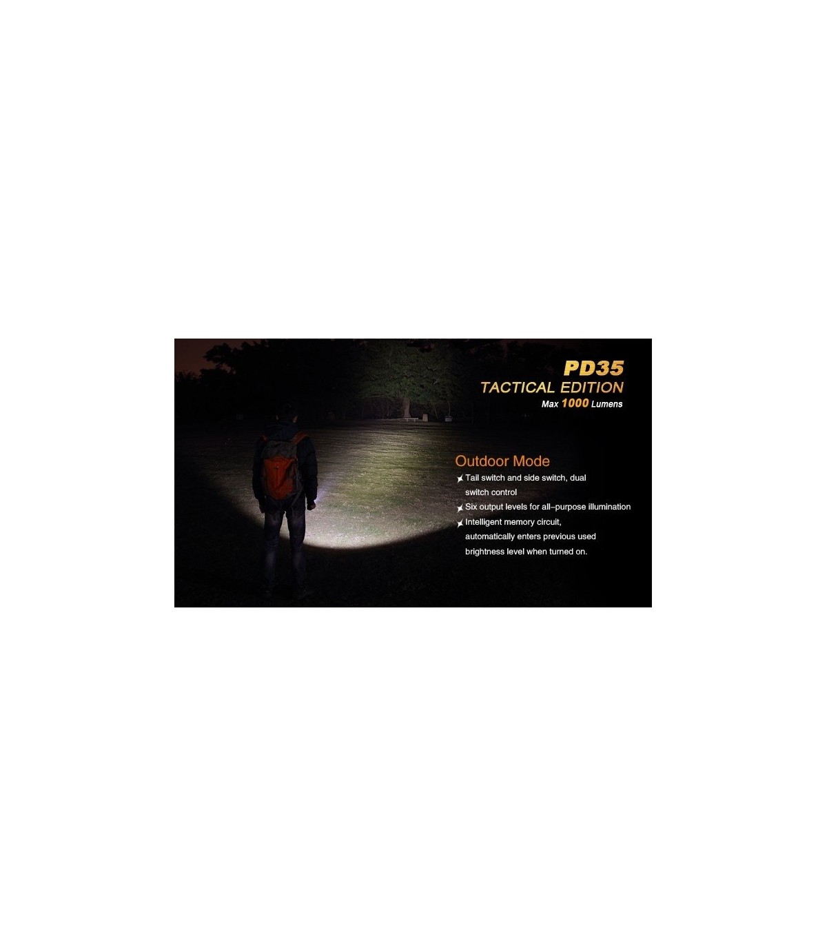 La linterna Fénix PD35 TAC (Edición táctica), tiene un tamaño de bolsillo pero un gran rendimiento y un enfoque táctico. Midiendo menos de 14 cm de largo, la PD35TAC cuenta con una potencia de hasta 1.000 lúmenes y 200 metros de distancia. Ofrece 6 modos de salida. Sin embargo, el modo táctico permite a la PD35 TAC una operación muy fácil, intuitiva y rápida