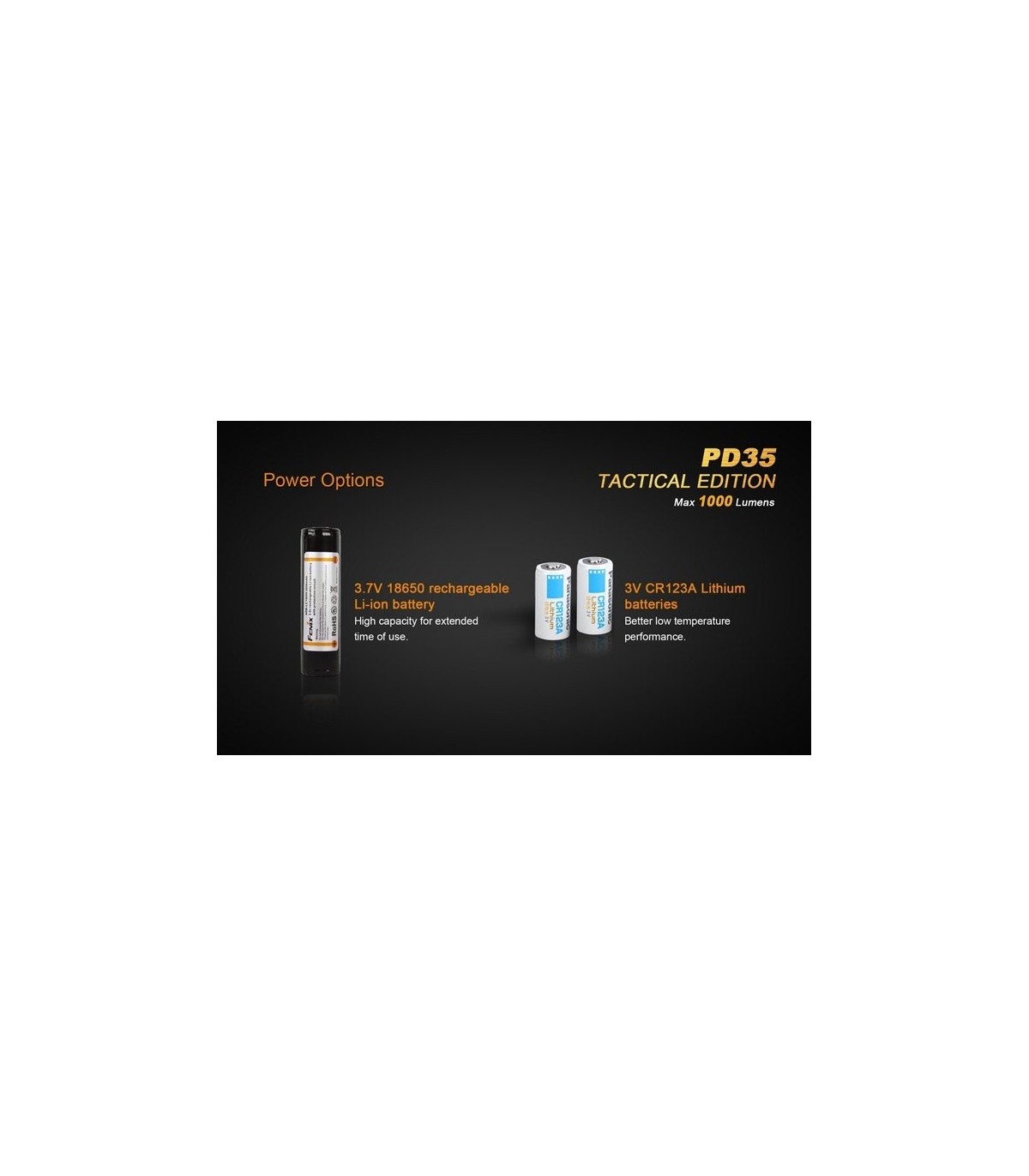 • Alimentada por una batería recargable 18650 de Ion-Litio o dos baterías 3V CR123A de litio