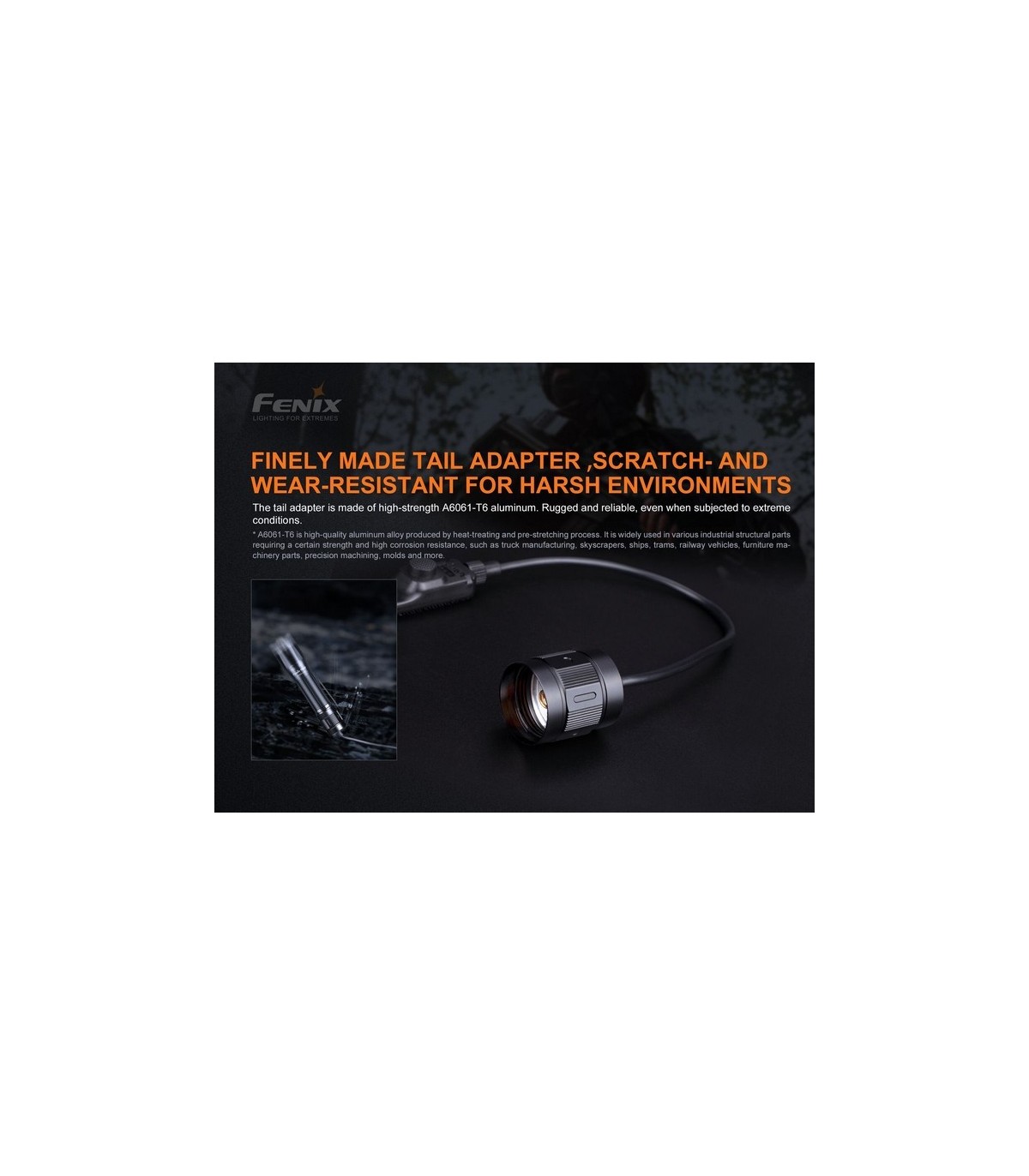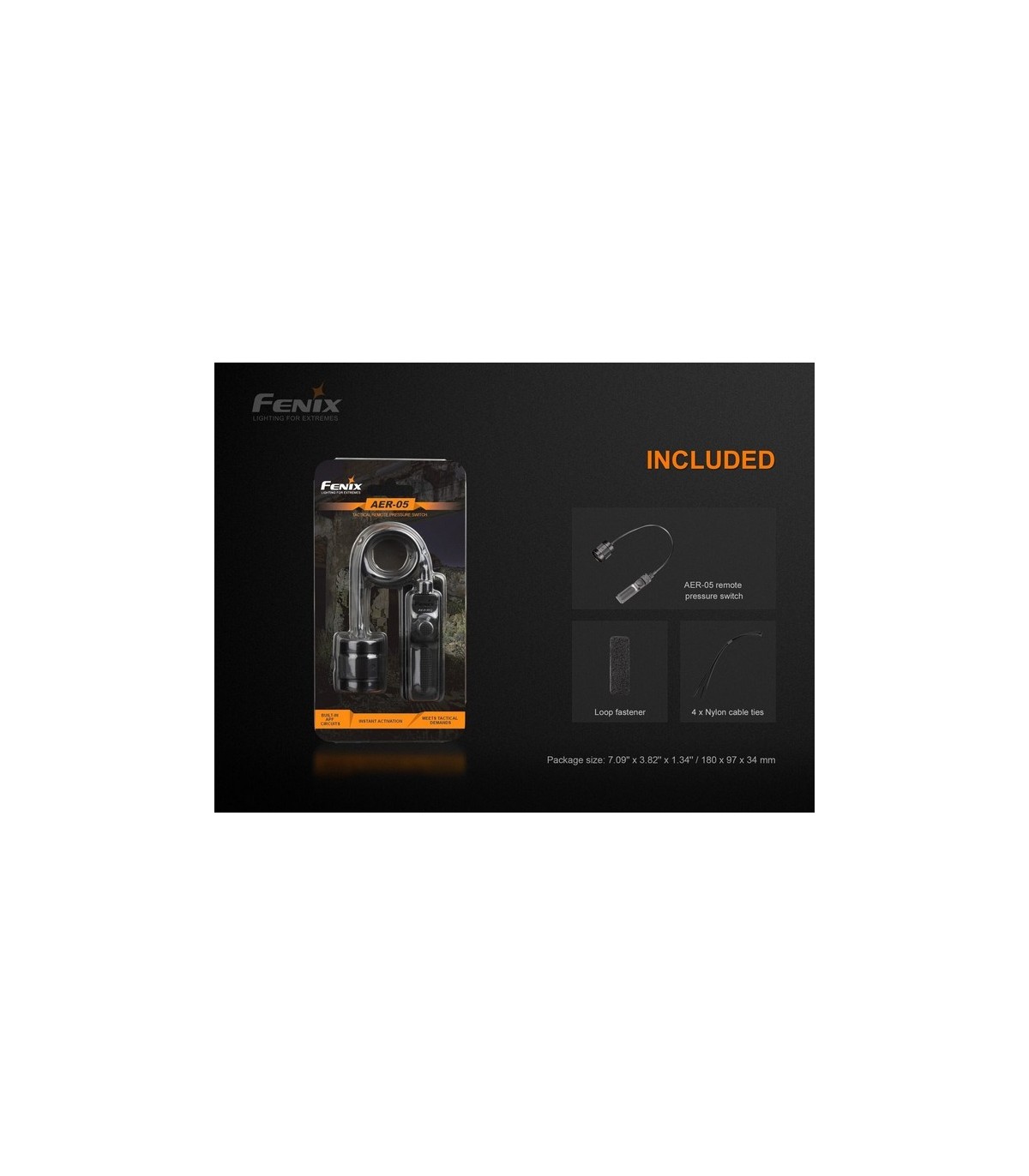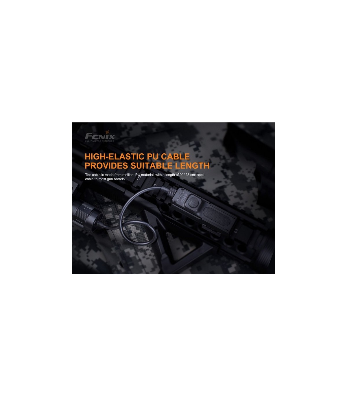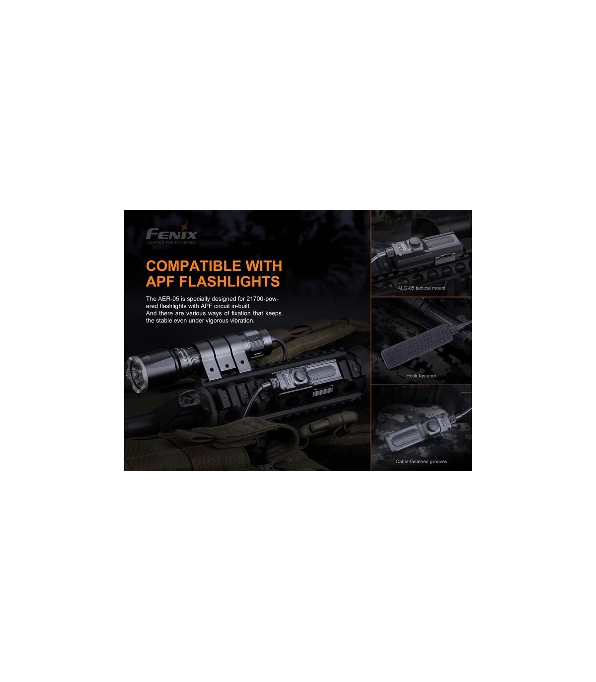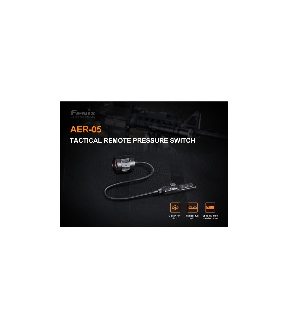 El interruptor remoto Fenix AER-05 está especialmente diseñado para las linternas tácticas con circuitos APF. Su adaptador de cola está fabricado en aluminio A6061-T6 con acabado anodizado duro tipo III y antiabrasivo. El panel doble de interruptores de cola incluye un interruptor con una almohadilla de presión silenciosa y un interruptor táctico redondo; permitiendo una operación fácil y rápida de iluminación momentánea o constante. El innovador diseño sin ruido (mute) con velcro adjunto lo hace muy confiable y práctico en sus misiones tácticas o de caza donde el silencio es imprescindible.