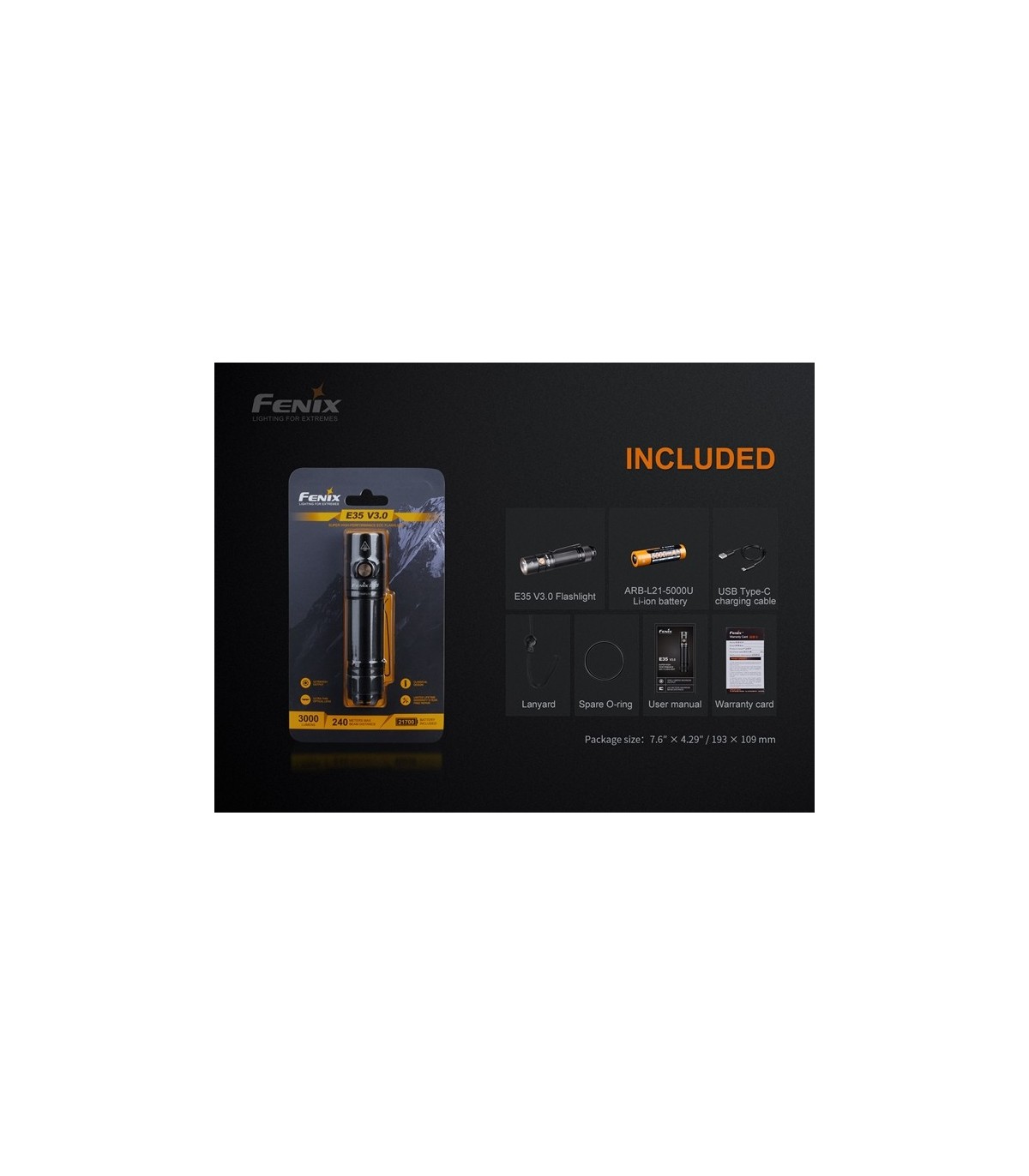 Incluye: Linterna E35-V3.0, correa, batería de ion litio 21700 de 5000 mAh (recargable por micro USB tipo C), cable para la carga Tipo C, O-ring, garantía e instrucciones.