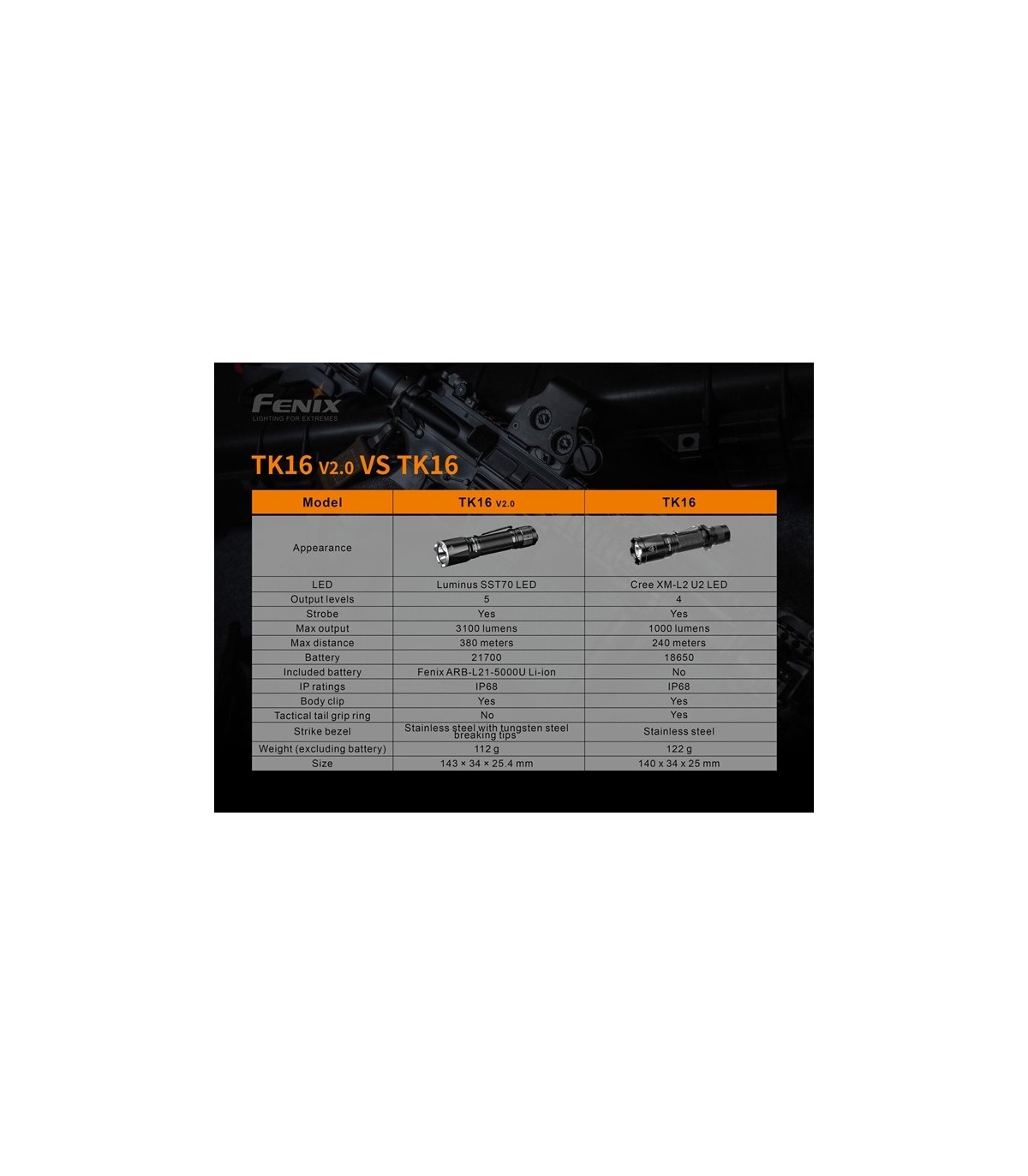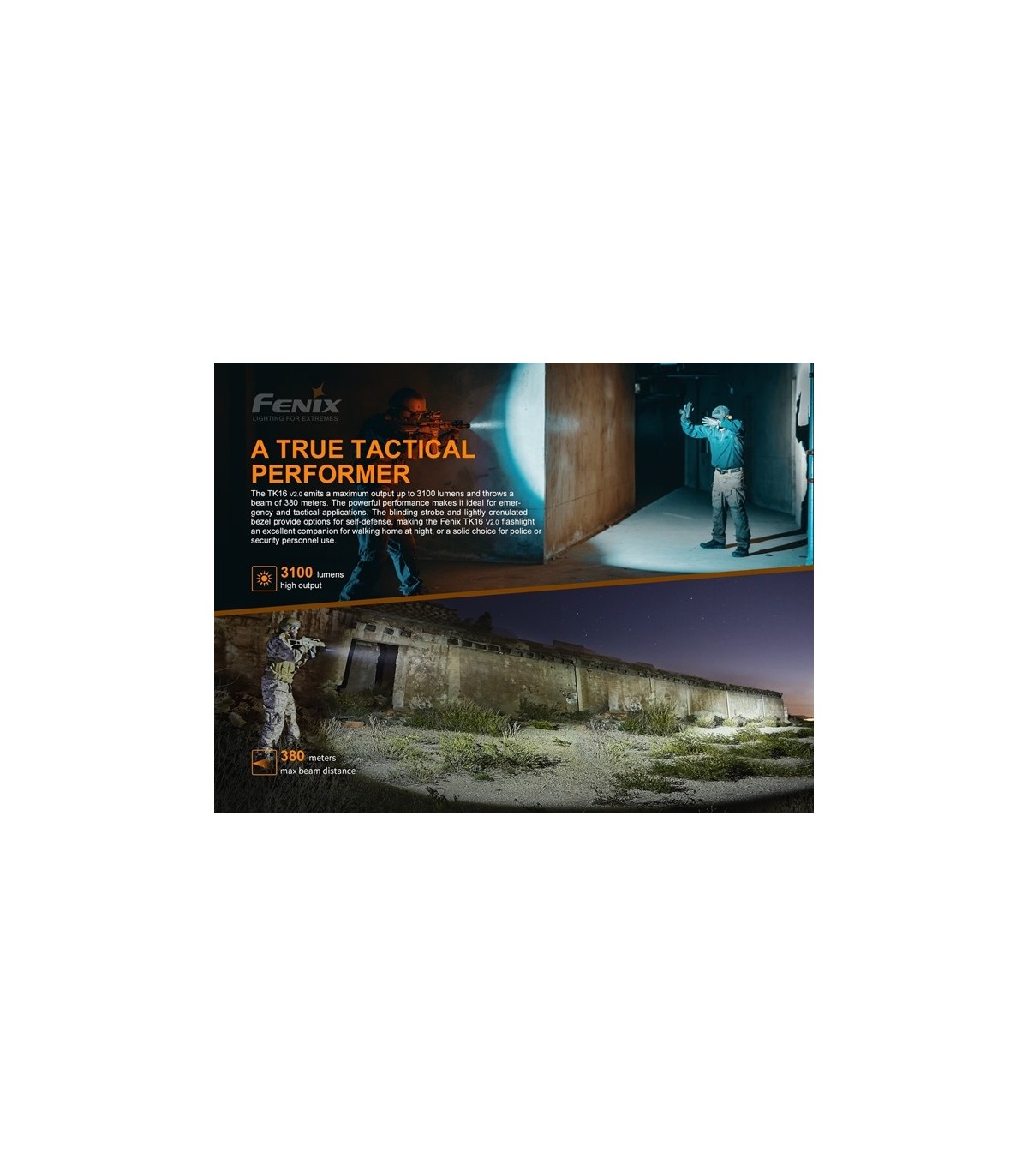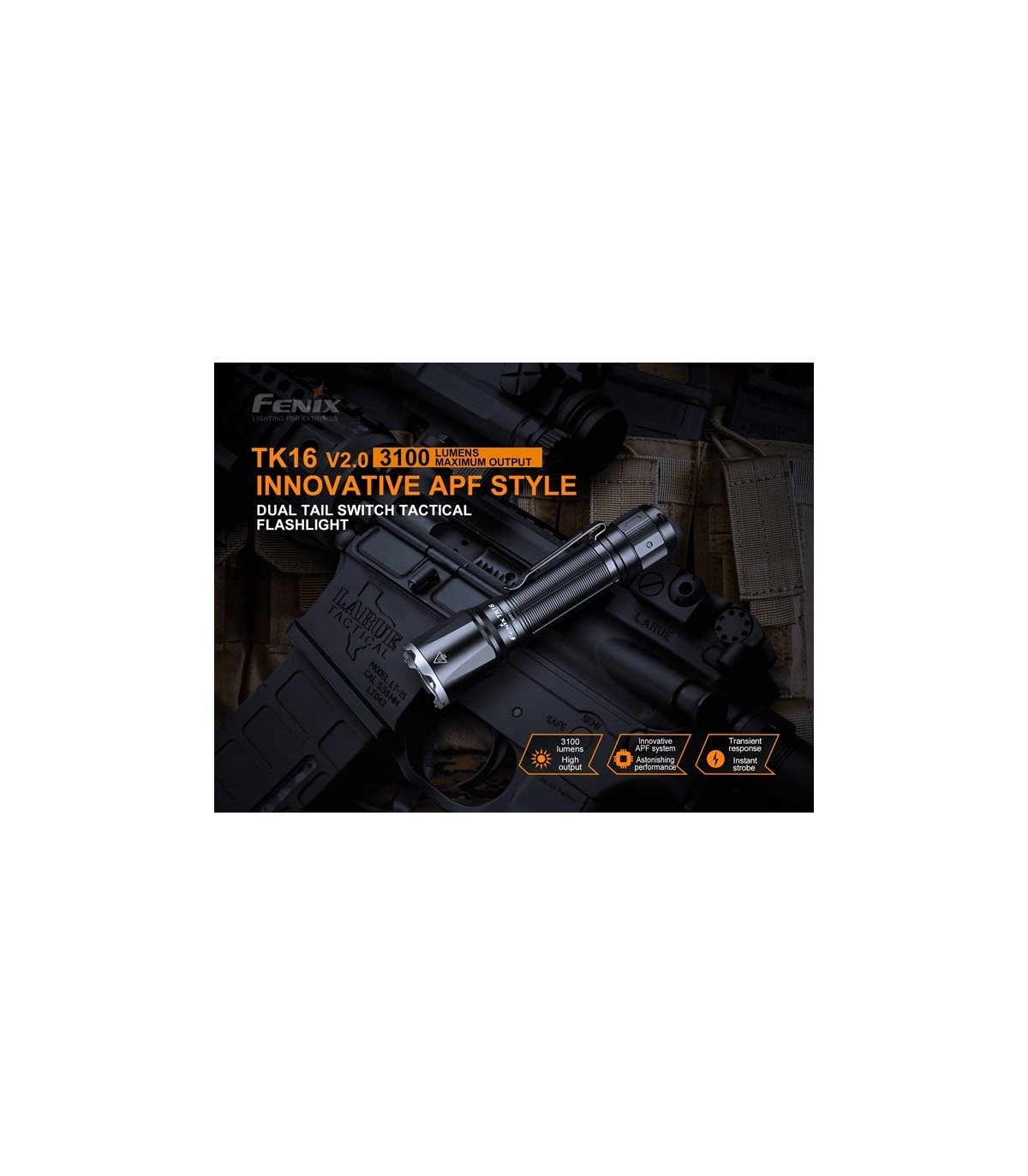 La linterna Fenix TK16 V2.0 ofrece funcionalidad y rendimiento, es una gran herramienta confiable y necesaria para aplicaciones tácticas y de emergencia. Con un led Luminus SST70 LED y una batería ARB-L21-5000U incluida, esta luz táctica emite una salida máxima de hasta 3100 lúmenes y arroja una distancia de haz de 380 metros. El APF (sistema avanzado de transmisión de frecuencia de pulso) es único en Fenix y hace que la estructura y la capacidad tácticas sean más compactas. La TK16 V2.0 tiene un interruptor trasero táctico dual para activación instantánea y luz estroboscópica; fácil de usar con una mano para situaciones tácticas. El cuerpo compacto con bisel de acero inoxidable tiene un diseño perfecto para las fuerzas del orden, la seguridad y la defensa.