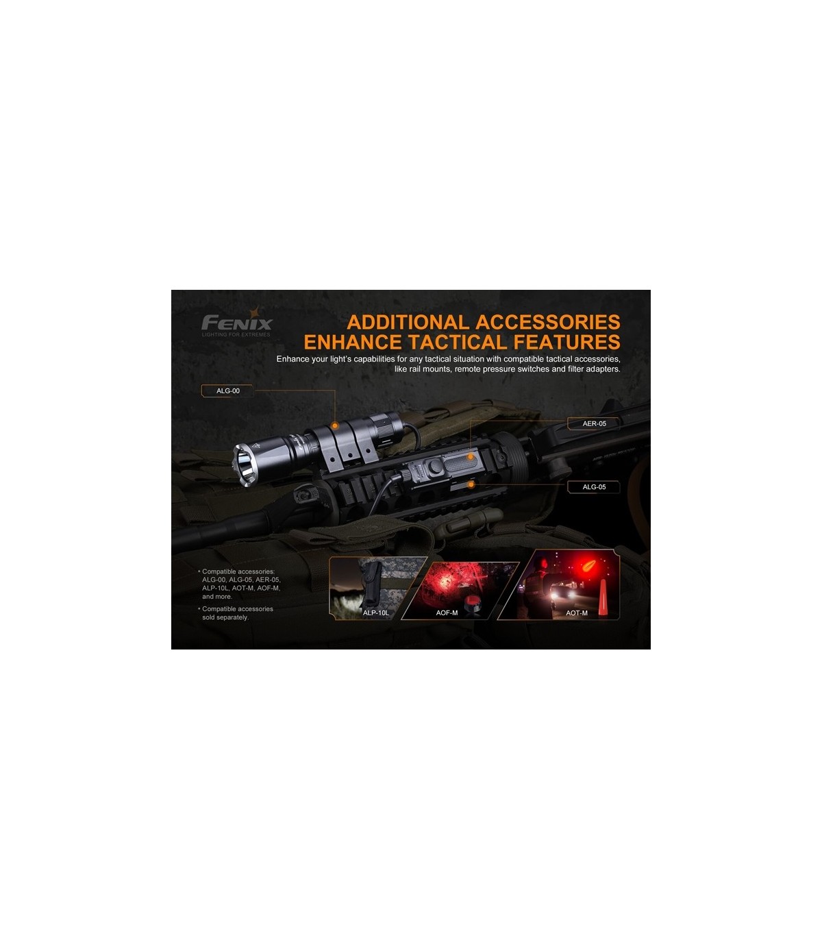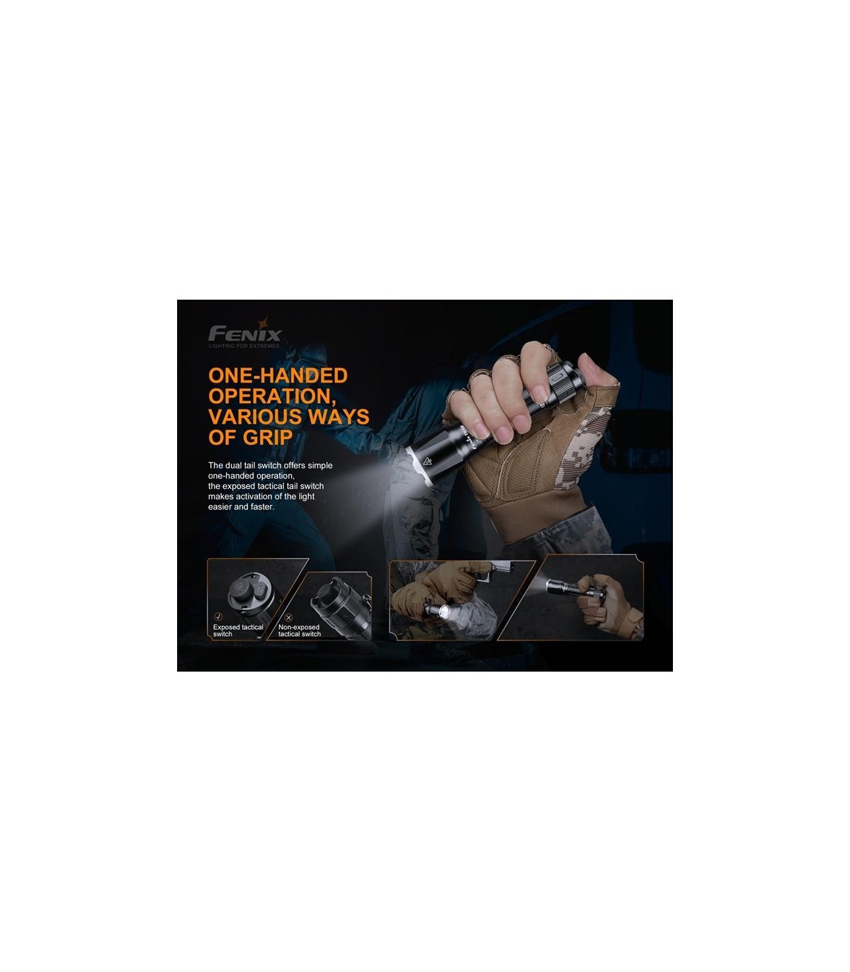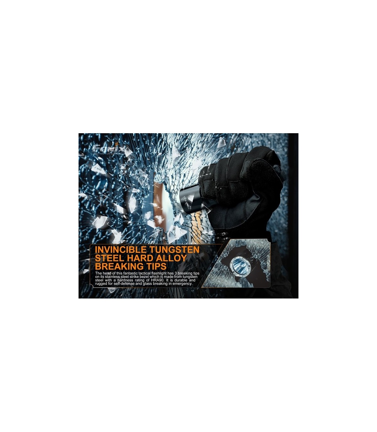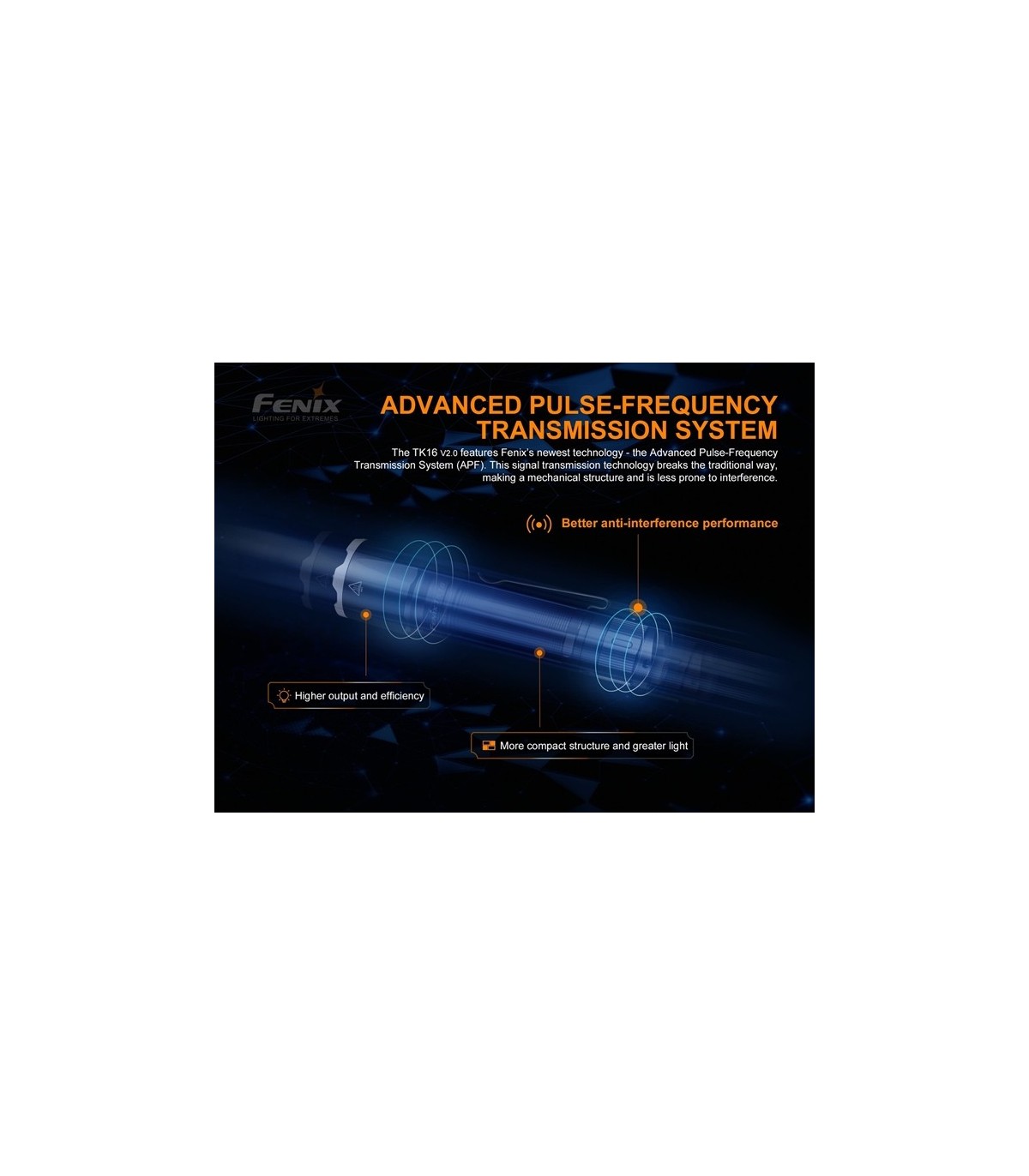 La linterna Fenix TK16 V2.0 ofrece funcionalidad y rendimiento, es una gran herramienta confiable y necesaria para aplicaciones tácticas y de emergencia. Con un led Luminus SST70 LED y una batería ARB-L21-5000U incluida, esta luz táctica emite una salida máxima de hasta 3100 lúmenes y arroja una distancia de haz de 380 metros. El APF (sistema avanzado de transmisión de frecuencia de pulso) es único en Fenix y hace que la estructura y la capacidad tácticas sean más compactas. La TK16 V2.0 tiene un interruptor trasero táctico dual para activación instantánea y luz estroboscópica; fácil de usar con una mano para situaciones tácticas. El cuerpo compacto con bisel de acero inoxidable tiene un diseño perfecto para las fuerzas del orden, la seguridad y la defensa.