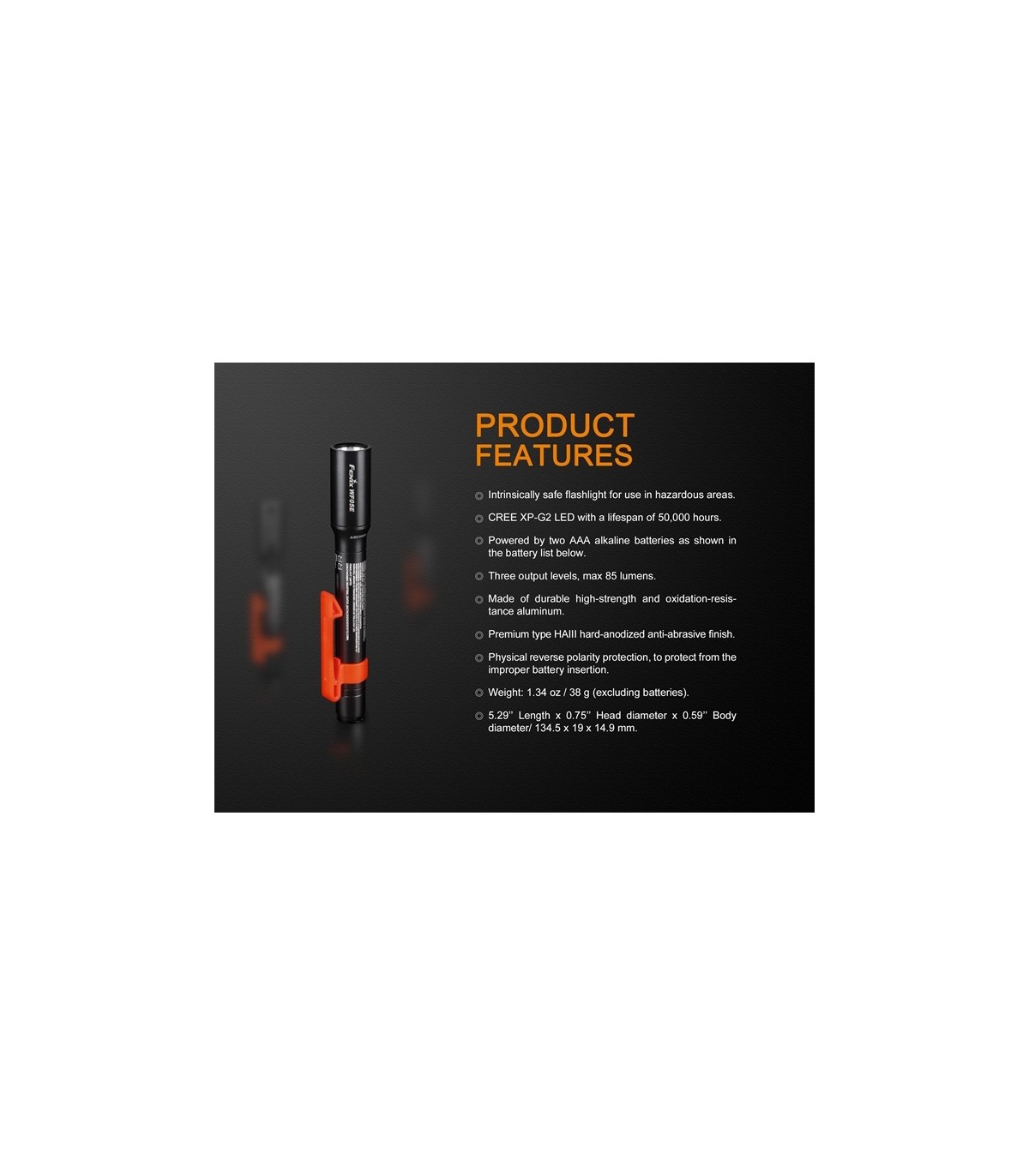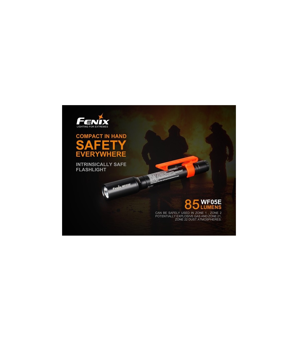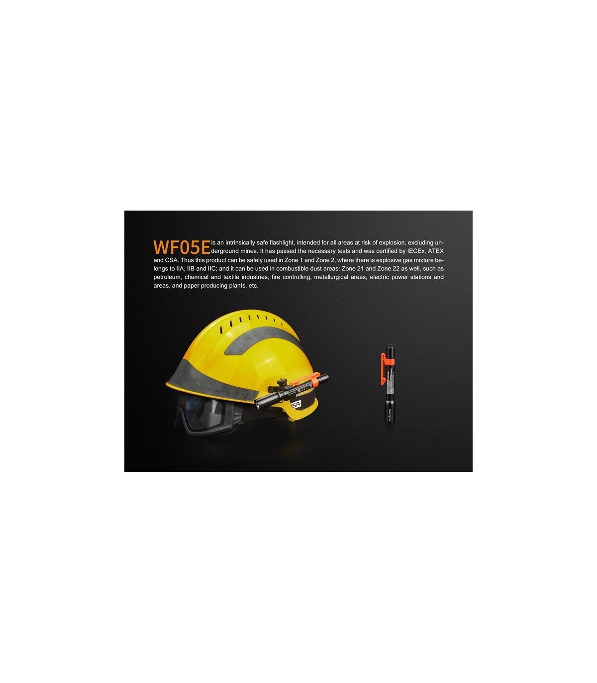 La linterna Fenix WF05E es una linterna intrínsecamente segura, diseñada para todas las áreas con riesgo de explosión, excluyendo las minas subterráneas. Ha pasado las pruebas necesarias y está certificado por IECEx, ATEX y CSA. Por lo tanto, este producto se puede usar de manera segura en la Zona 1 y en la Zona 2, donde hay una mezcla de gases explosivos que pertenece a IIA, IIB y IIC; y se puede usar en áreas de polvo combustible: la Zona 21 y la Zona 22 también, como industrias petroleras, químicas y textiles, control de incendios, áreas metalúrgicas, estaciones y áreas de energía eléctrica, y plantas productoras de papel, etc.
