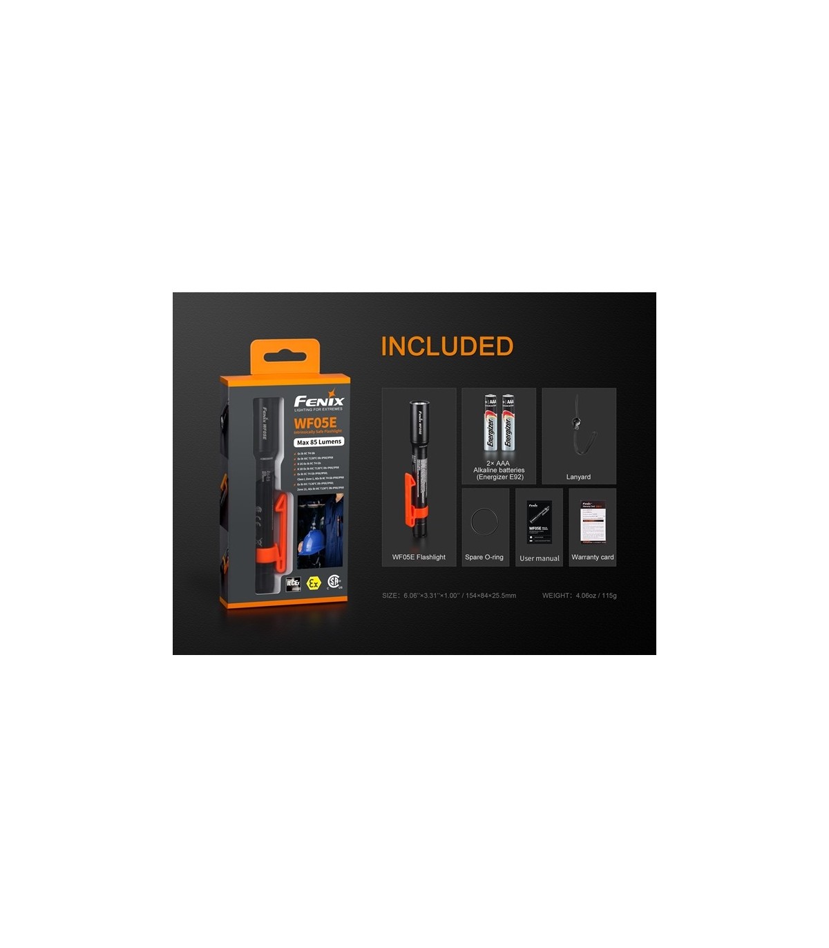 Incluye: Linterna WF05, dos pilas AAA, correa, clip sujeción, O-ring de recambio, manual de instrucciones y garantía.