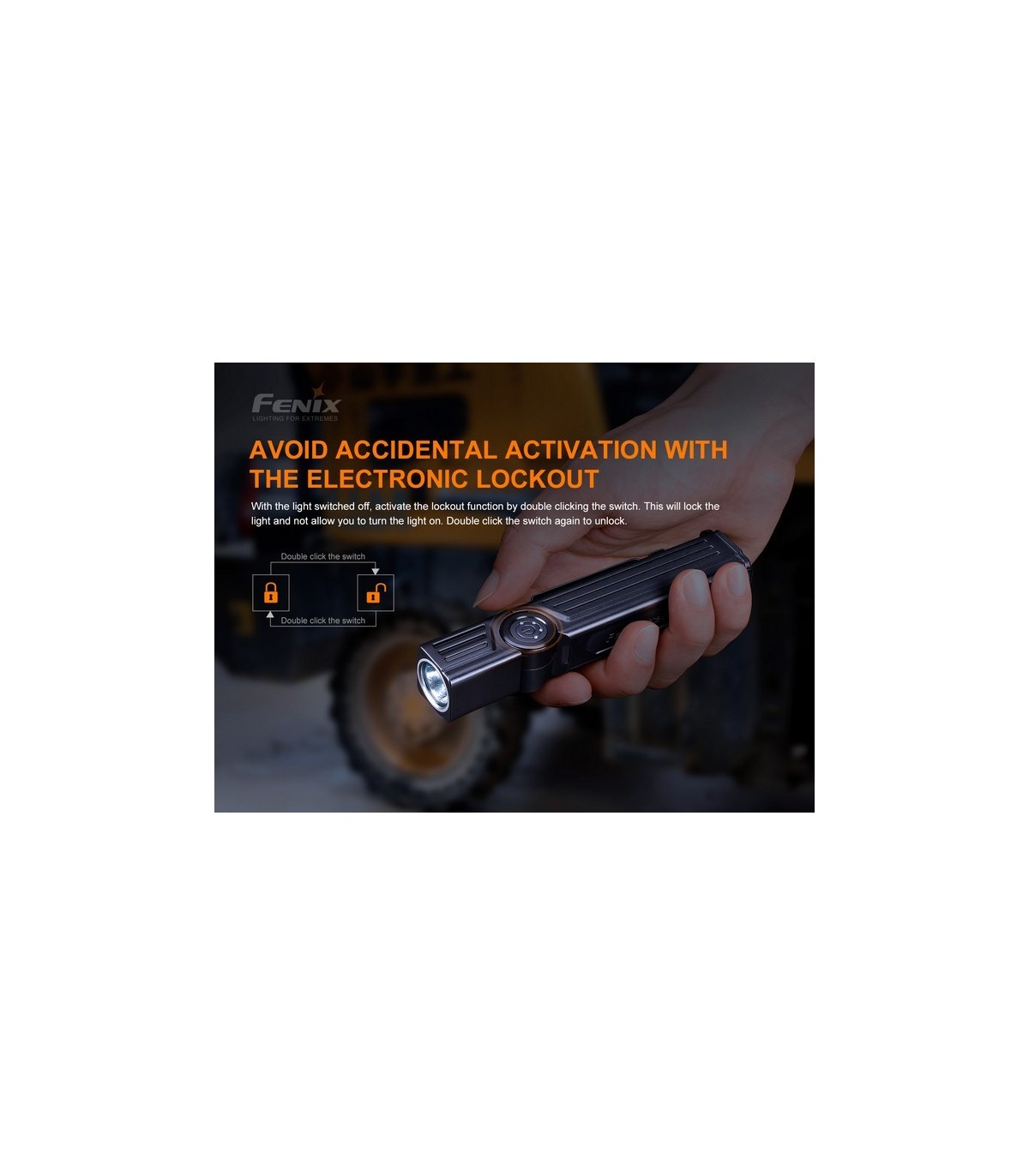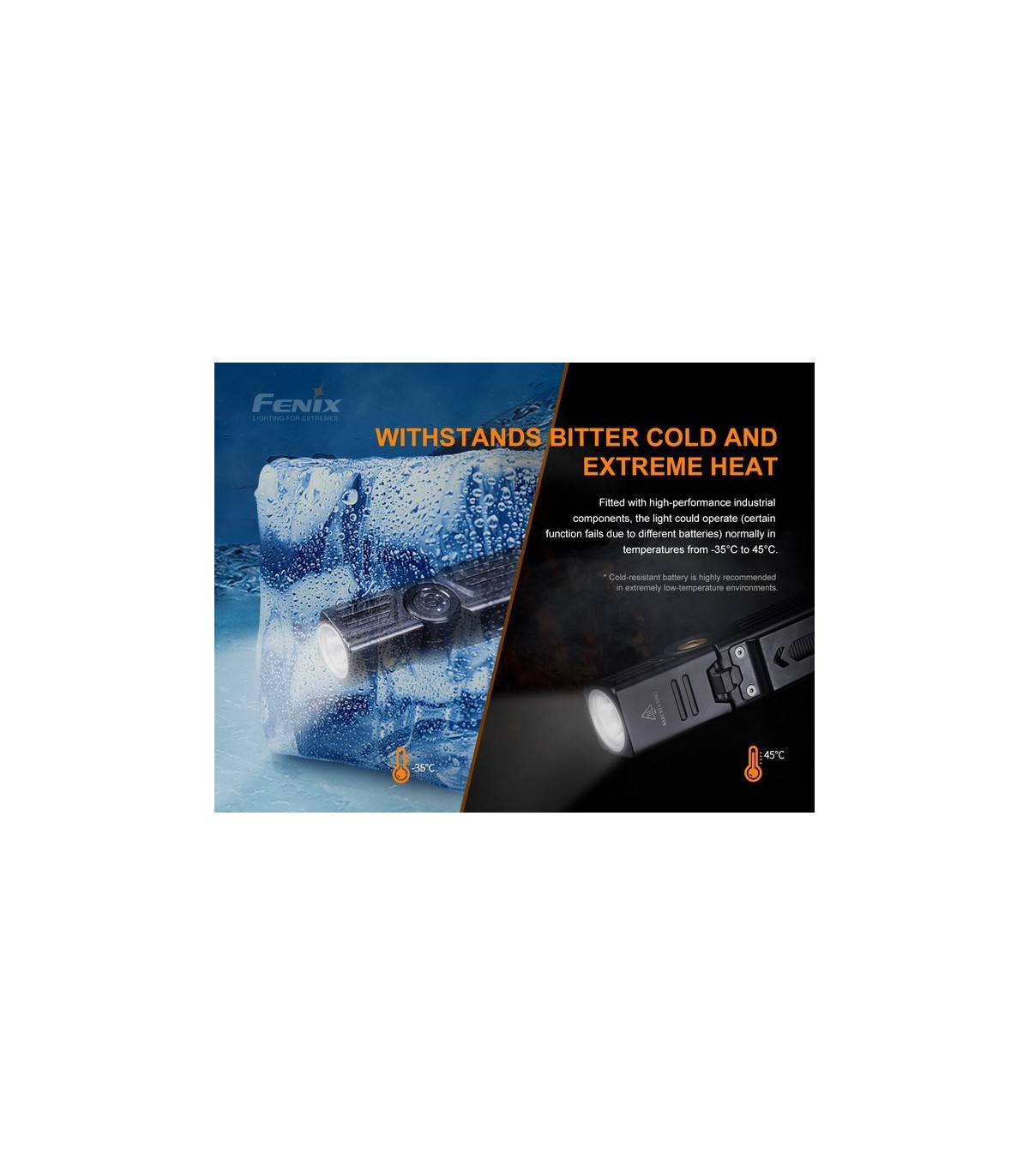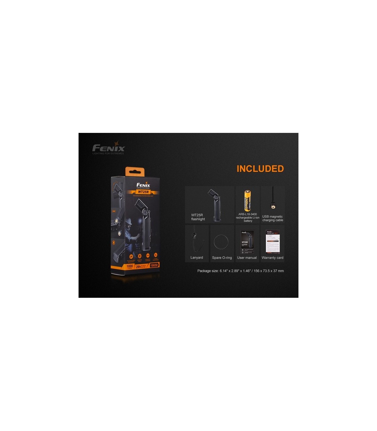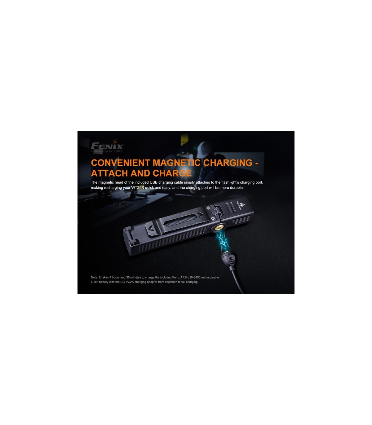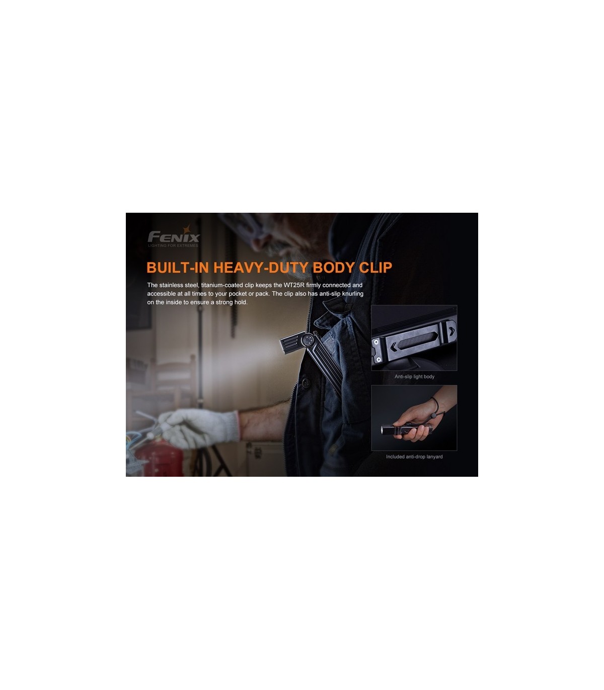 La linterna pivotante recargable Fénix WT25R es una linterna eficaz y multifuncional diseñada específicamente para operaciones y mantenimiento industrial. Lo que hace que la WT25R sea especial es la capacidad de inclinar el cabezal de la linterna hasta 105 °, lo que permite conseguir múltiples direcciones de iluminación. El cabezal pivotante es perfecto para usar con las manos libres; Puede colocar la luz colgada por la base o usar el clip resistente que incorpora en el cuerpo para sostener la linterna en su bolsillo. Una tercera opción es colocar la linterna en una superficie metálica cercana apoyada a través de su base magnética. La Linterna WT25R cuenta con carga magnética e incorpora una batería recargable de iones de litio de 3400 mAh.